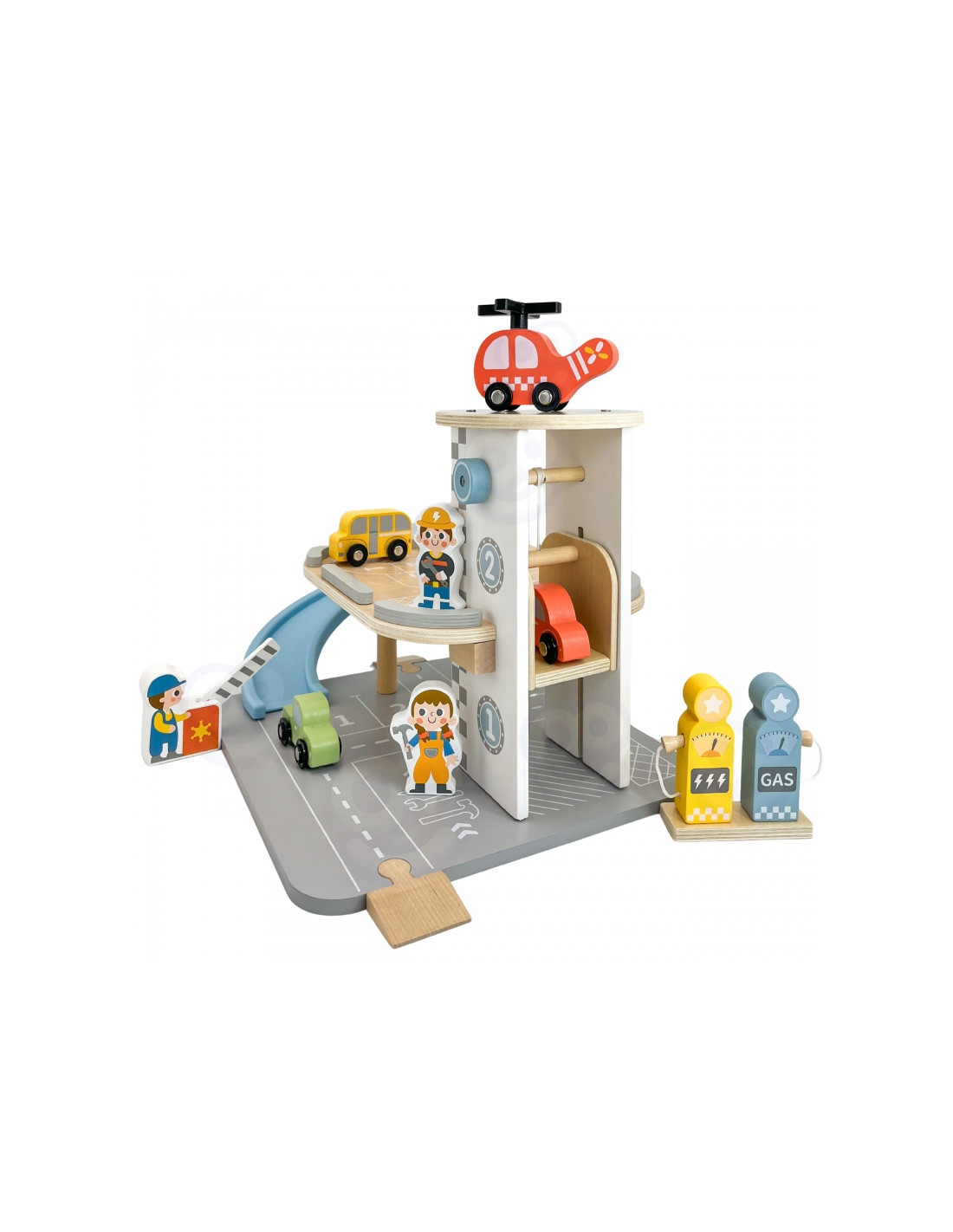 WOOPIE GREEN Drewniany Parking Piętrowy 2w1 Stacja Benzynowa z Autkami i Figurkami 12 el. FSC