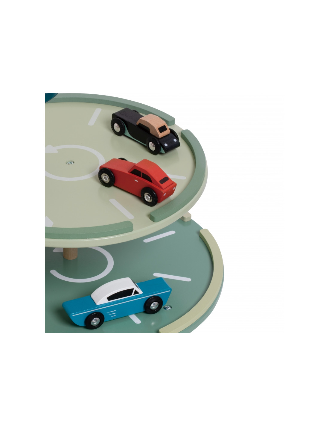 Zainspirowany latami 50-tymi, ten garaż od marki CLASSIC WORLD przypomina złotą erę samochodów! Zabawka oferuje stylowe samochody, myjnię samochodową, dystrybutor paliwa i rampy bioplastowe umożliwiające dojazd na parking. Winda obsługuje wszystkie 3 poziomy i jest zwieńczona platformą, na której znajduje się helikopter. Podstawa wyposażona jest w przyłącza umożliwiające utworzenie toru. Zabawka rozwija umiejętności motoryczne oraz językowe. Zabawa z innymi dziećmi pomaga również w rozwijaniu umiejętności społecznych. Drewno posiada certyfikat FSC, a rampy wykonane są z bioplastiku.