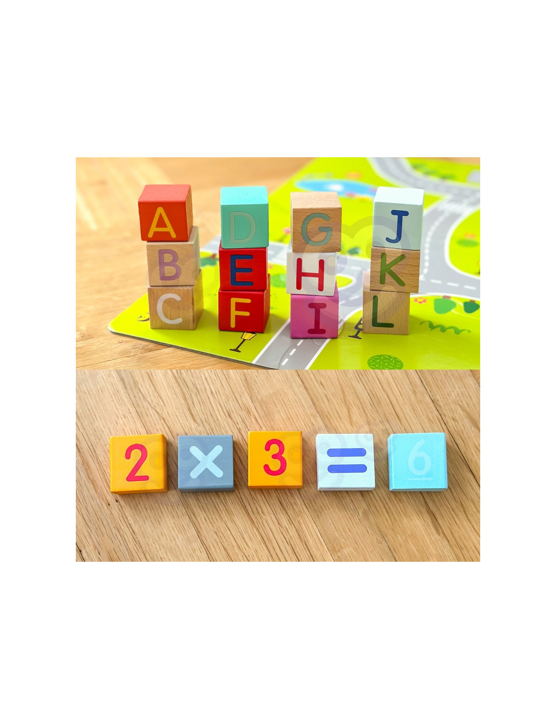 - - 78 drewnianych klocków z dwustronnym nadrukiem do budowania różnych budynków oraz z literkami i cyferkami,