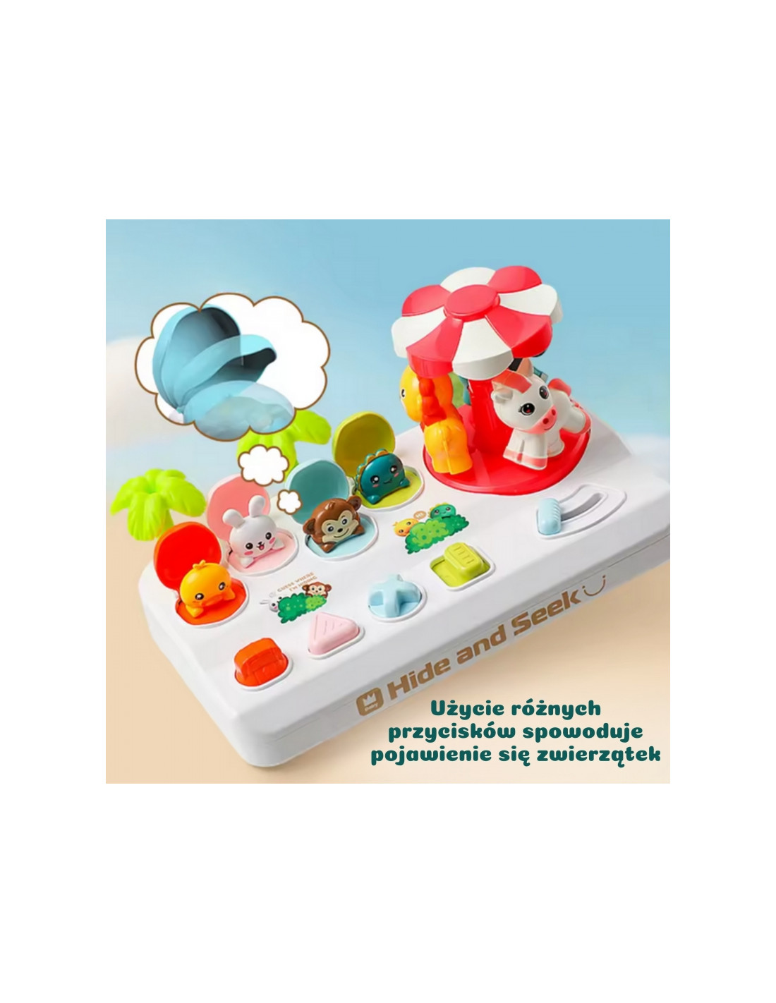 - - Kolorowa, interaktywna zabawa typu „pop-up” – po naciśnięciu, przekręceniu lub przesunięciu przycisku zwierzątko wyskakuje z ukrycia