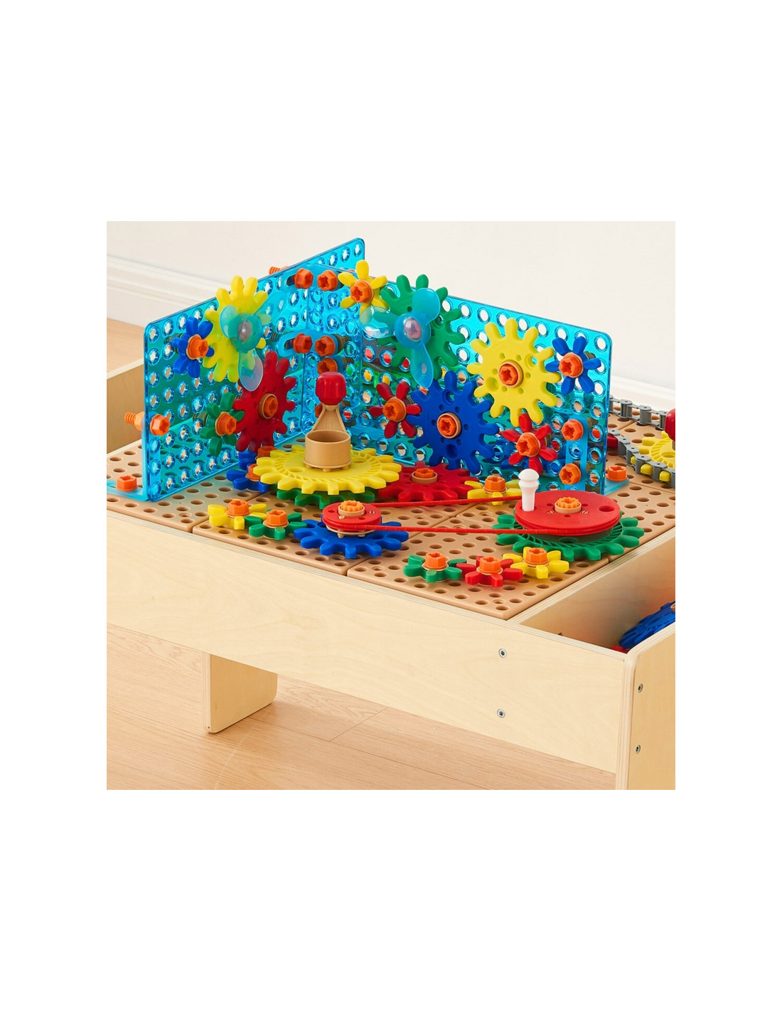 Drewniany stół STEM marki Masterkidz to idealny dodatek do każdej klasy przedszkolnej lub podstawowej, stół STEM jest wyposażony w panele STEM kompatybilne z szerokim asortymentem akcesoriów STEM. Dzięki niskiej poziomej powierzchni dzieci mogą pracować siedząc lub stojąc, samodzielnie lub w grupach. Stoły są solidne i wystarczająco duże, aby dzieci mogły tworzyć rozbudowane projekty lub rozwiązania. Wbudowane tacki po obu stronach stołu umożliwiają łatwe przechowywanie elementów. Zestaw zawiera szeroki wybór elementów, które zachęcają dzieci do budowania i tworzenia własnych urządzeń mechanicznych oraz ścianki umożliwiające rozszerzanie mechanizmów w 3 wymiarach.