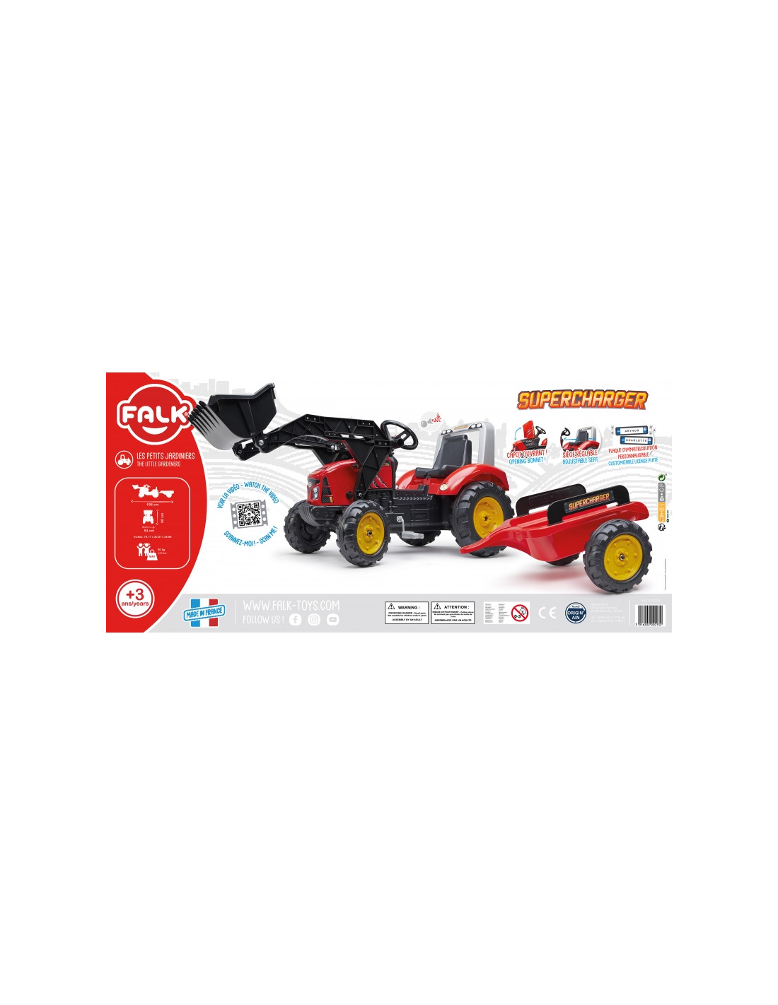 FALK Traktor na pedały z przyczepą Red Supercharger FALK to spełnienie marzeń niejednego małego traktorzysty. Starannie wykonany, z dbałością o najmniejszy szczegół! Żaden Farmer by takim nie pogardził. Pojazd wykonany z najwyższej jakości tworzywa przeznaczony dla dzieci w wieku od 3 lat. Pojazd jest wyposażony w przednią łyżkę oraz odpinaną przyczepę z panelami i kierownicę z klaksonem. Koła traktorka zostały wykonane z wysokiej jakości plastiku. Traktor posiada również otwieraną maskę z imitacją prawdziwego silnika.