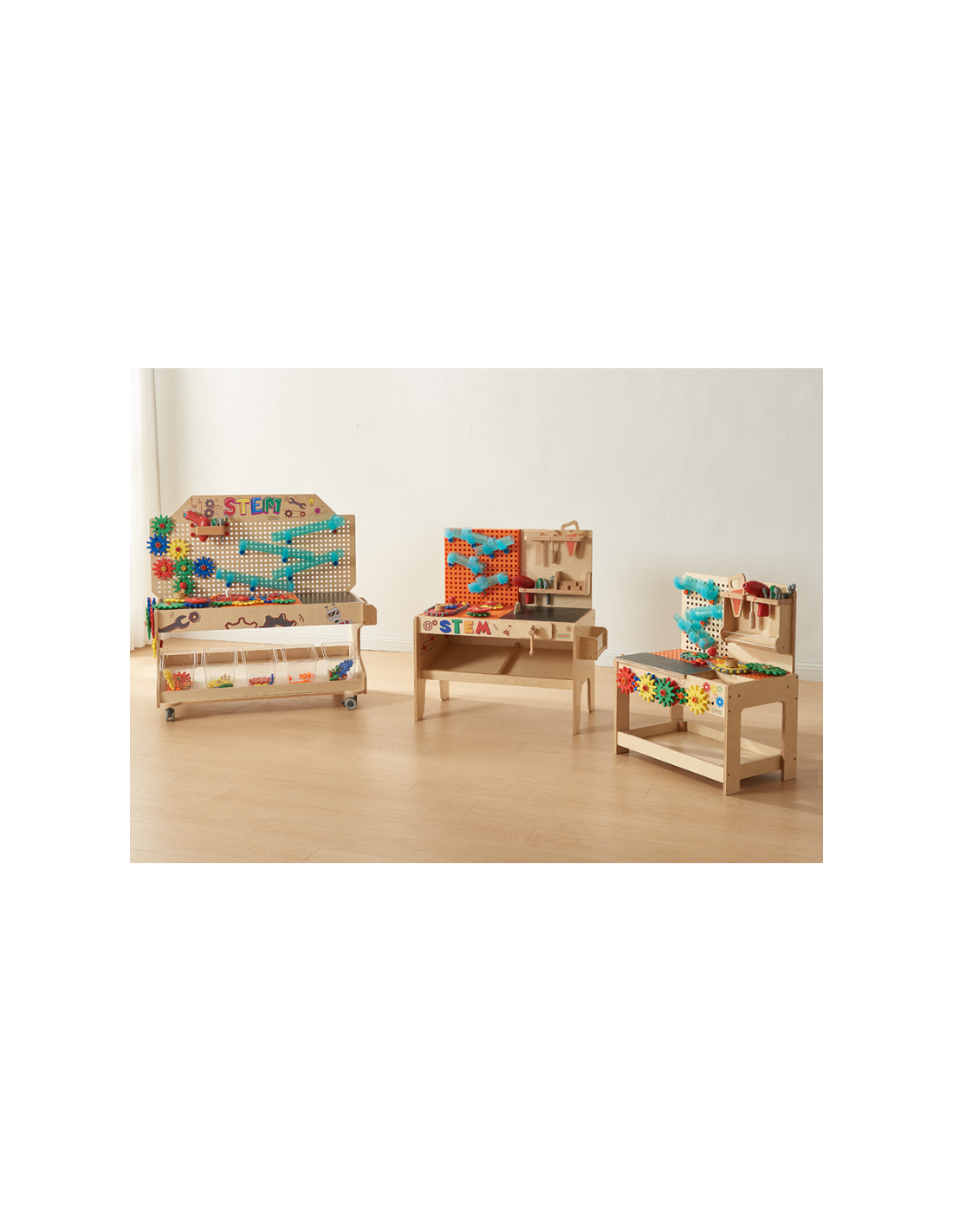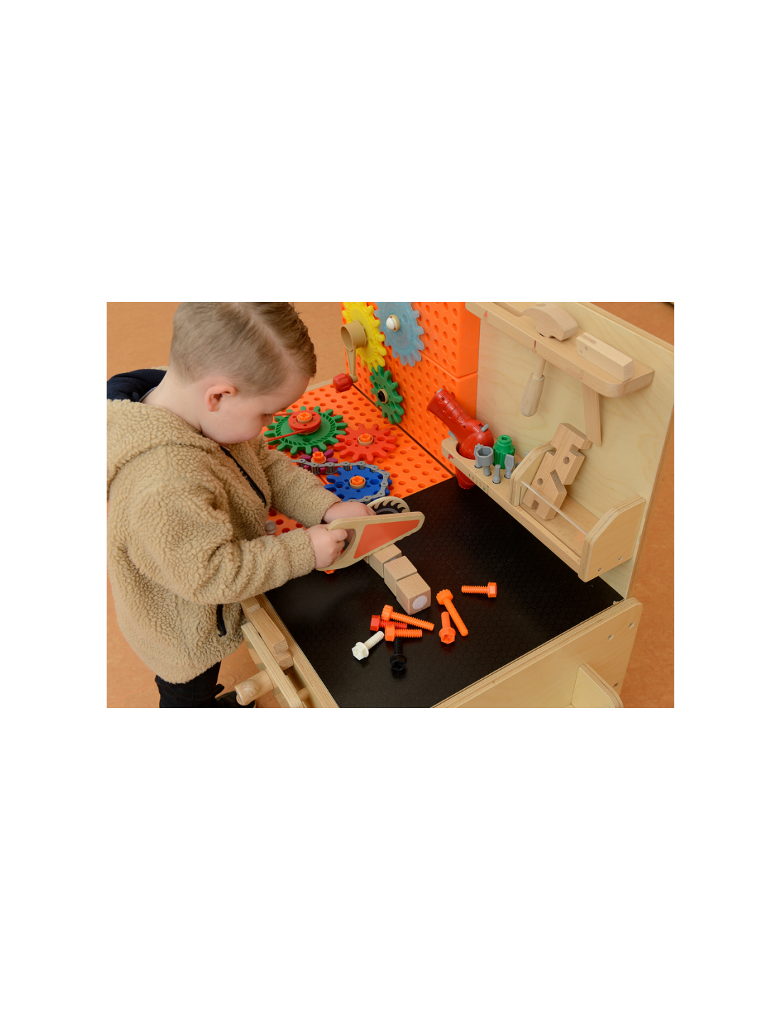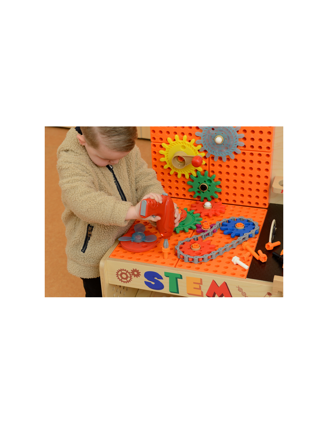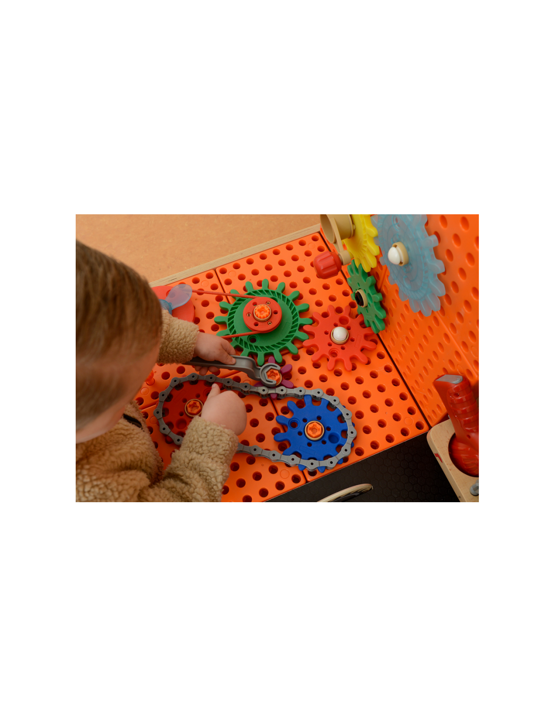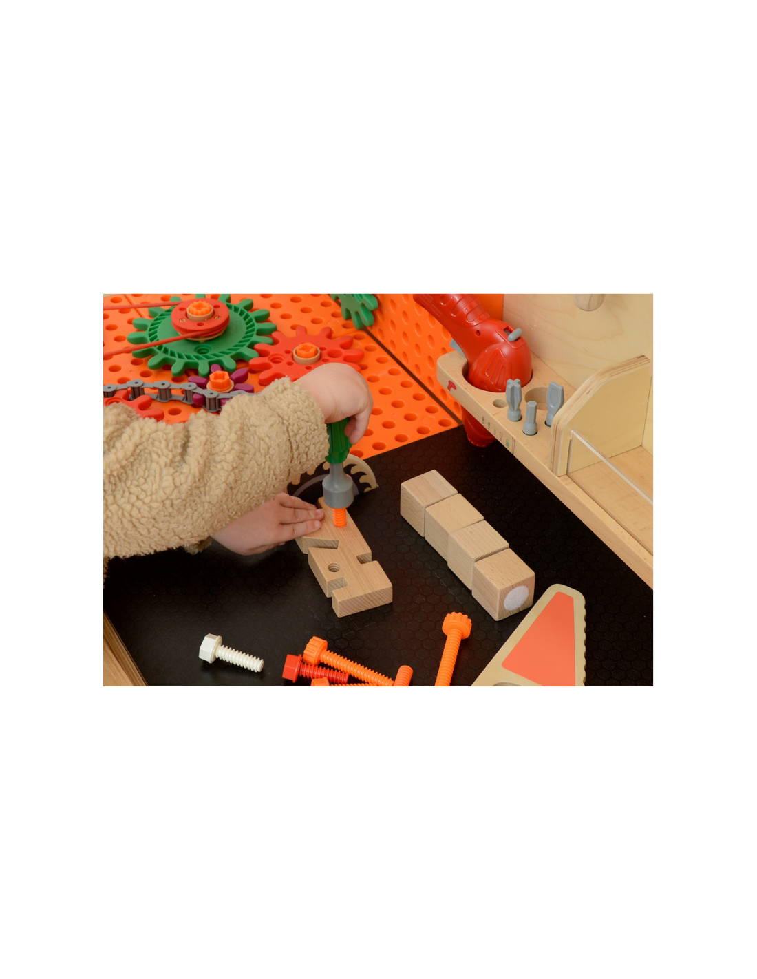 Dziecko może użyć specjalnych, dedykowanych narzędzi, by wkręcać śrubki oraz nauczyć się prawidłowego używania wkrętarki, śrubokrętów, czy kluczy. Konstruując razem skomplikowane mechanizmy, maluch pozna zasadę działania kół zębatych. Z kolei zestaw z rurami i pompą nauczy dziecko o grawitacji oraz podstaw hydrauliki.