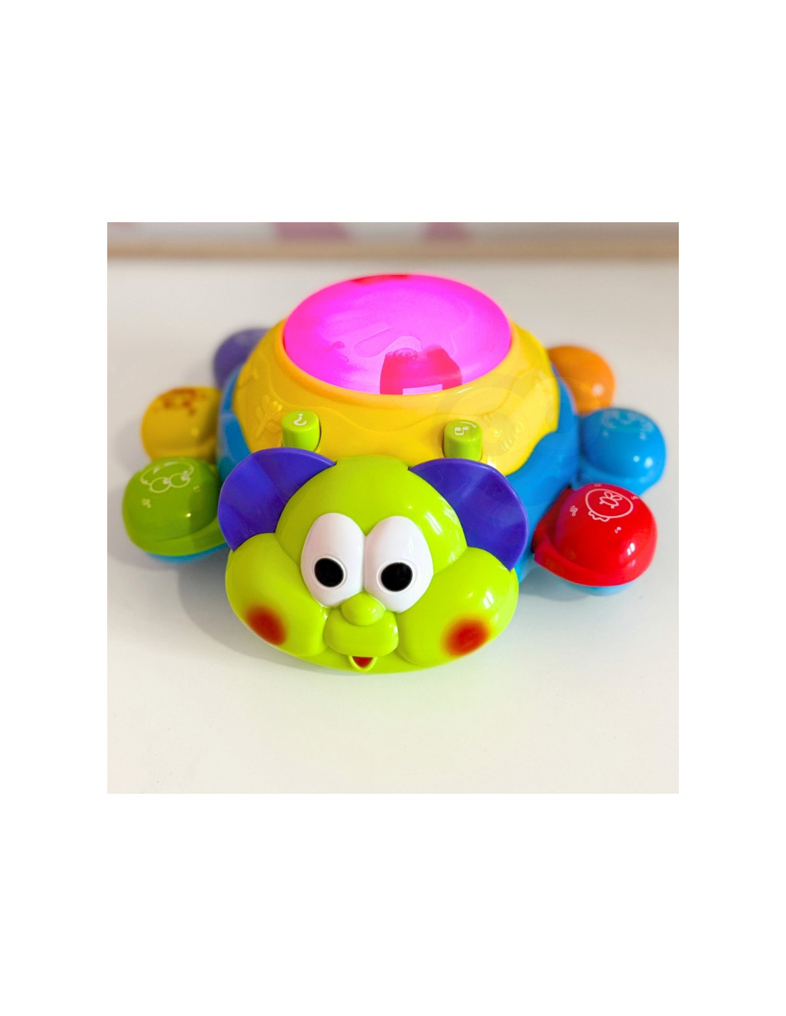 Zabawka interaktywna do raczkowania Biedronka od marki WOOPIE jest świetnym narzędziem do nauki pierwszych kroków. Zabawka jeździ i ucieka maluszkowi, by ten chciał zacząć się ruszać i ją złapać. Specjalny czujnik pozwoli Biedronce wyczuć przeszkodę i obrócić się w drugą stronę. Biedronka posiada liczne wartości edukacyjne. Każda nóżka posiada inny kolor i inne zwierzę do nauki z dzieckiem. Dodatkowo po naciśnięciu na nóżkę usłyszymy nazwę zwierzęcia i dźwięk z nim związany. Nazwy zwierząt są w języku angielskim co pozwoli dziecku przyswoić pierwsze słówka. Efekty świetlne i dźwiękowe następują po uderzeniu bębenka na górze zabawki. Zabawka rozwija dziecko od najmłodszych lat m.in. poprawia koncentrację, koordynację ręka-oko oraz umiejętności poznawcze.