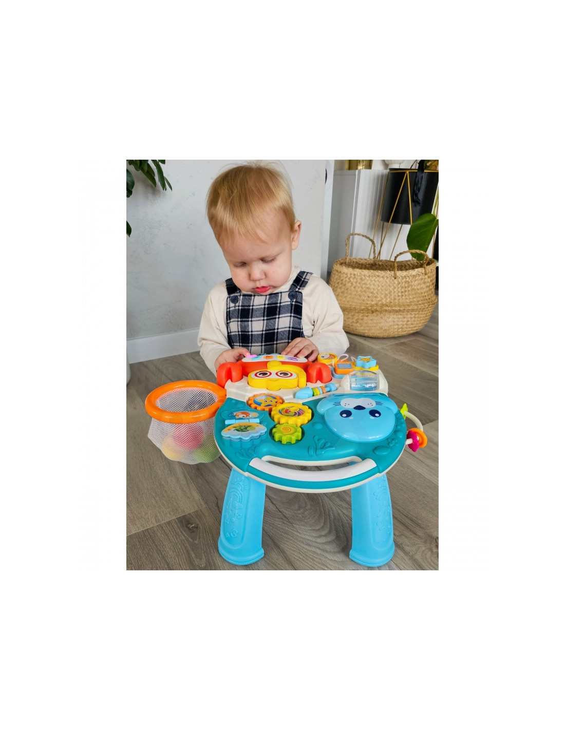 Główny panel oferuje mnóstwo atrakcji: krabik-mini-organki dla rozwoju muzycznego, ruchome "drzwiczki" z wesołymi zwierzątkami, obrotowe zębatki, kolorowe klocki na sznurkach do nauki kształtów i kolorów, obrotową grzechotkę, mini liczydło z krążkami i wiele innych.
