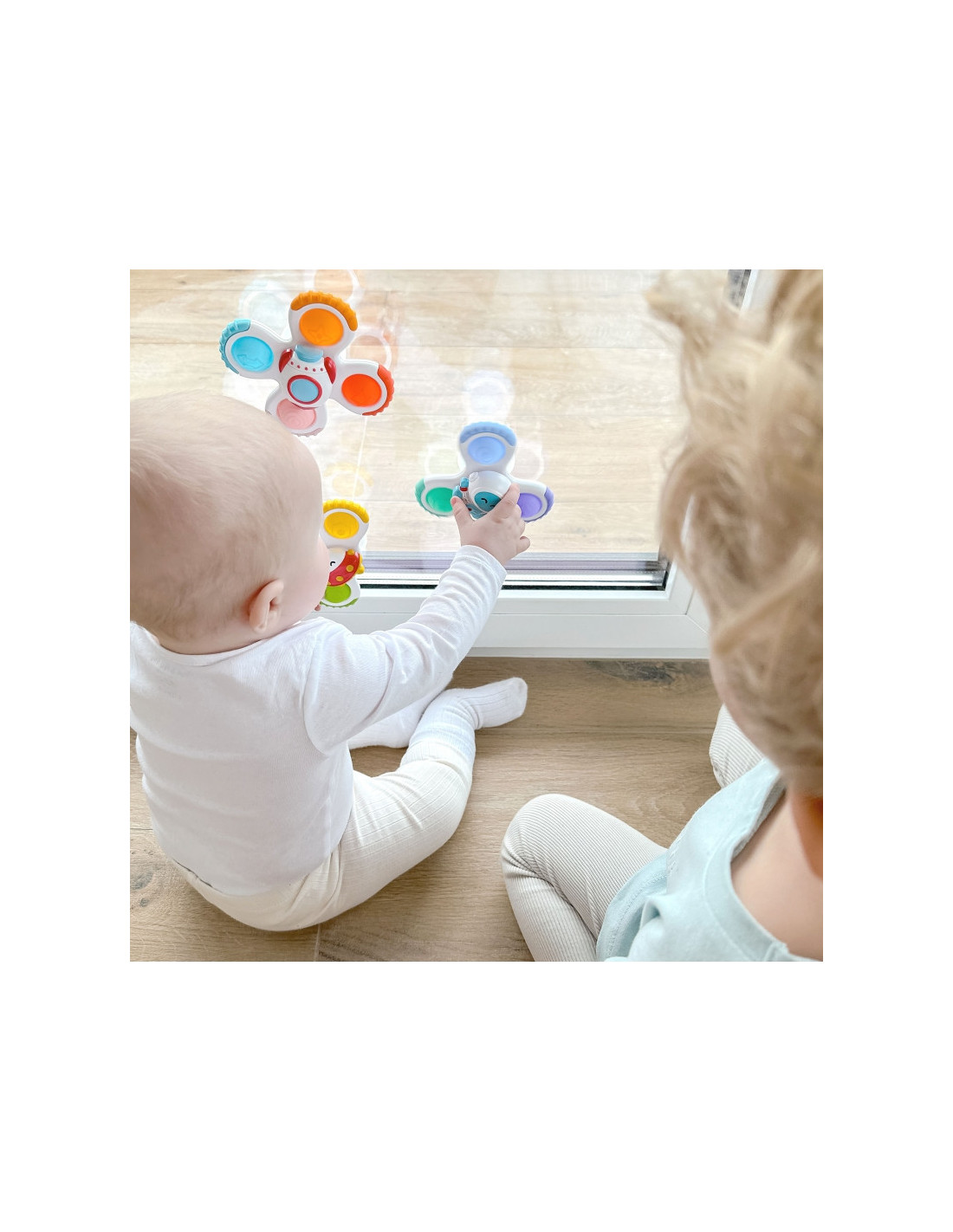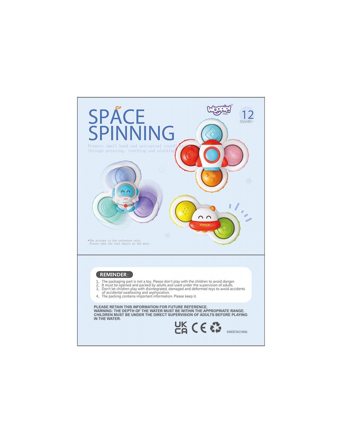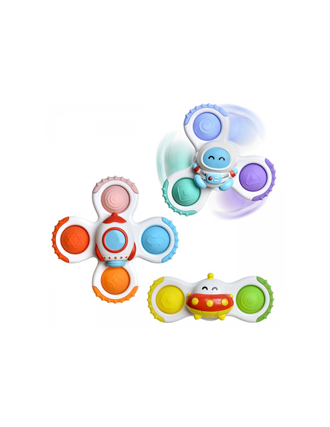 Zestaw Spinnerów od marki WOOPIE zrobi na dziecku duże wrażenie. W zestawie znajdują się 3 szt. spinnerów: rakieta, kosmita i ufo. Spinnery dziecko może zabrać wszędzie i przyczepić wszędzie dzięki gumowym przyssawkom. Można przyczepić spinnera zarówno do szyby w czasie podróży oraz do wanny podczas kąpieli (zabawkę można moczyć). Łożyska spinnerów gwarantują długotrwały obrót. Zabawki posiadają gumowe elementy do przyciskania co rozwinie zmysły dziecka oraz zadziała odstresowująco. Zabawa ćwiczy zwinność rączek u dziecka oraz poprawia koordynację ręka-oko.