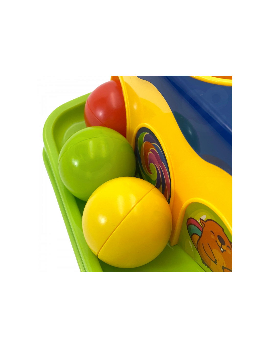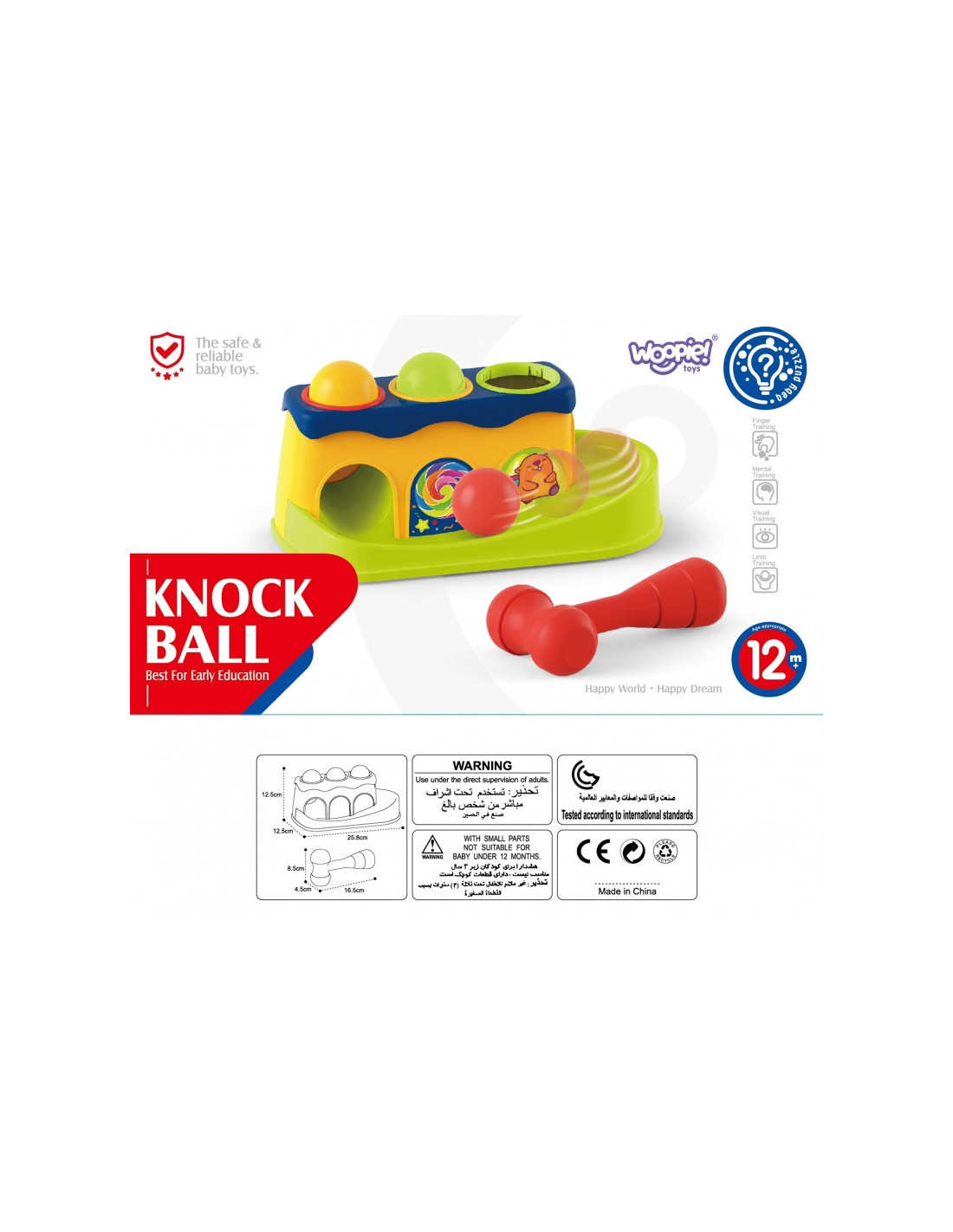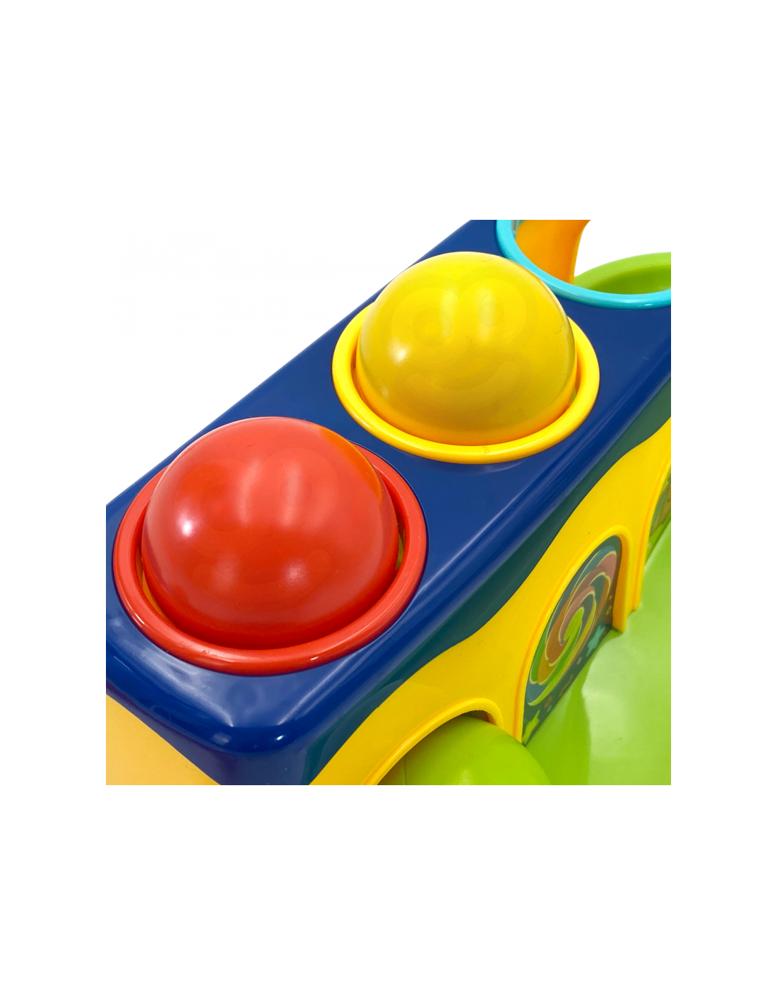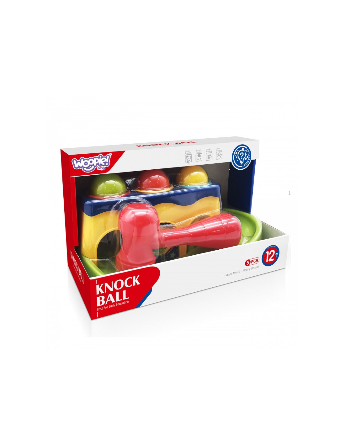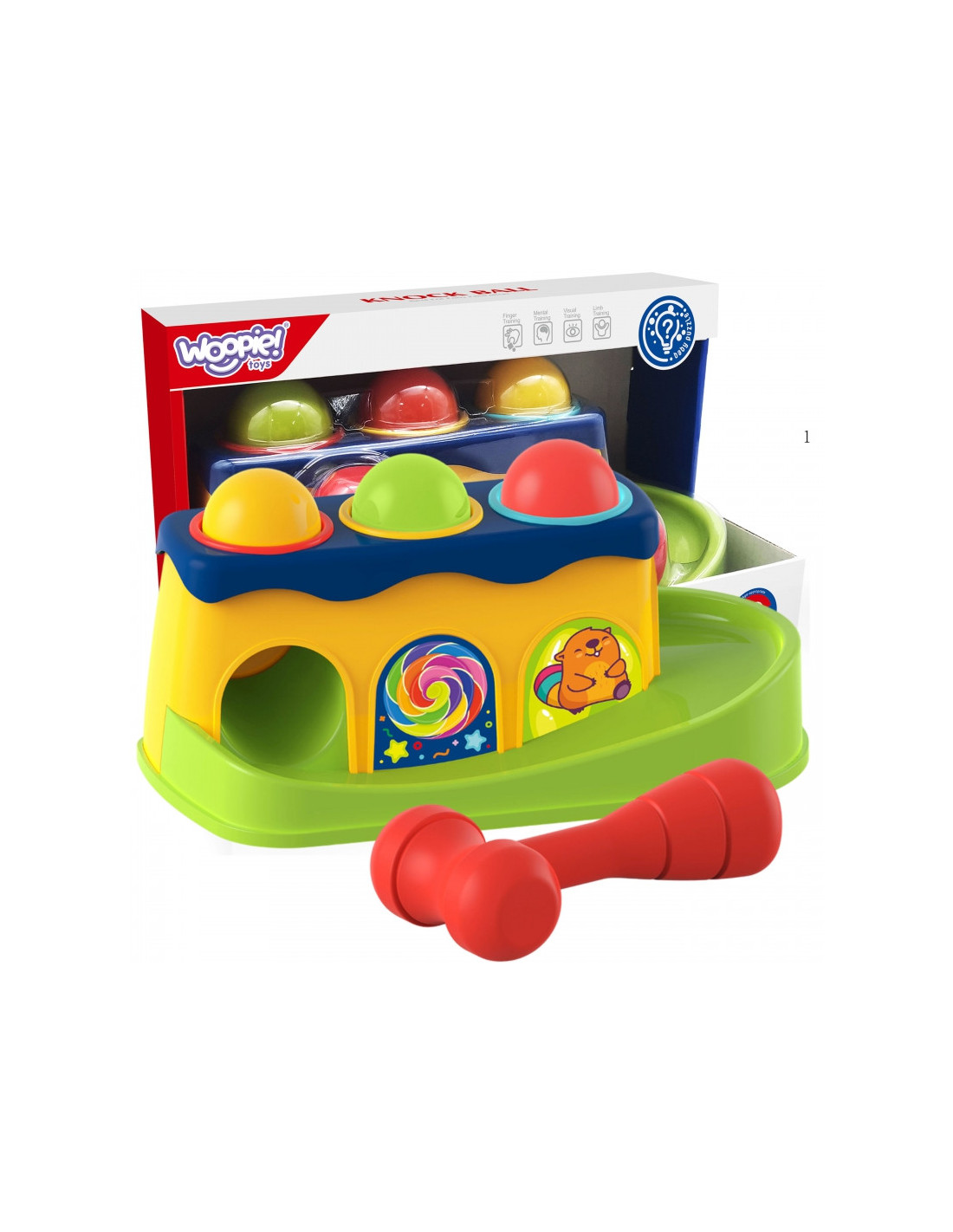 Kolorowy przebijak od firmy WOOPIE to zabawka którą pokocha każde dziecko. Przyjazne i ciepłe kolory oraz wygodny w uchwyceniu młotek zachęcą każdego malucha do zabawy. Dziecko bawiąc się rozwija precyzję ruchów rączek, zręczność oraz coraz lepiej rozróżnia kolory, a w przyszłości nabyta precyzja ruchów i zręczność ułatwi dziecku naukę pisania. Dziecko przy użyciu młotka wbija kuli, które zjeżdżają po torze, dzięki czemu maluch może obserwować toczące się po nim piłeczki.