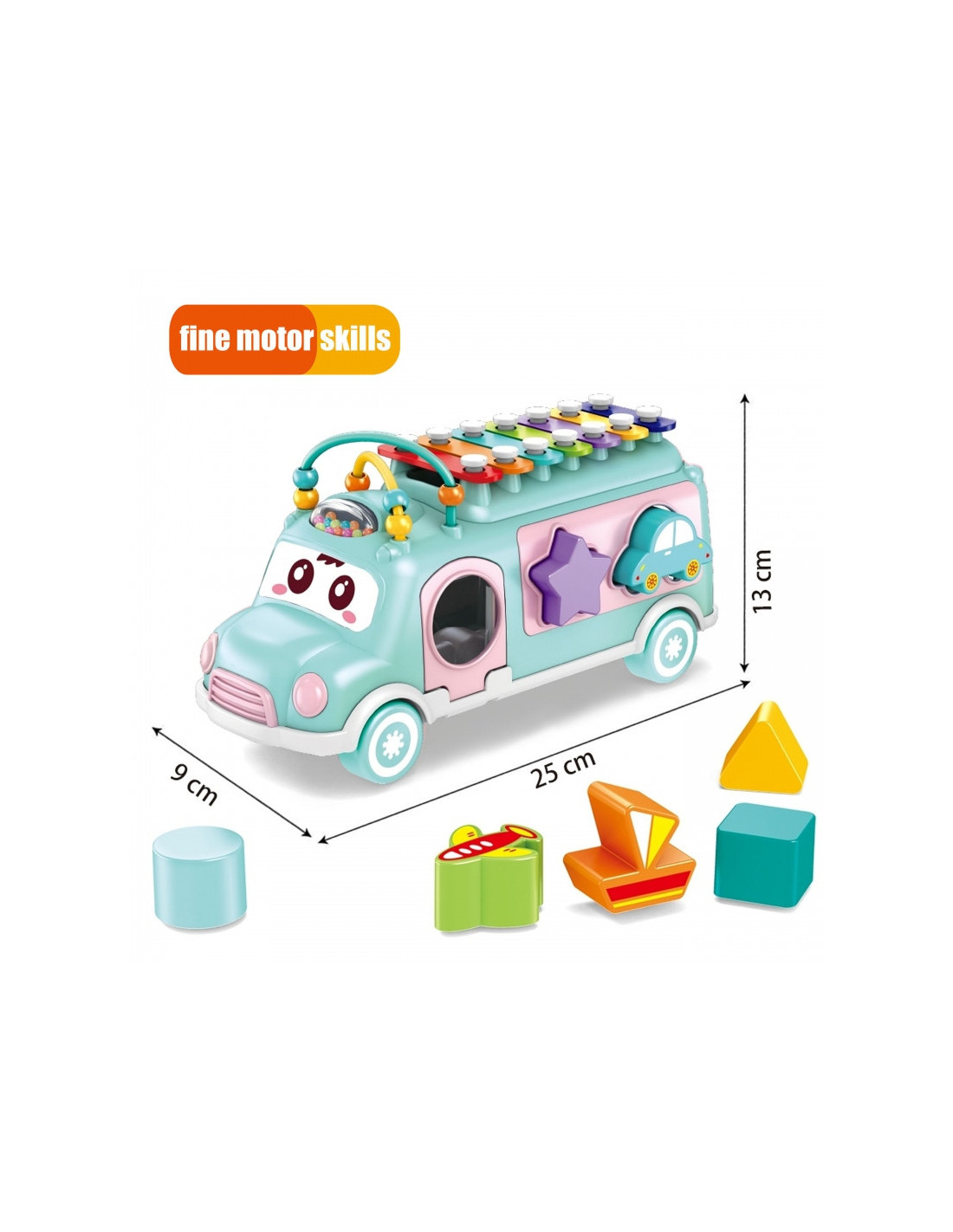 Samochodzik Muzyczny Sorter z Cymbałkami Zielony od marki Woopie to uroczy samochodzik w pastelowych kolorach, który zachwyci każdego malucha. Oferuje on wiele możliwości interakcji i stymulacji zmysłów, a także rozwija zdolności motoryczne i logiczne dziecka. Samochodzik ma wiele elementów do manipulowania i odkrywania. Dziecko może używać dołączonego młoteczka, aby grać na kolorowych cymbałkach umieszczonych na dachu autka. Na bokach samochodzika znajdują się otwory w różnych kształtach, do zabawki dołączone są kolorowe klocki pasujące do tych otworów. Dziecko może bawić się w dopasowywanie klocków do odpowiednich kształtów, co pomoże mu rozwijać koordynację wzrokowo-ruchową i rozpoznawanie kolorów i kształtów. Koraliki na dachu, które dziecko może przesuwać ćwiczą zręczność i koncentrację dziecka.