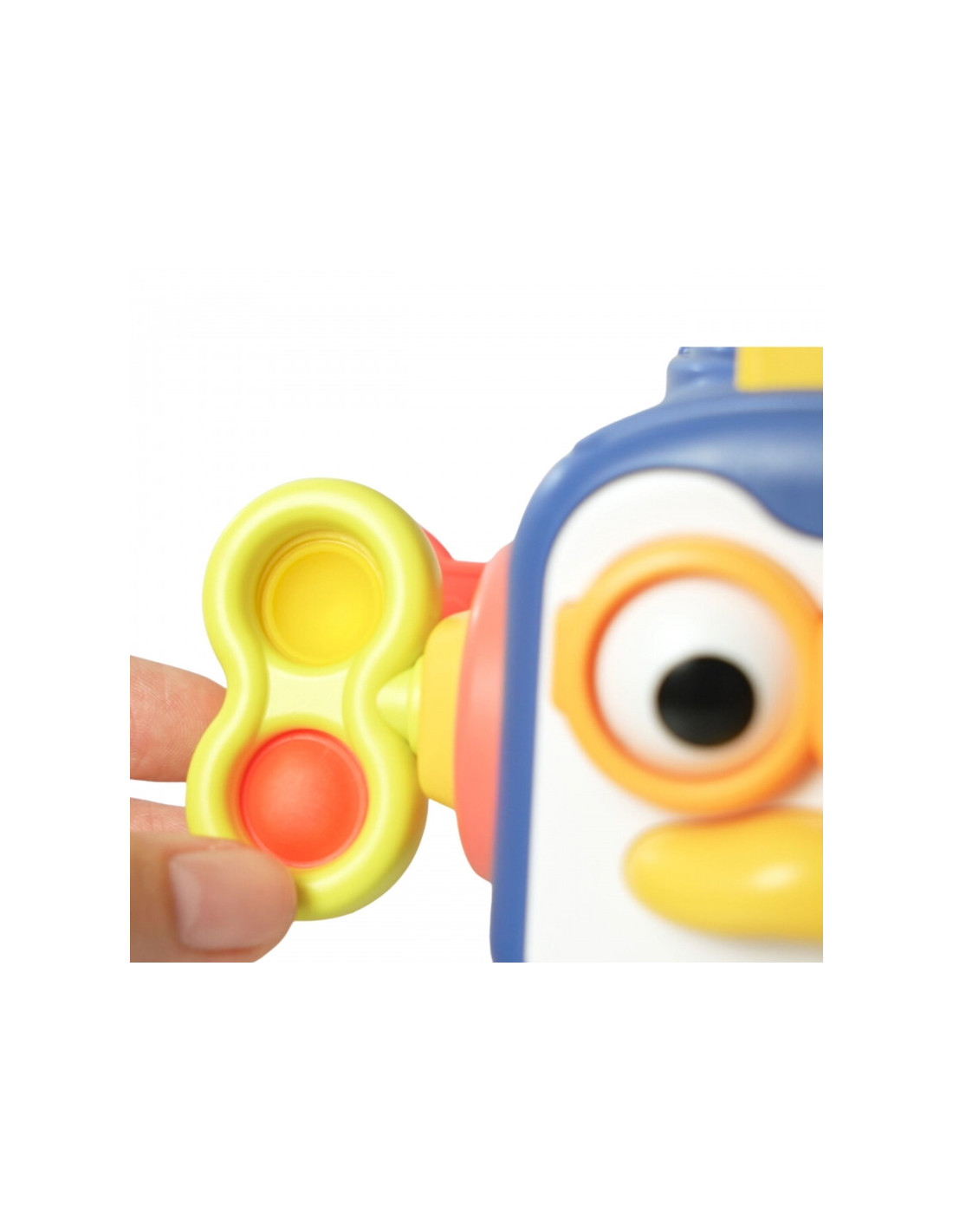 - - Na lewej ściance kostki pingwina, znajduje się zabawka pop-it, która podczas przekręcania wydaje dźwięk