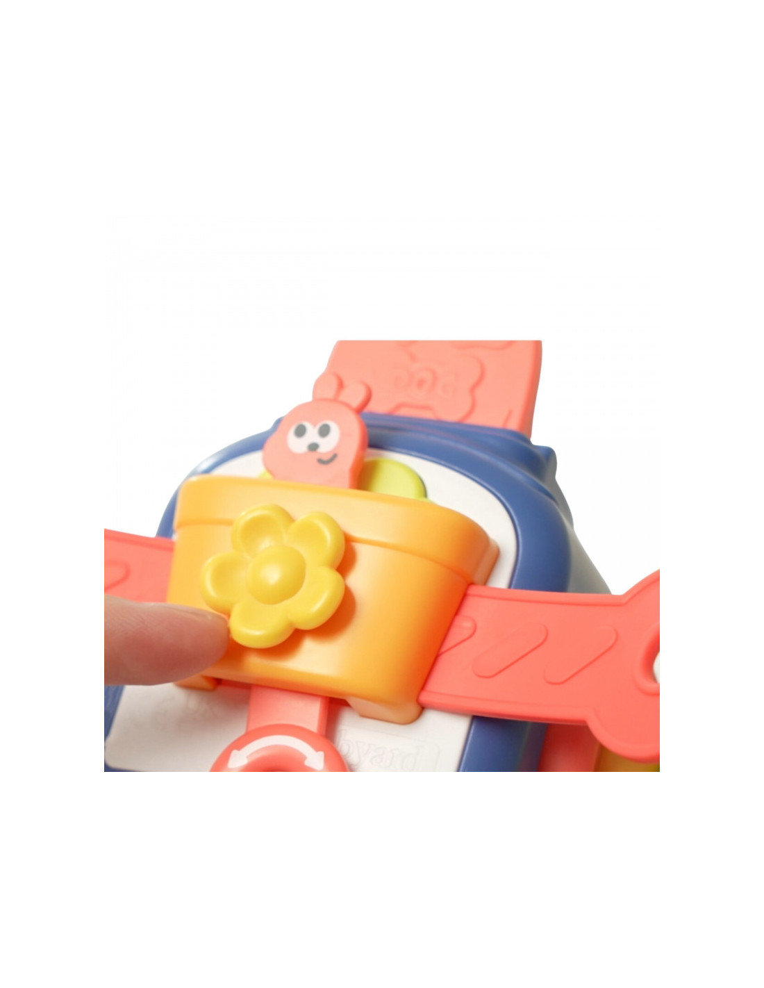 - - Na tylnej ścianie zabawki znajduje się doniczka z zajączkiem. Dzięki wystającej z dołu doniczki części, dziecko może poruszać króliczkiem. Dodatkowo po bogach doniczki wystają dwa końce paska, których przeciąganie powoduje kręcenie się kwiatka