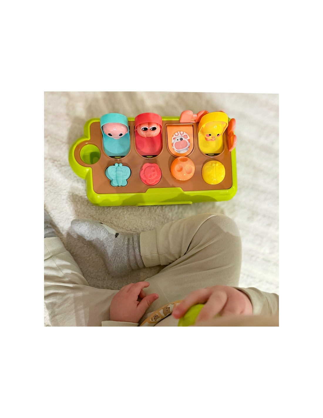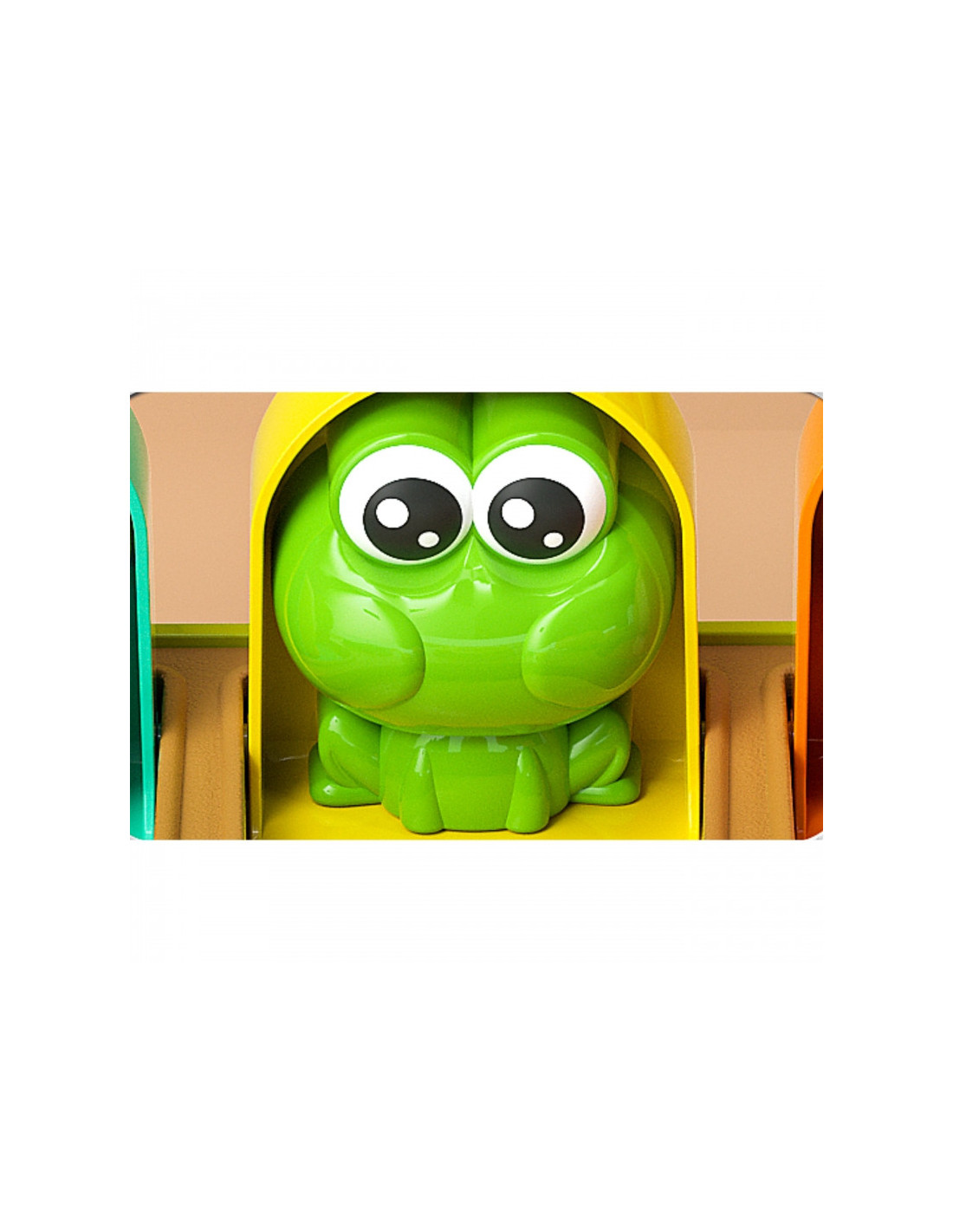 5 figurek zwierzątek wyskakuje przy użyciu odpowiadającego mu przyciskowi. Dziecko samo odkryje ciąg przyczynowo skutkowy, dlaczego dana figurka wyskoczyła.
