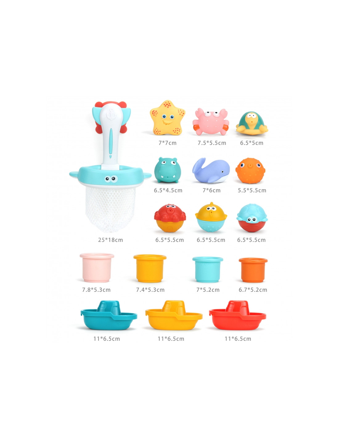 Zestaw zabawek wodnych od marki WOOPIE będzie super uzupełnieniem kąpieli dla Twojego dziecka. Zestaw można używać zarówno podczas kąpieli oraz do zabawy w piasku. Zestaw zawiera: siatkę do łowienia; 3 łódki; 4 kubeczki, które można ze sobą złożyć; 9 foremek/ kubeczków przelewowych w zależności , czy zabawa jest w wodzie czy w piasku. Dziecko podczas zabawy w wodzie może przeprowadzić szereg różnych doświadczeń podczas kąpieli! Zestaw nie tylko umili czas podczas kąpieli lub zabawy w piaskownicy, ale również rozwinie zdolności manualne u dziecka oraz rozwinie świadomość otaczającego go świata, a przede wszystkim pozwoli skoncentrować dziecko i zająć podczas mycia.