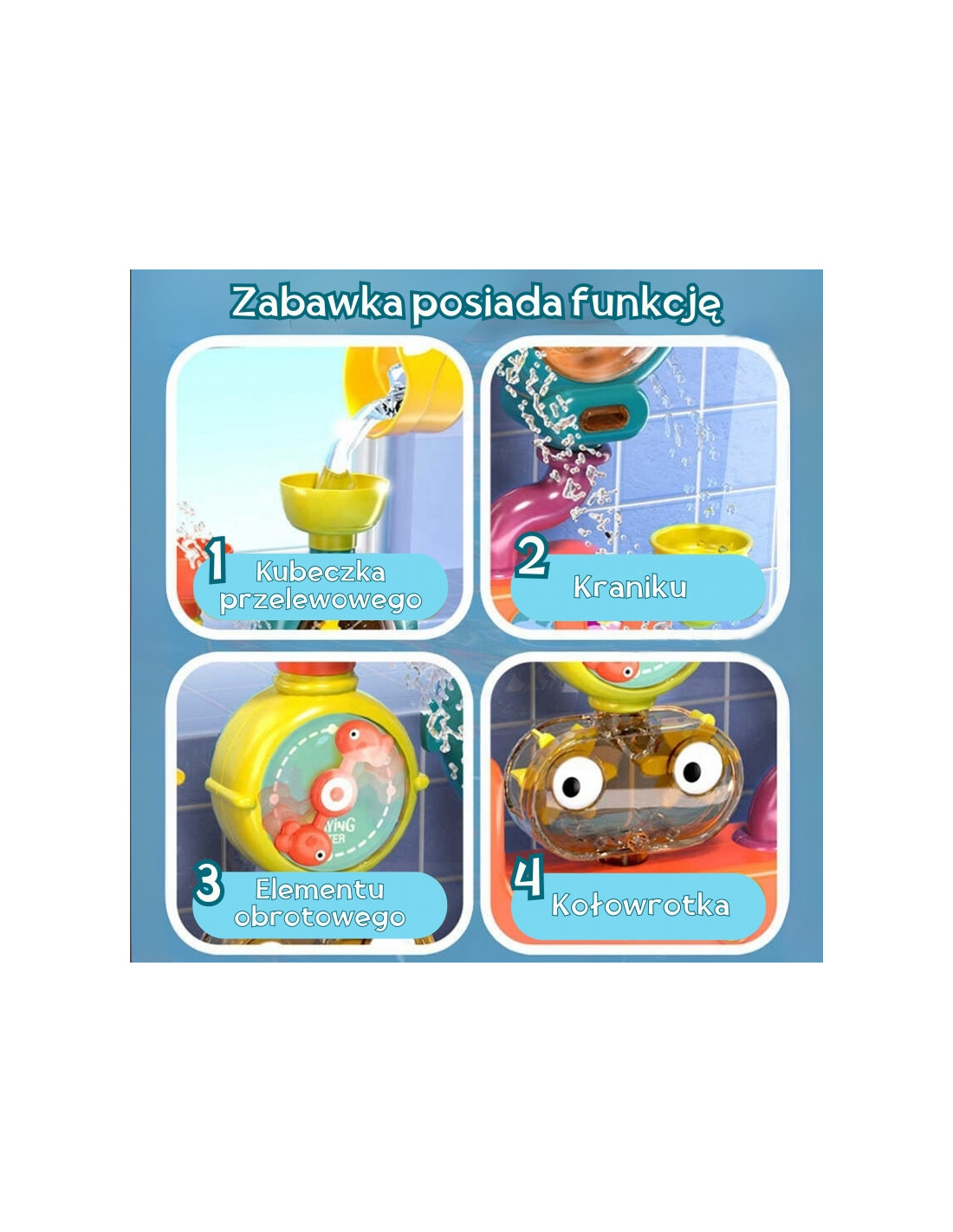 - - podczas wlewania wody różne elementy obracają się i wylatują z kraników oraz kręcącego się kołowrotka wprost do wody