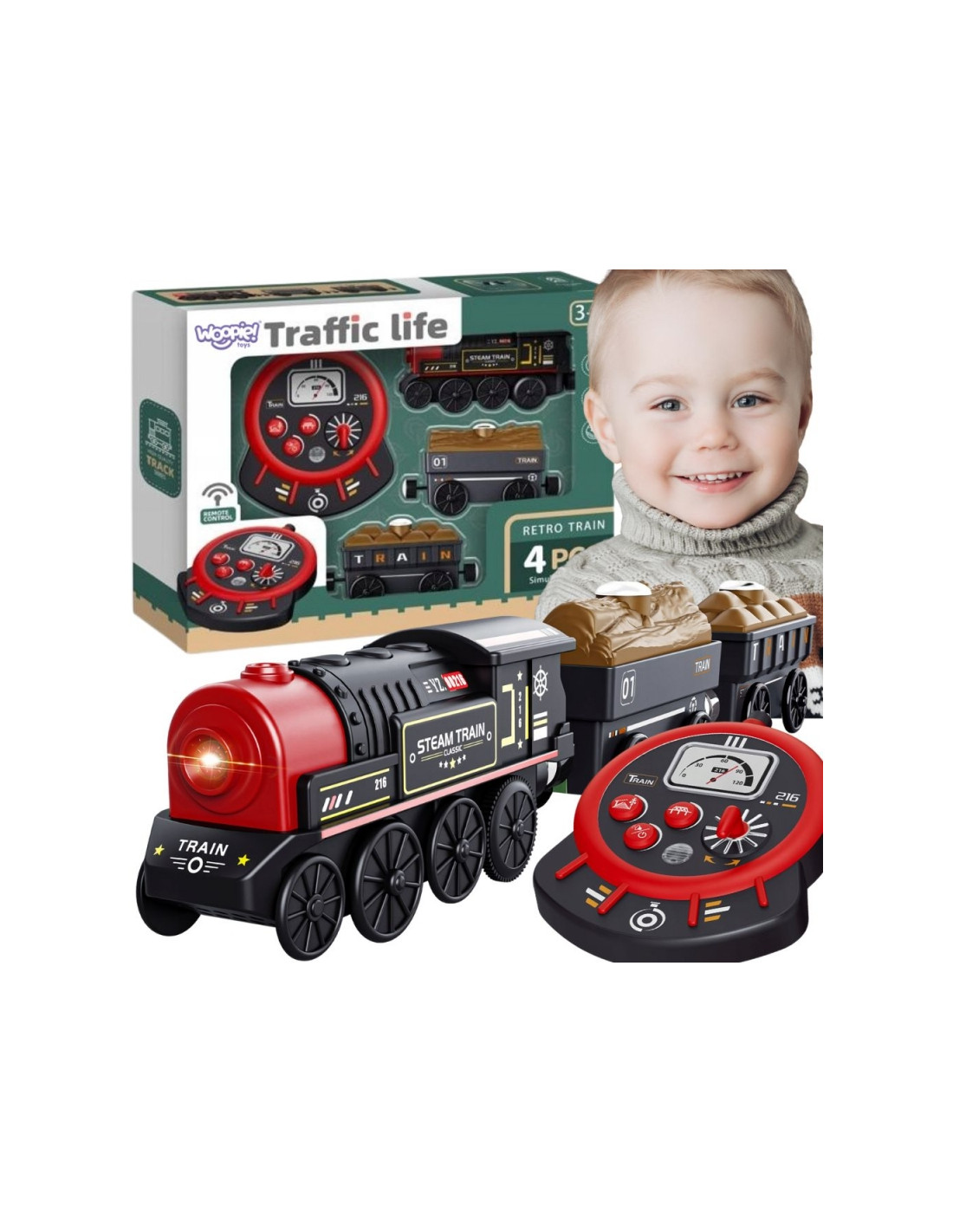 Przenieś swoje dziecko w fascynujący świat kolei z Kolejką Retro Zdalnie Sterowaną od marki Woopie! Ten 4-częściowy zestaw zapewnia mnóstwo kreatywnej zabawy, w której maluch może wcielić się w rolę prawdziwego maszynisty. Realistyczny wygląd lokomotywy parowej, efekty świetlne i dźwiękowe , specjalny pilot w kształcie panelu sterowania sprawiają, że zabawa jest niezwykle wciągająca. Kolejka składa się z lokomotywy i dwóch wagonów towarowych. Zabawka przeznaczona jest dla dzieci od 3 roku życia. Zdalne sterowanie rozwija zdolności manualne i koordynację wzrokowo-ruchową, a jednocześnie dostarcza wielogodzinnej, pasjonującej rozrywki!