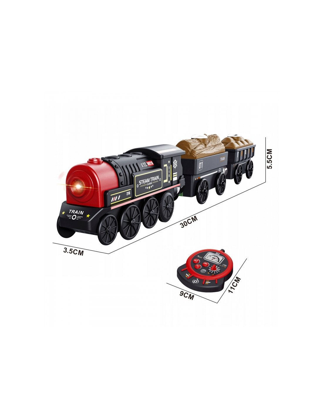- - lokomotywa posiada 3 przyciski, za pomocą których można sterować nią nawet bez pilota : środkowy przycisk po dłuższym utrzymaniu włącza lokomotywę, dodatkowe 2 zadają kierunek jazdy