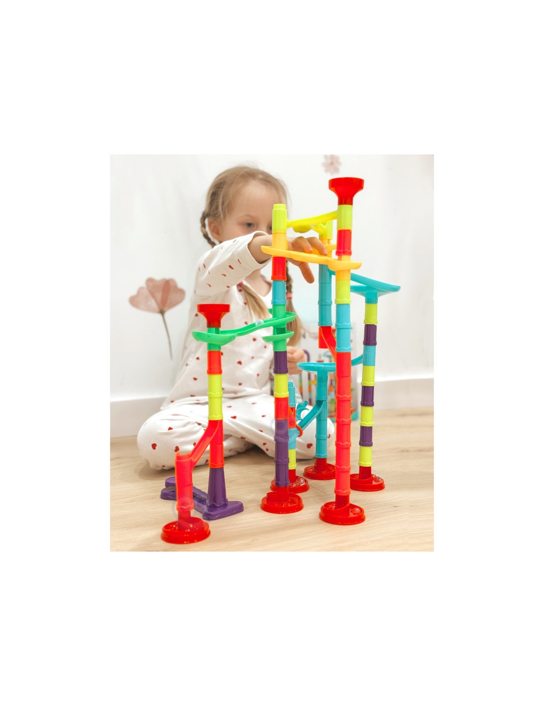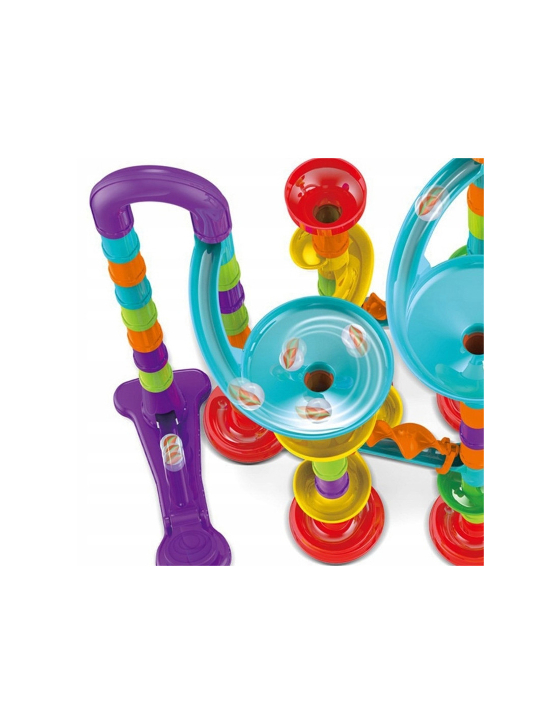 Kulodrom od WOOPIE to spiralny tor zapewniająca niekończącą się zabawę. Ten kolorowy zestaw składa się z wielu różnych kolorowych elementów , które maluch może z łatwością układać jedna na drugiej oraz dowolnie łączyć w wymyślne tory. Dodatkowo z tyłu opakowania znajduję się instrukcja pokazująca przykładowy tor z wykorzystaniem wszystkich elementów. Puszczaj kulki i obserwuj, jak toczą się i huśtają jedna po drugiej. W zestawie jest aż 113 el., w tym np wyrzutnia i kulki do toru. Rozmiar jest odpowiedni dla małych rączek i pomaga rozwijać koordynację wzrokowo-ruchową.