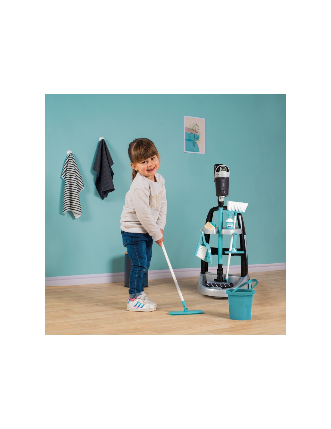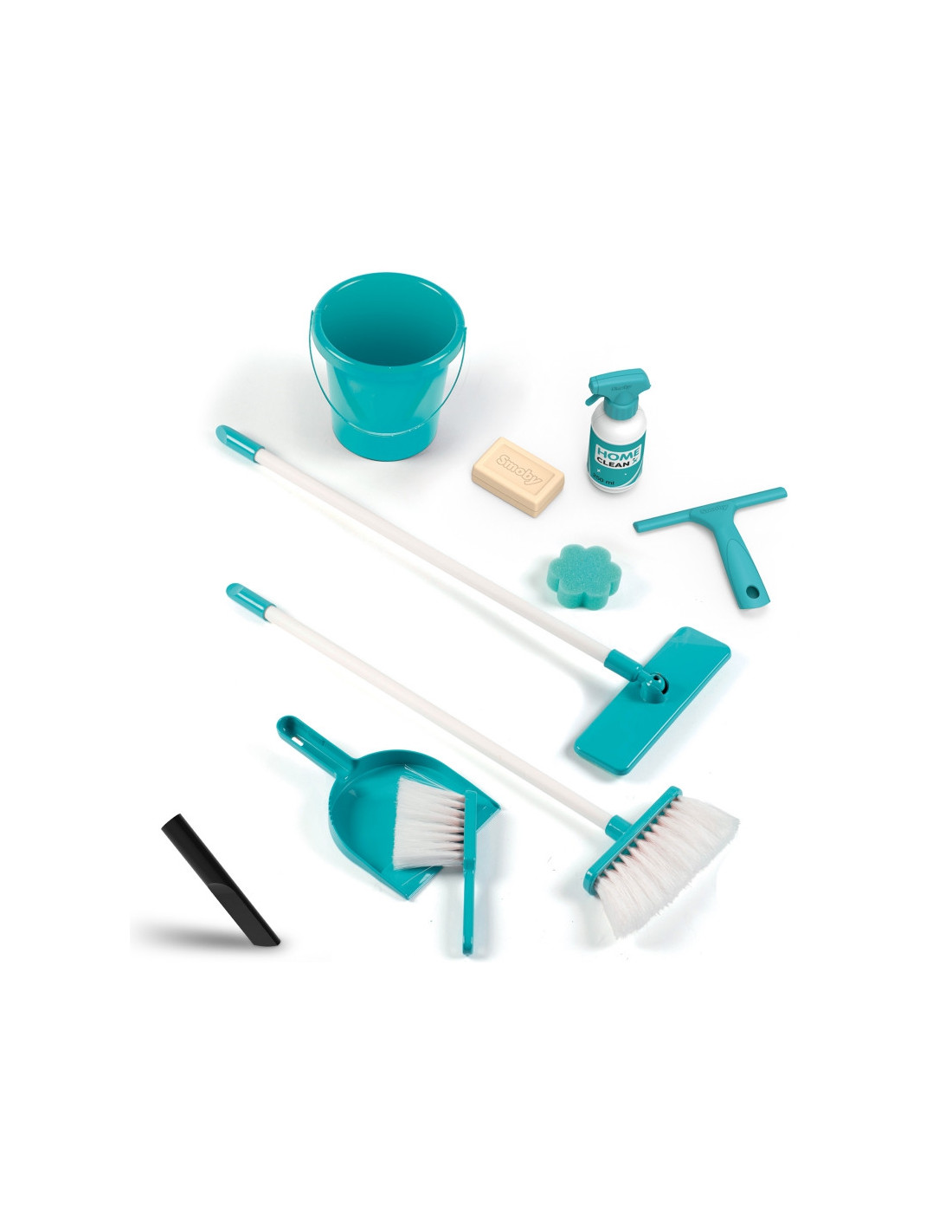 - - W zestawie znajdziemy 9 akcesoriów takich jak szufelka, zmiotka, szczotka, mop, gąbkę, wiaderko oraz imitację środków czyszczących.