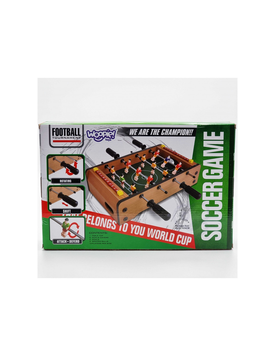 Stół do gry w piłkarzyki firmy Woopie sprawi że Twój maluch będzie miał zajęcie na długie godziny. Gra przeznaczona dla dwóch osób. Na każdej prowadnicy mamy ustawionych po 3 piłkarzy którzy dzielnie grają na boisku. Całość zapakowana w bardzo ładne i schludne opakowanie. Wygodny uchwyt-rączka pozwala na wygodne przenoszenie pudełka z jego zawartością. Całość przeznaczona dla dzieci od lat 6.