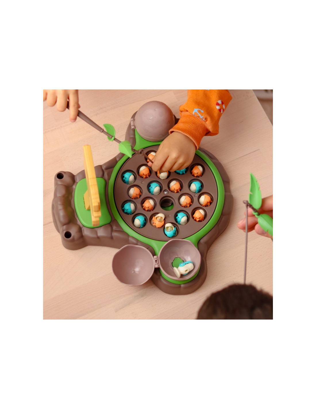 Łowienie dinozaurów rybek od marki WOOPIE zachęci do poznawania świata Na podstawie znajduje się ruchoma tarcza, z której można łowić małe dinozaury. Włącznik znajduje się na przodzie po prawej stronie. Jak guziczek ustawimy na środku, tarcza zacznie się obracać, gdy przesuniemy go do końca w prawo to usłyszymy przyjemną melodie, która będzie nam towarzyszyć podczas zabawy. Po bokach tarczy umieszczamy dwa zamykane jaja, gdzie możemy ukryć złowione dinozaury. Ta zabawka doskonale pobudza wyobraźnię, zachęca do kreatywnego i nieszablonowego myślenia, a także wspaniale rozwija zdolności manualne u najmłodszych, dodatkowo zapewnia wiele frajdy podczas nauki.