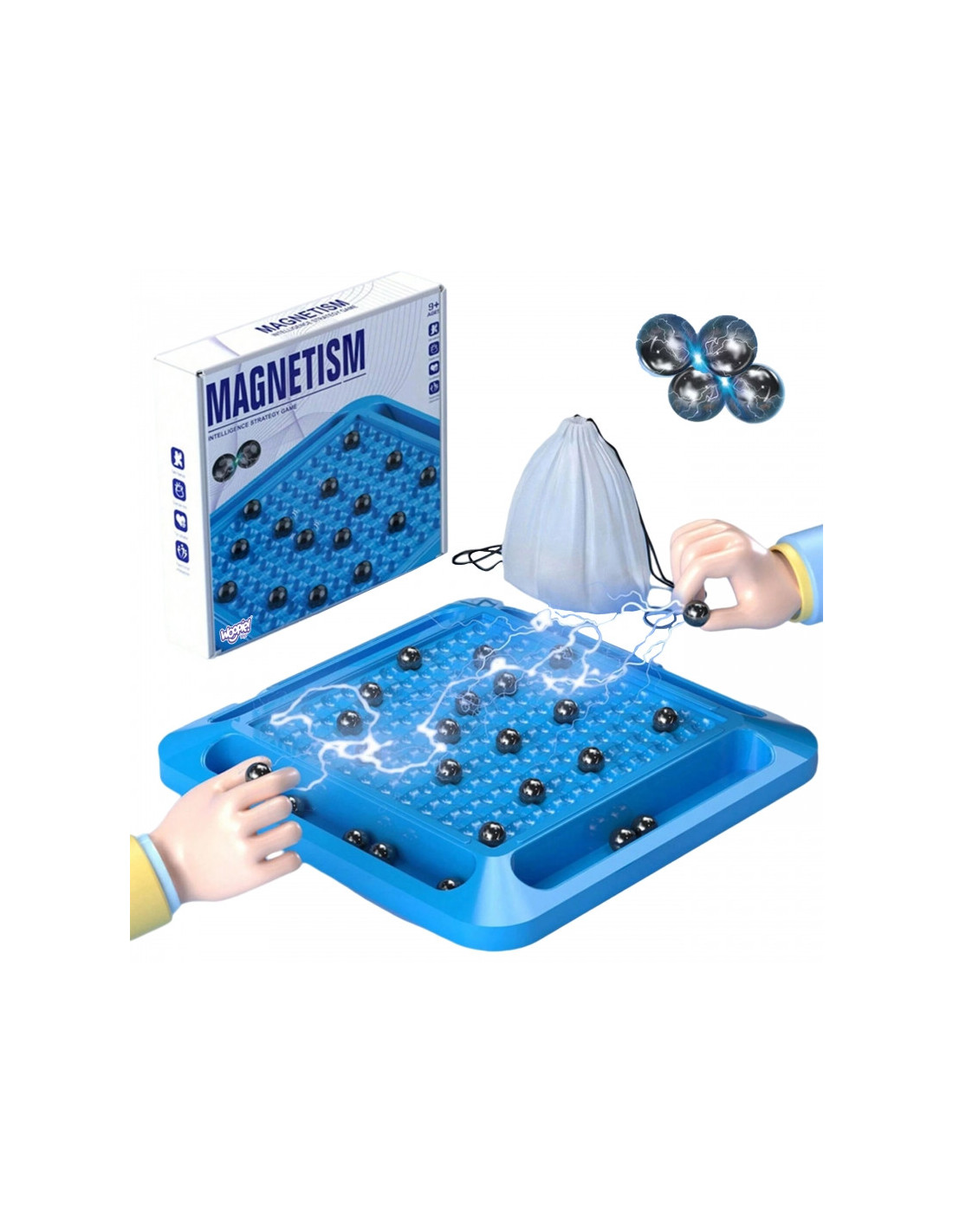 - Zestaw zawiera: 20 magnetycznych kulek, planszę do gry, z 4 półeczkami na magnesy, woreczek na kulki.