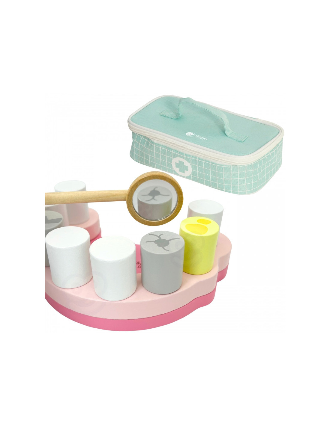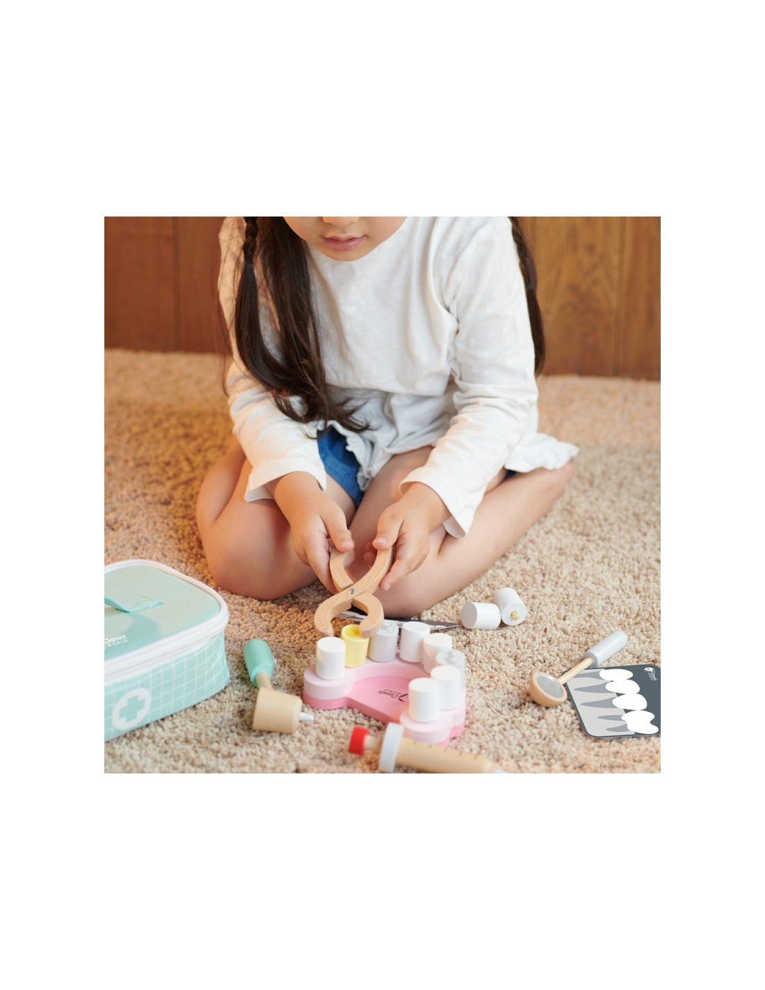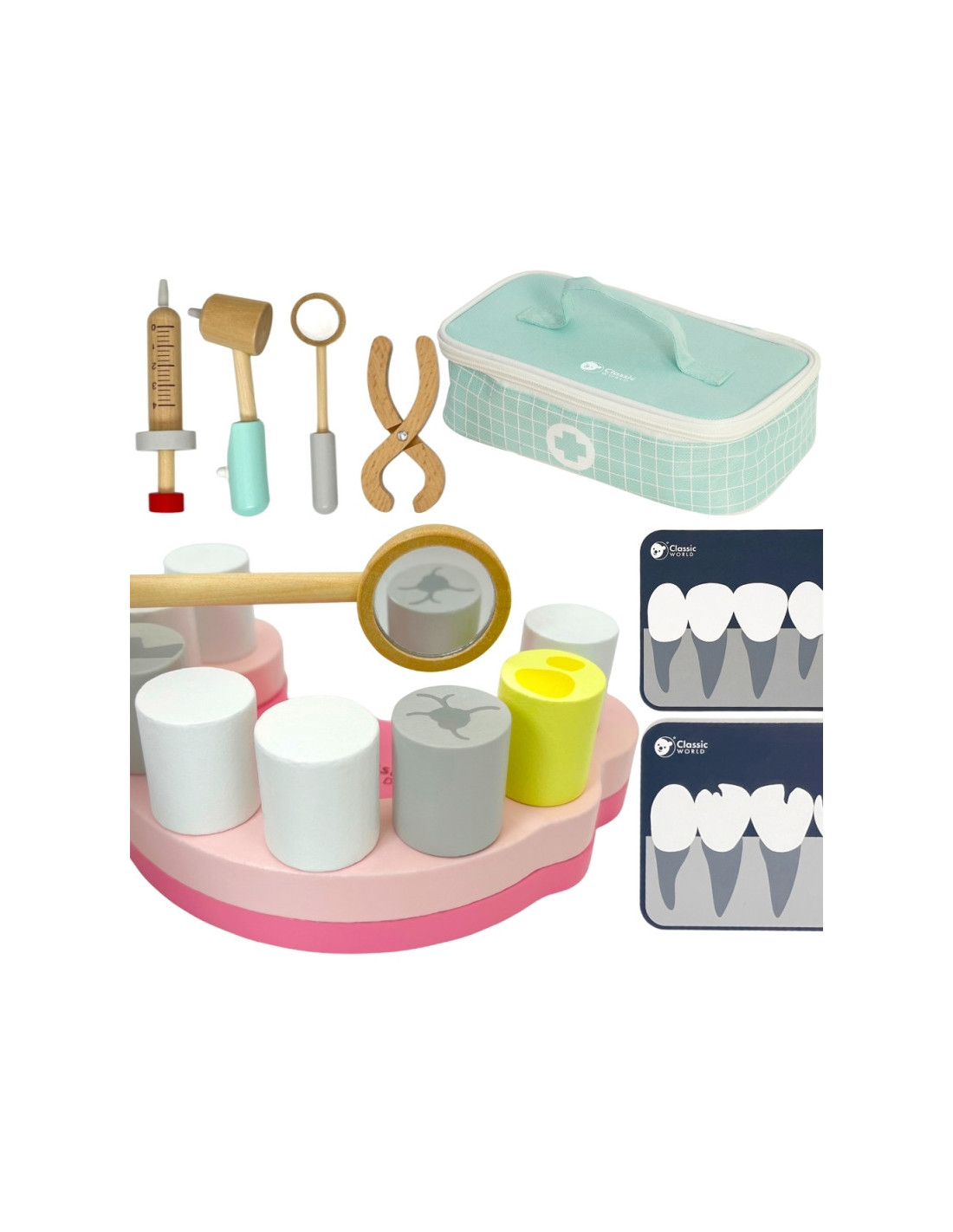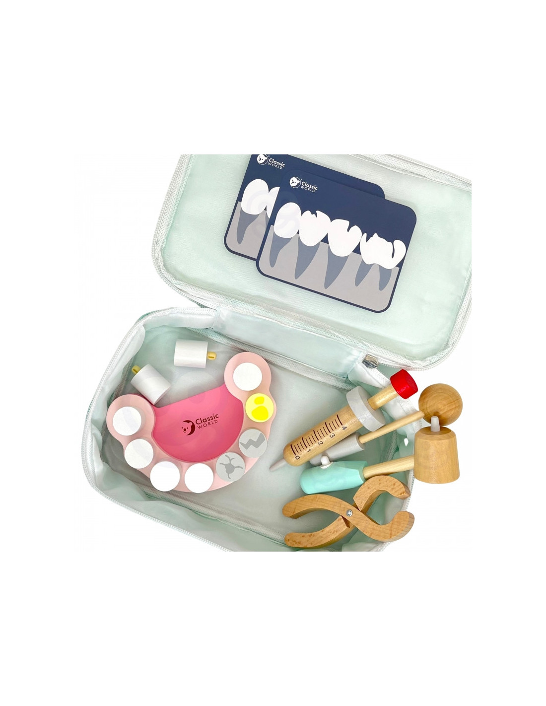 Drewniane narzędzia w torbie dla małego dentysty od marki CLASSIC WORLD. Ten zestaw zawiera wszystko, czego potrzebuje Twój mały Lekarz do zabawy w dentystę. Przyszli lekarze mogą robić zastrzyki, wyrywać oraz sprawdzać stan zębów u swoich pacjentów. Zabawa w Dentystę to nie tylko jedna z zabaw na odgrywanie ról, to również nauka dbania o higienę oraz skutki jej braku. Uczy także empatii i współodczuwania, co bardzo ważne w relacjach społecznych. Wspiera rozwój wyobraźni i uczy rozwiązywania problemów.