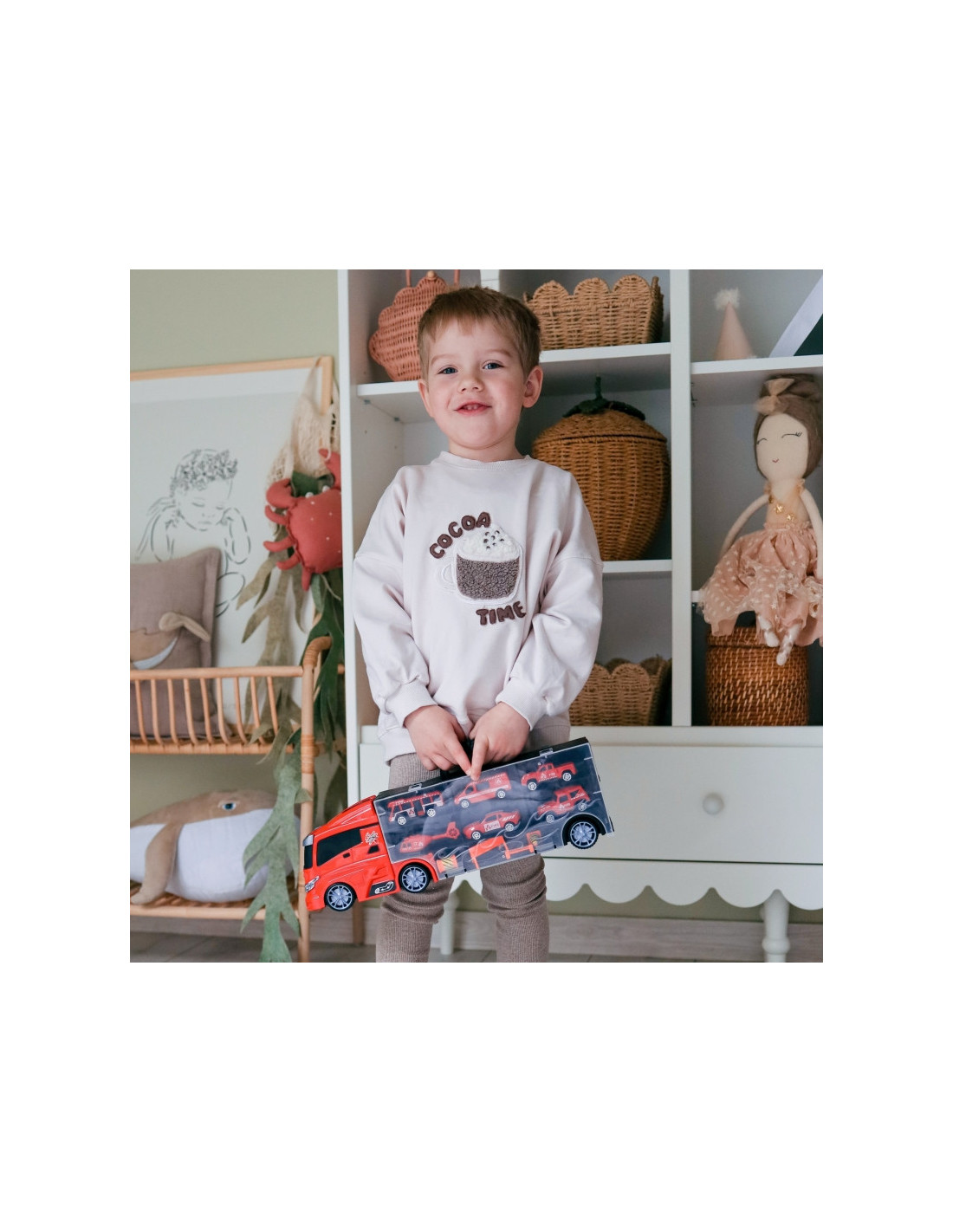 Ciężarówka Straż Pożarna 3w1 od marki WOOPIE To idealna zabawka dla każdego małego fana pojazdów Straży Pożarnej, transportu i akcji! Zestaw składa się z dużej lawety TIR, która pomieści w sobie aż 4 samochody straży pożarnej, helikopter oraz dodatkowe znaki ostrzegawcze, które dodają realizmu zabawie. Dzięki wyrzutni umieszczonej na lawecie, dzieci mogą wysunąć samochody i wystrzeliwać je na różne odległości. Laweta ma aż 40 cm długości, co sprawia, że jest wystarczająco duża, by pomieścić wszystkie pojazdy i akcesoria. Zestaw doskonale rozwija wyobraźnię dziecka, zachęcając do tworzenia własnych scenariuszy zabawy. Dzięki znakom ostrzegawczym mogą uczyć się podstaw bezpieczeństwa na drodze, co czyni zabawę zarówno edukacyjną, jak i pełną emocji.