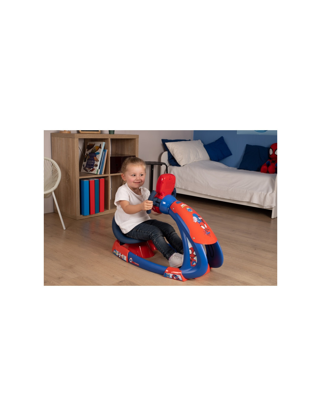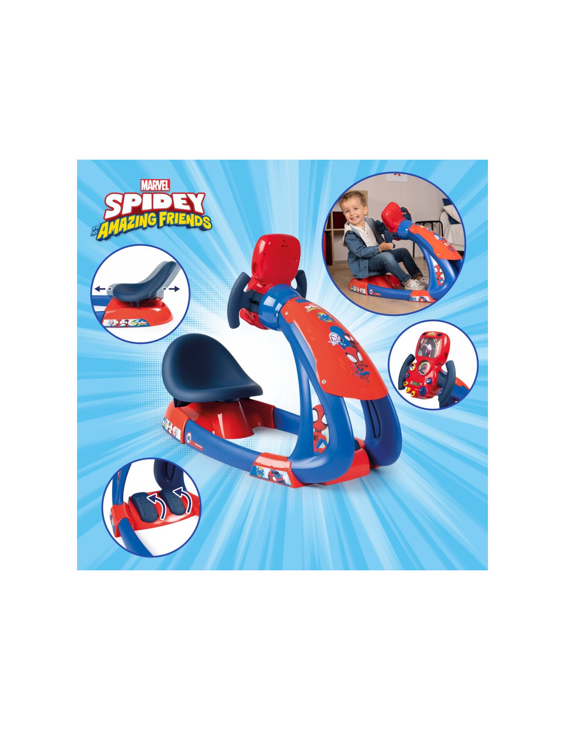 Smoby Symulator jazdy Spidey zaprasza dzieci od trzech lat na rajdową przygodę! Wyrusz w drogę pełną emocji i zaskakujących doznań z bohaterami animacji Spidey i super kumple. Wielofunkcyjny symulator stymuluje wyobraźnię i wspiera rozwój motoryczny dziecka. Elektroniczna kierownica z efektami świetlnymi i dźwiękowymi, interaktywny ekran oraz obrotomierz ze zmieniającą się drogą sprawiają, że zabawa nabiera realizmu. Aż 15 różnych dźwięków wzbogaca doświadczenie jazdy, przenosząc malucha w sam środek dynamicznych pościgów i wyścigów.