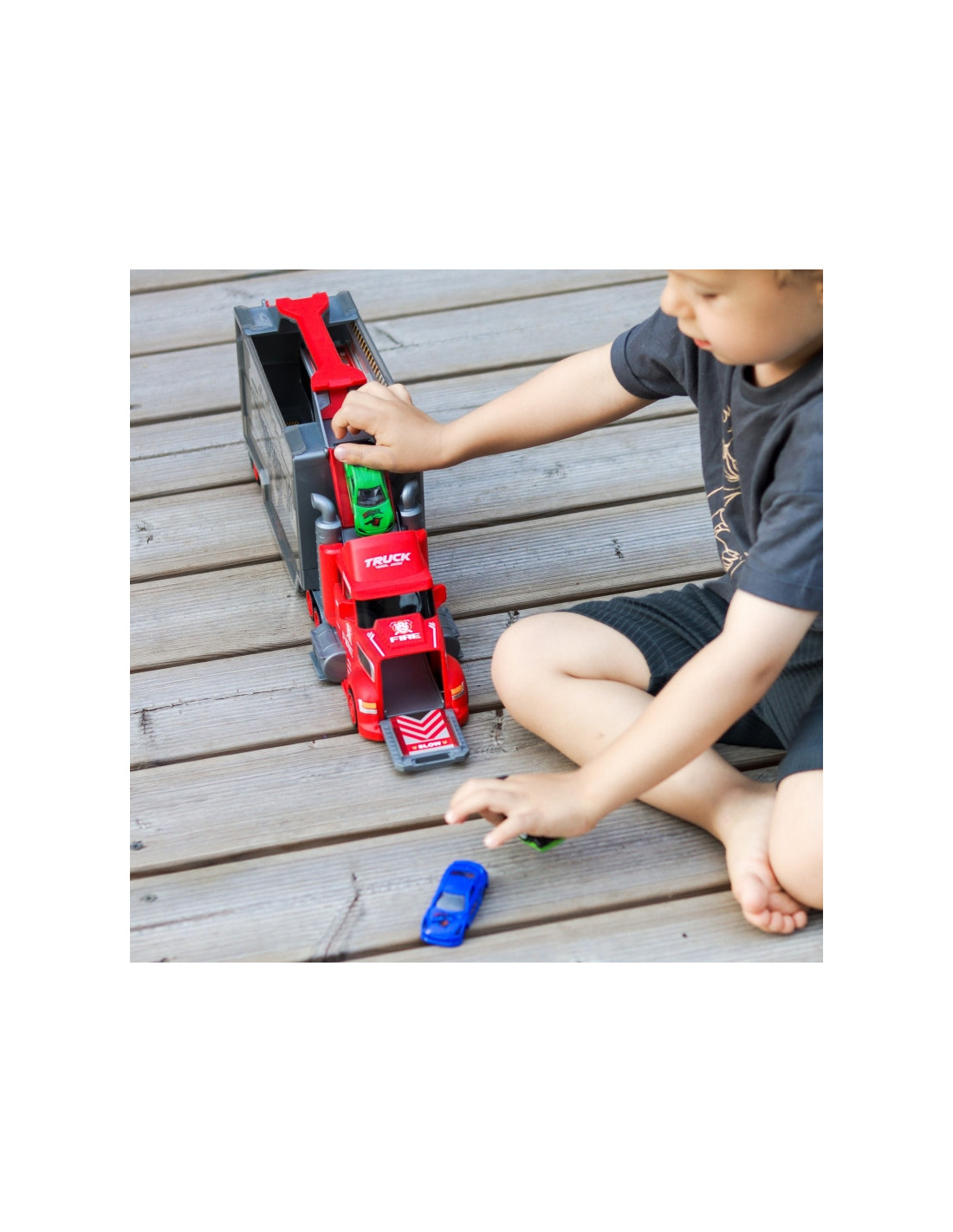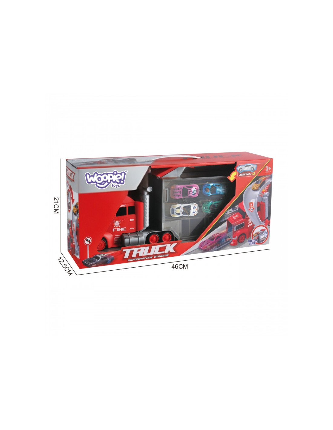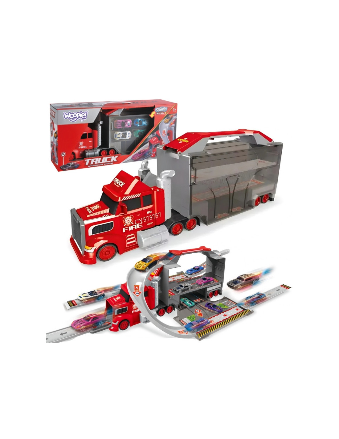 Oto niezwykle funkcjonalna i pełna emocjonującej zabawy ciężarówka strażacka z funkcją garażu i wyrzutni aut marki Woopie, która zaskoczy każdego małego fana motoryzacji! Ta transformująca się ciężarówka w jednej chwili może pełnić rolę klasycznej lawety transportowej, a po rozłożeniu zamienia się w rozbudowany tor wyścigowy z wyrzutnią samochodzików! Po otwarciu naczepy i rozłożeniu elementów, użytkownik zyskuje dostęp do garażu oraz toru wyścigowego, na którym można organizować emocjonujące wyścigi i pojedynki samochodowe. Dzięki dołączonym samochodzikom i interaktywnym elementom, dziecko może tworzyć ekscytujące scenariusze i rozwijać kreatywność. Zabawka gwarantuje wiele godzin świetnej zabawy