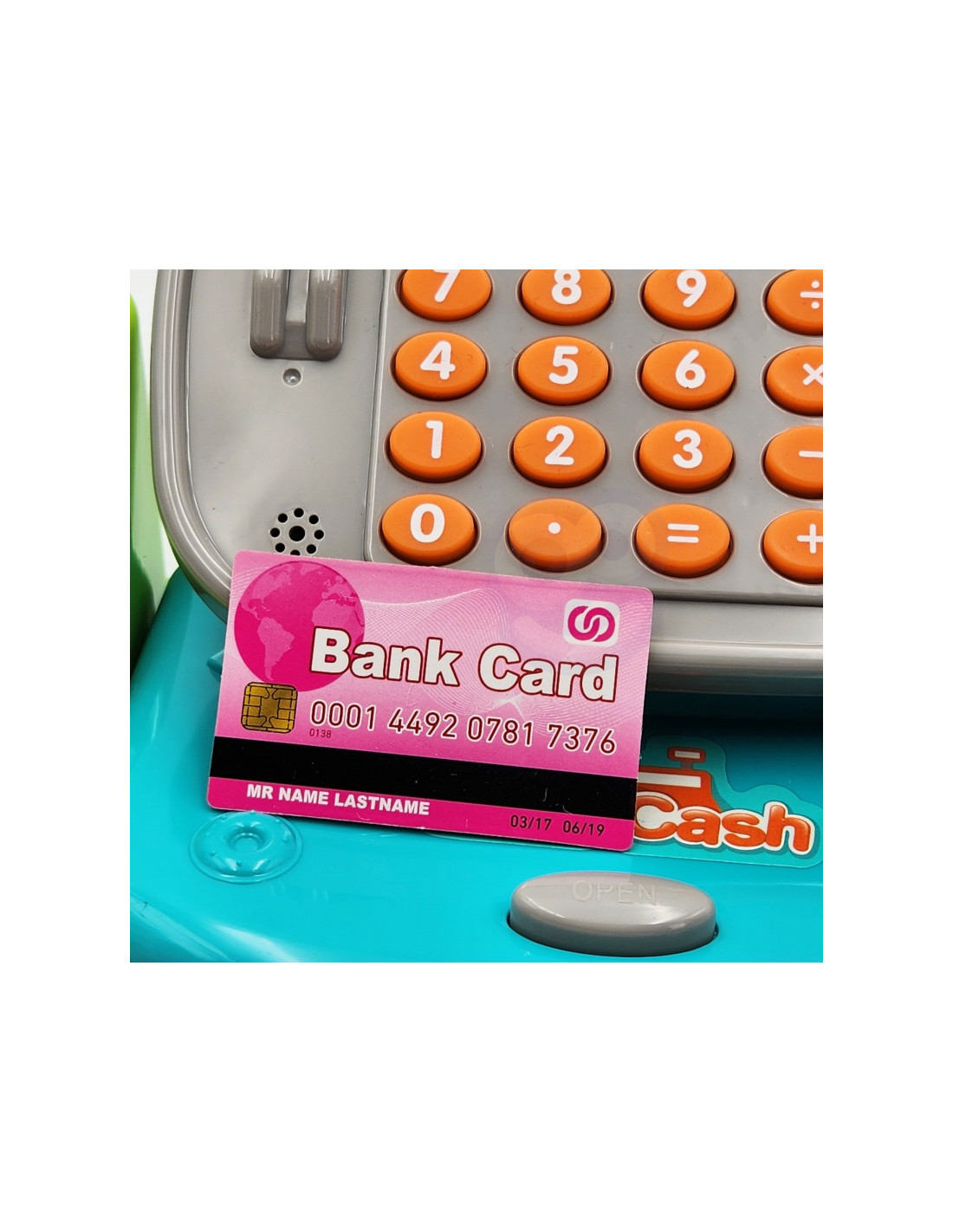 - - kasę sklepową z kalkulatorem i otwieraną kasetka na przechowywanie pieniążków,