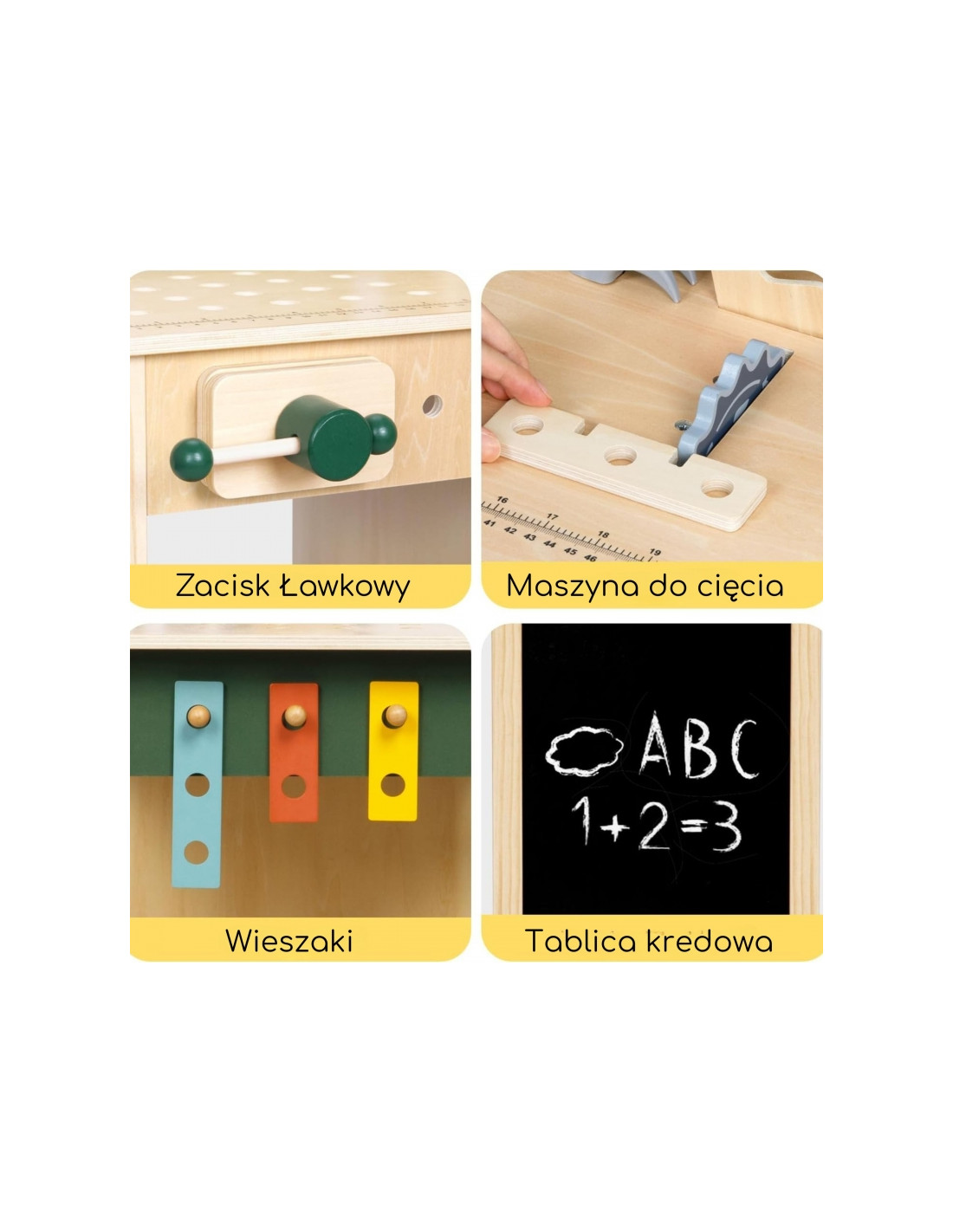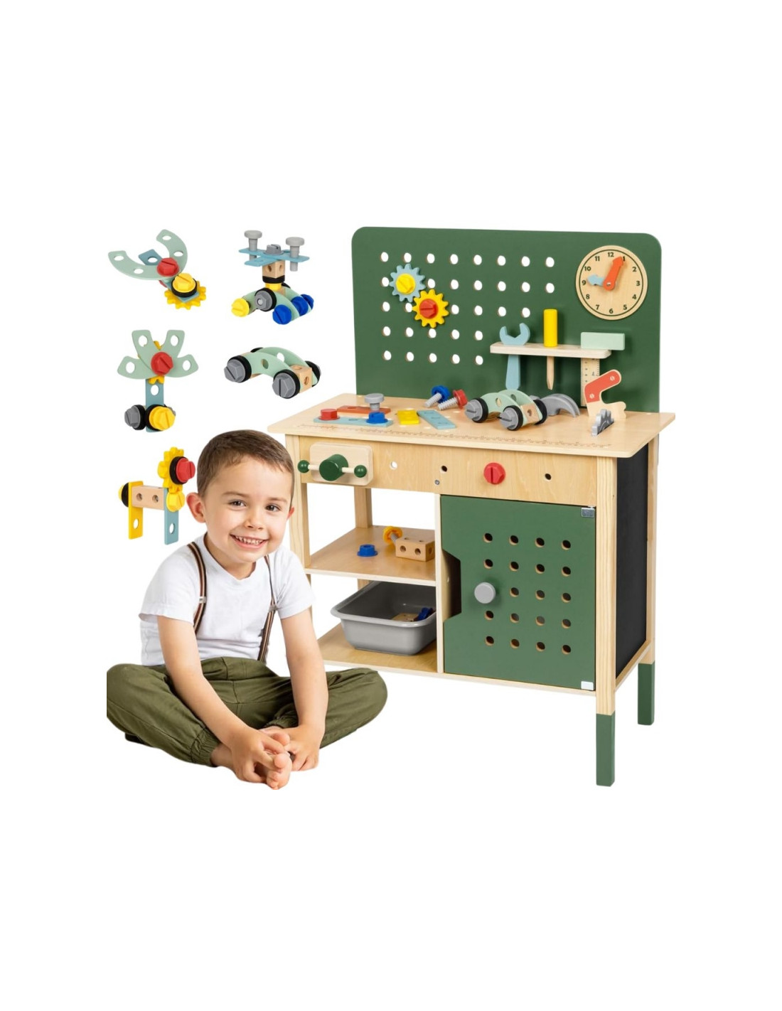 Drewniany warsztat majsterkowicza dla dzieci od Woopie Green to doskonała zabawka edukacyjna, która wprowadza najmłodszych w fascynujący świat konstruowania, napraw i odkrywania zasad działania narzędzi. Zestaw wykonany jest z wysokiej jakości drewna i bezpiecznych materiałów, gwarantując długą i bezpieczną zabawę. Dzięki licznym elementom i realistycznym detalom maluch może poczuć się jak prawdziwy mały inżynier lub konstruktor!Warsztat został wykonany z wysokiej jakości drewna, które jest przyjemne w dotyku, ekologiczne i w pełni bezpieczne dla dzieci. Starannie oszlifowane krawędzie i trwała konstrukcja gwarantują bezpieczeństwo i komfort podczas zabawy. Zabawka zachwyca dbałością o detale – znajdziesz tu prawdziwie wyglądające narzędzia, ruchome elementy, półki na akcesoria, a nawet zegar z obrotowymi wskazówkami i tablicę kredową do notowania pomysłów czy rysowania projektów. Każdy element został zaprojektowany z myślą o wszechstronnym rozwoju dziecka. Dzięki warsztatowi maluch poznaje zasady działania podstawowych narzędzi, rozwija zdolności manualne, uczy się logicznego myślenia i ćwiczy cierpliwość. To doskonały sposób, aby zachęcić dziecko do samodzielności i twórczego myślenia w codziennej zabawie.