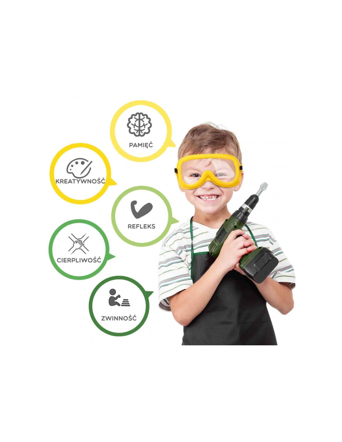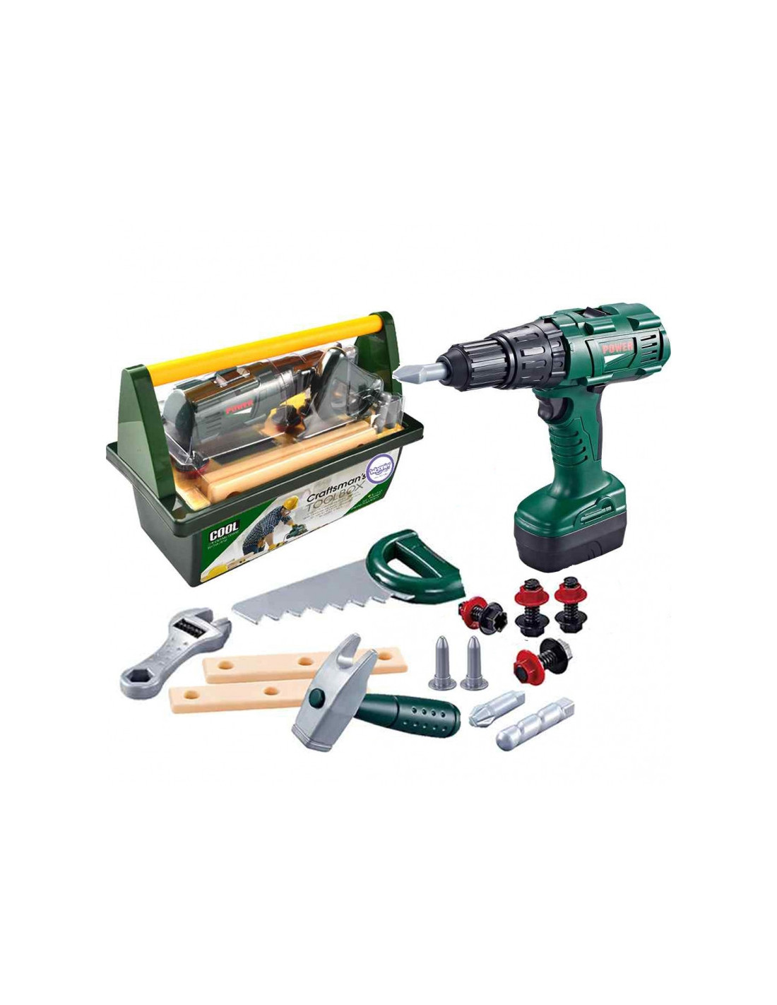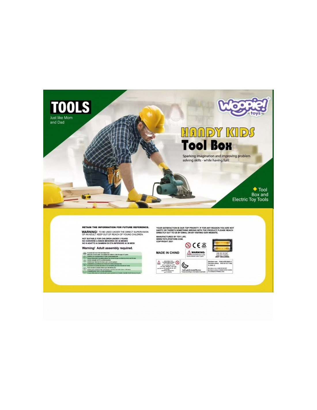 Skrzynka z narzędziami wraz z wkrętarko - wiertarką została stworzona przez uwielbianą przez dzieci firmę WOOPIE. W skład zestawu wchodzi ciemno-zielona, pojemna skrzynka na narzędzia z wygodną, żółtą rączką oraz 15 elementów. Wśród narzędzi dzieci odnajdą bezprzewodową wkrętarko-wiertarkę na baterie z 3 wymiennymi końcówkami. Wkrętarko-wiertarka naśladuje prawdziwe urządzenie, dzięki dźwiękom oraz obrotowemu wkrętowi. Ponadto w zestawie znajduje się piła z wygodnym uchwytem, młotek, klucz francuski, dwie plastikowe deseczki z otworami do wkręcania śrub (4 w zestawie) lub wbijania gwoździ (2 w zestawie). Ten zestaw zapewni wspaniałą zabawę każdemu małemu majsterkowiczowi, wspomagając przy tym rozwój zdolności manualnych.