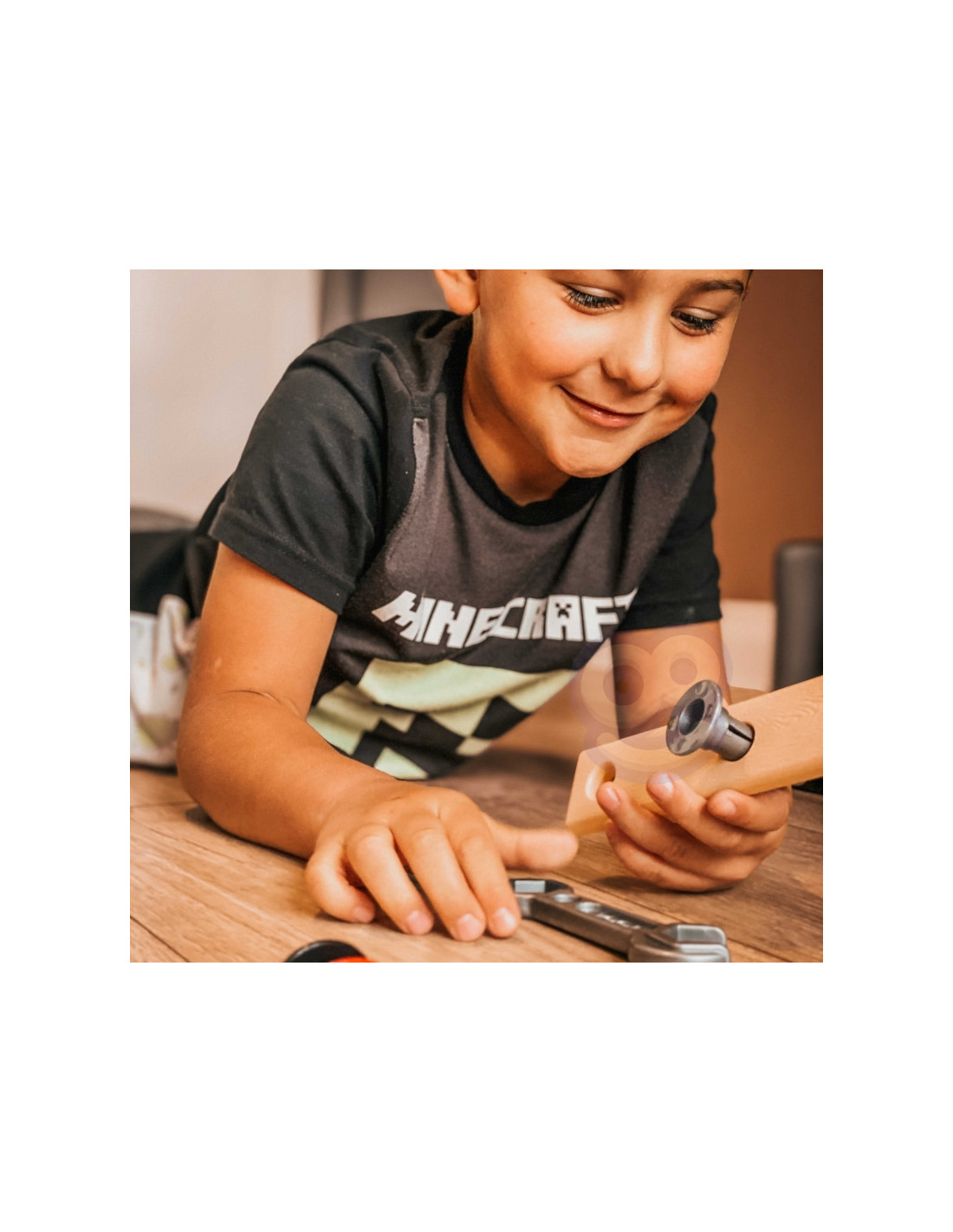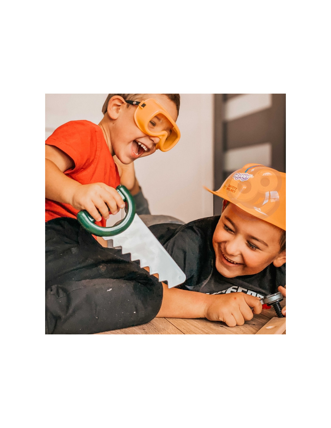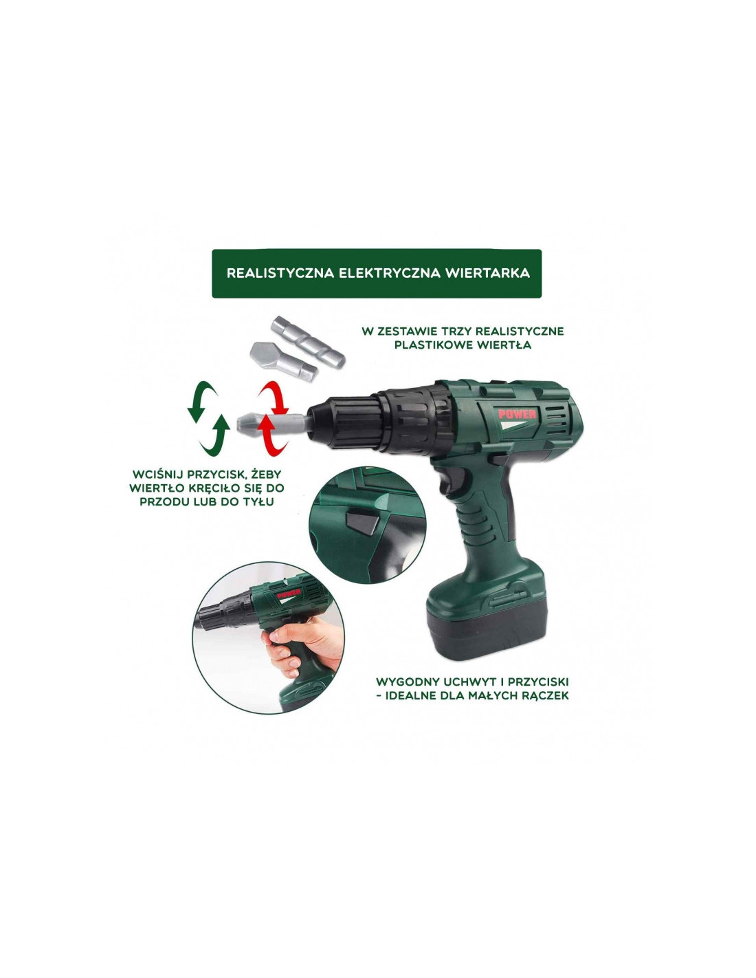 Skrzynka z narzędziami wraz z wkrętarko - wiertarką została stworzona przez uwielbianą przez dzieci firmę WOOPIE. W skład zestawu wchodzi ciemno-zielona, pojemna skrzynka na narzędzia z wygodną, żółtą rączką oraz 15 elementów. Wśród narzędzi dzieci odnajdą bezprzewodową wkrętarko-wiertarkę na baterie z 3 wymiennymi końcówkami. Wkrętarko-wiertarka naśladuje prawdziwe urządzenie, dzięki dźwiękom oraz obrotowemu wkrętowi. Ponadto w zestawie znajduje się piła z wygodnym uchwytem, młotek, klucz francuski, dwie plastikowe deseczki z otworami do wkręcania śrub (4 w zestawie) lub wbijania gwoździ (2 w zestawie). Ten zestaw zapewni wspaniałą zabawę każdemu małemu majsterkowiczowi, wspomagając przy tym rozwój zdolności manualnych.