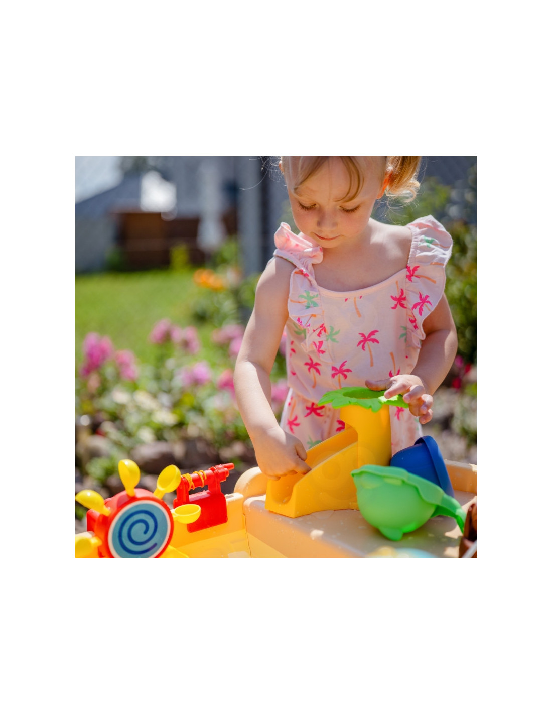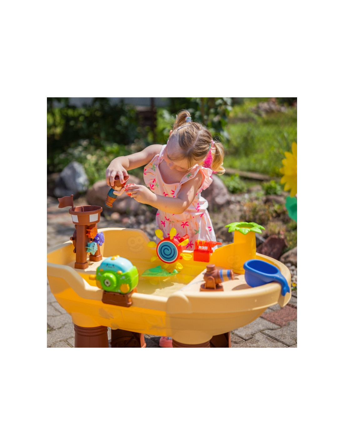Stolik Wodny Piracka Łódź marki Woopie to niezwykła zabawka, która przenosi dzieci w świat pirackich przygód i zapewnia godziny kreatywnej zabawy na świeżym powietrzu. Dzięki bogatemu zestawowi kolorowych akcesoriów, ruchomym elementom i pirackiej wieży maluchy mogą eksperymentować z wodą, bawić się bąbelkami, kręcić kołem wodnym i odkrywać mnóstwo możliwości zabawy. Prosta, solidna konstrukcja oraz duże rozmiary sprawiają, że stolik jest wygodny i atrakcyjny nawet dla kilku dzieci jednocześnie.