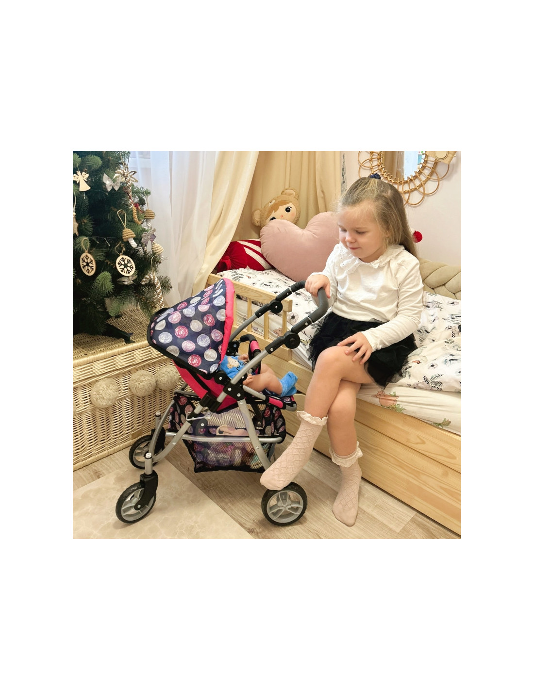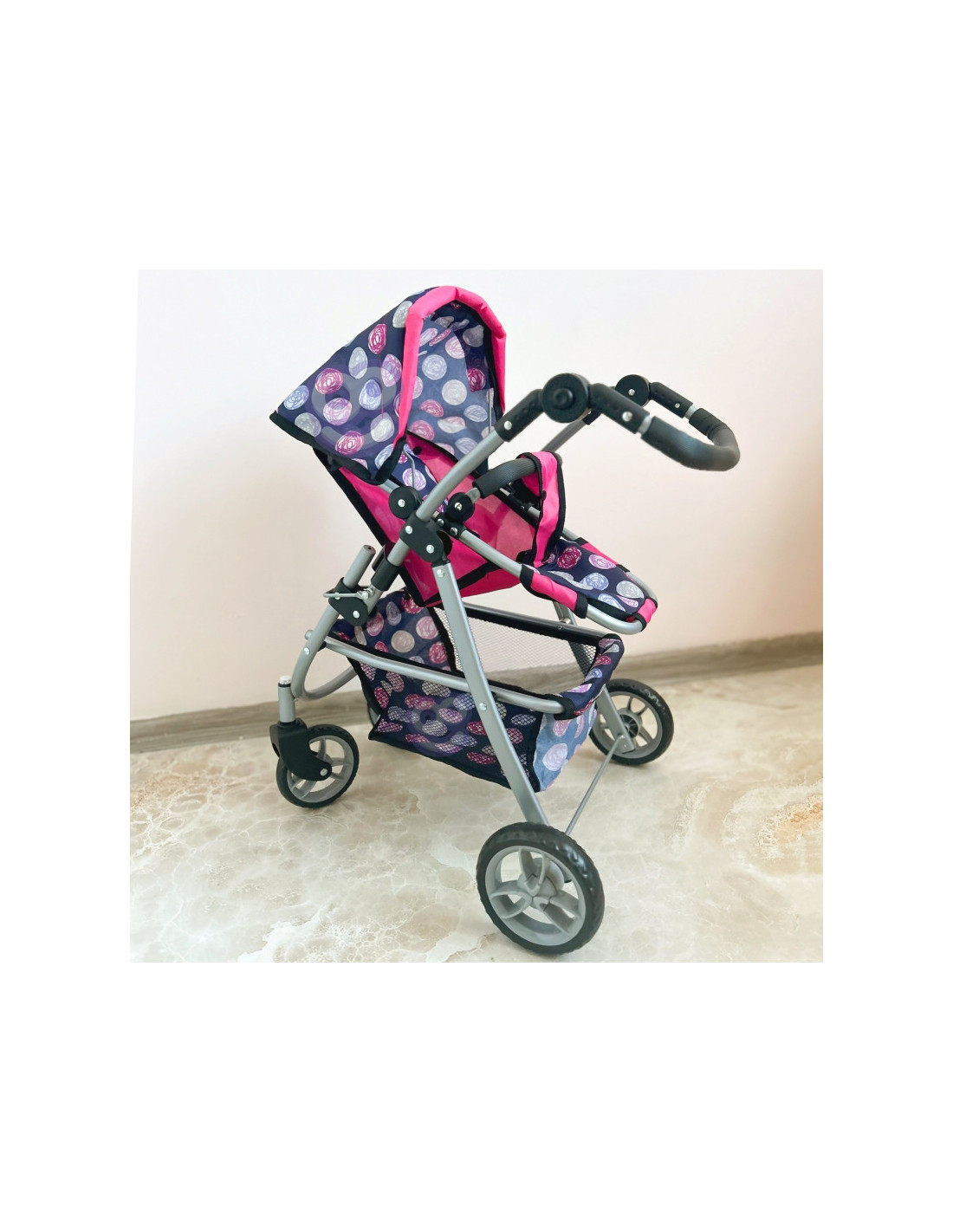 Stylowy i funkcjonalny wózek dla lalek od marki WOOPIE to wymarzony prezent każdej małej miłośniczki zabawy lalkami. Dzięki regulowanemu siedzisku można go łatwo dostosować do różnych potrzeb zabawy, umożliwiając przewożenie ulubionych lalek. Obracające się przednie koła gwarantują płynność prowadzenia, a solidna konstrukcja zapewnia stabilność podczas spacerów. Wózek wyposażono w miękką, wygodną rączkę i pojemny koszyk na akcesoria, który pomieści wszystkie drobiazgi niezbędne podczas zabawy. Składany daszek chroni lalki przed "słońcem", a kompaktowa konstrukcja sprawia, że wózek łatwo przechowywać, gdy zabawa dobiegnie końca.