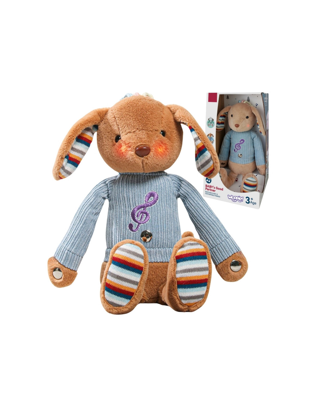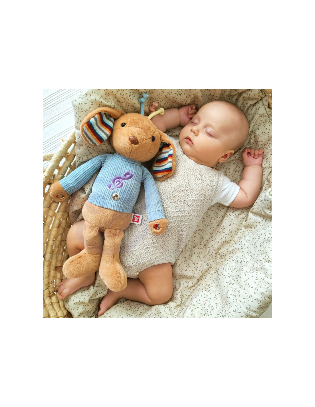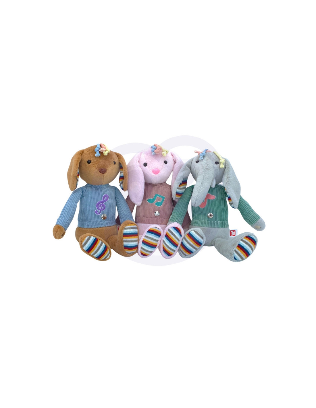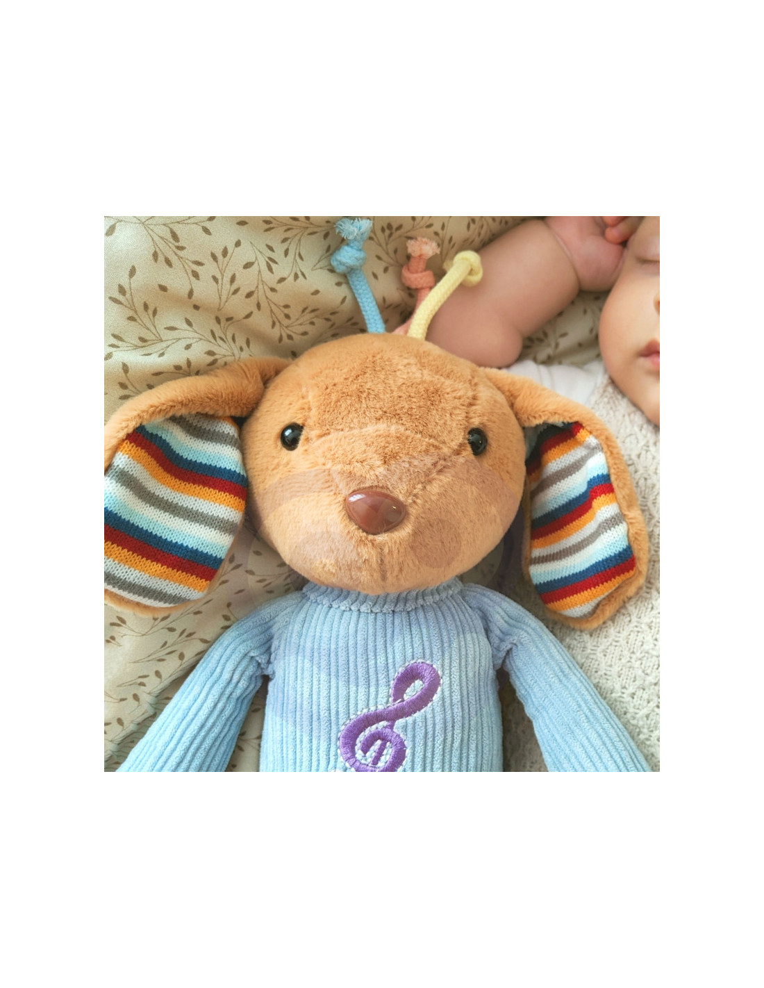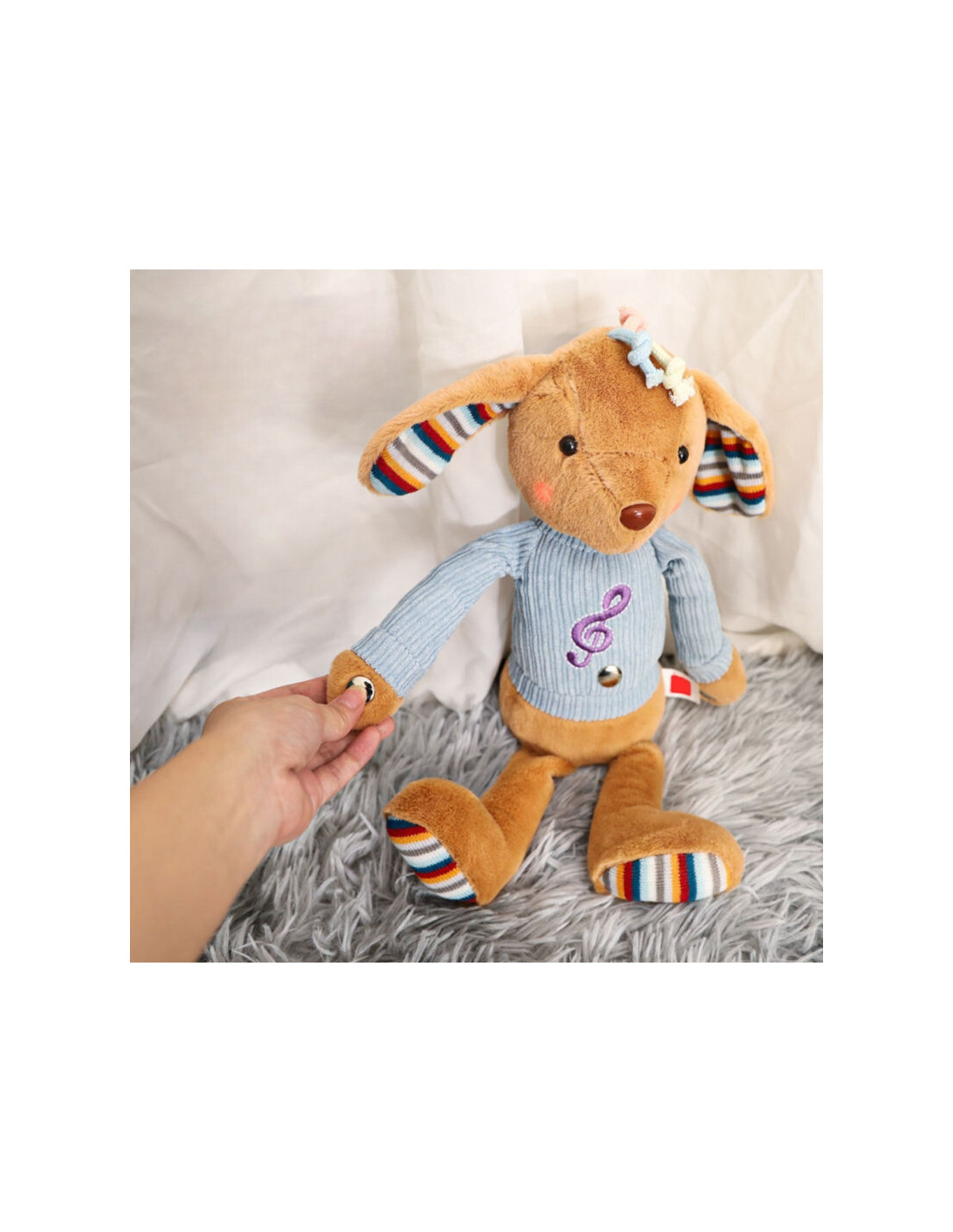 Przytulanka jest wyposażone w trzy strefy sensoryczne - na łapkach i brzuszku, których dotyk zamienia się w muzykę. A jego różowe policzki są oświetlone, tworząc prawdziwą bajeczną atmosferę wokół zabawki. Przytulanka ubrana jest w sweterek pod którym schowane jest miejsce na 3 baterie.Ten miękki w dotyku piesek stanie się przyjacielem dziecka na wiele lat.