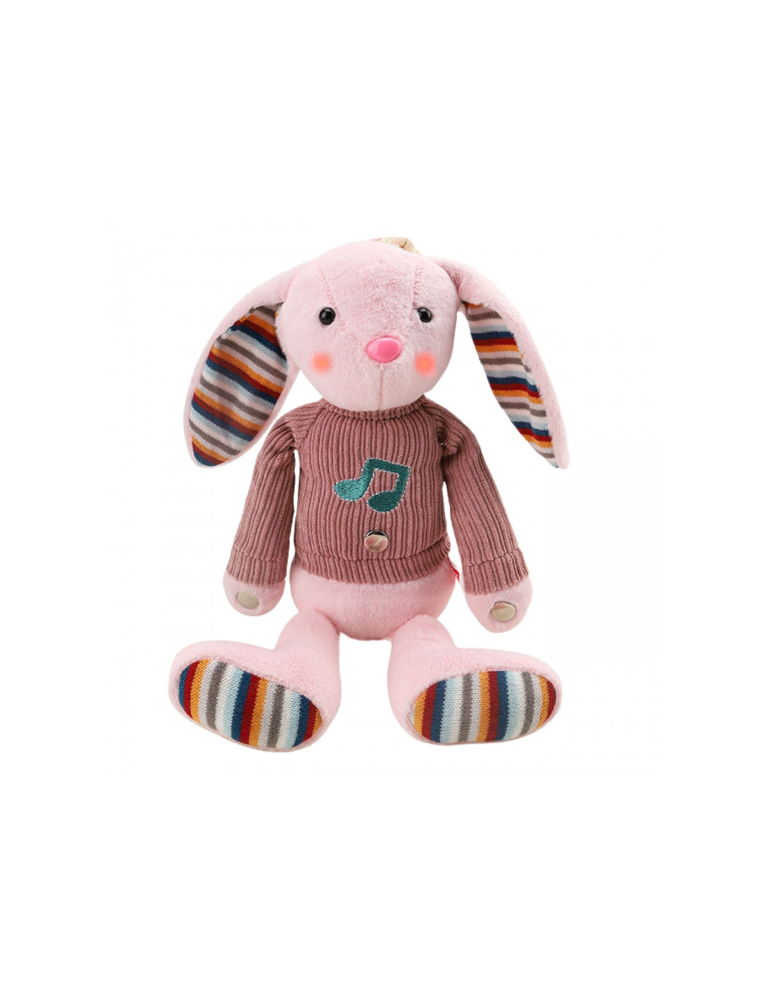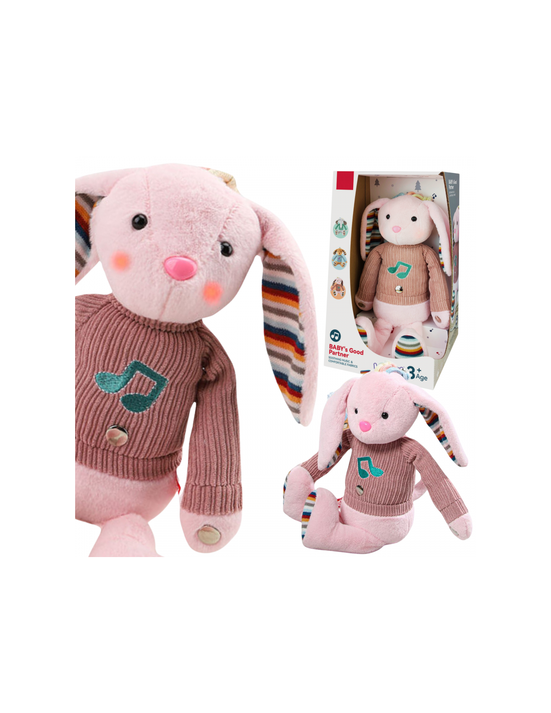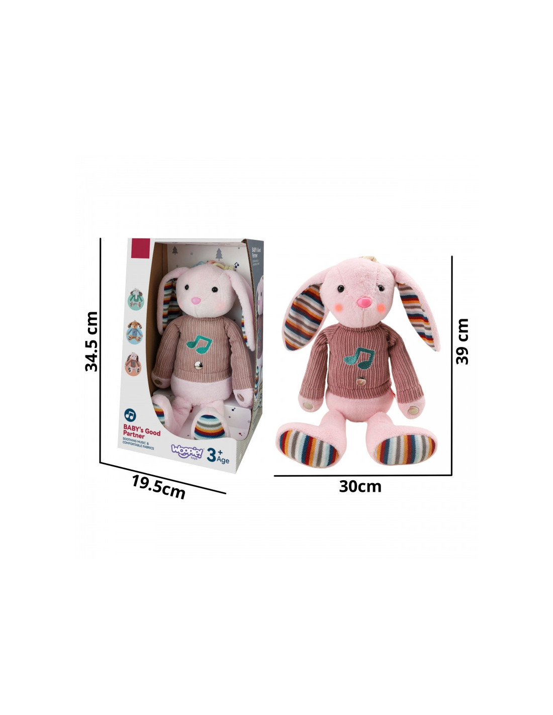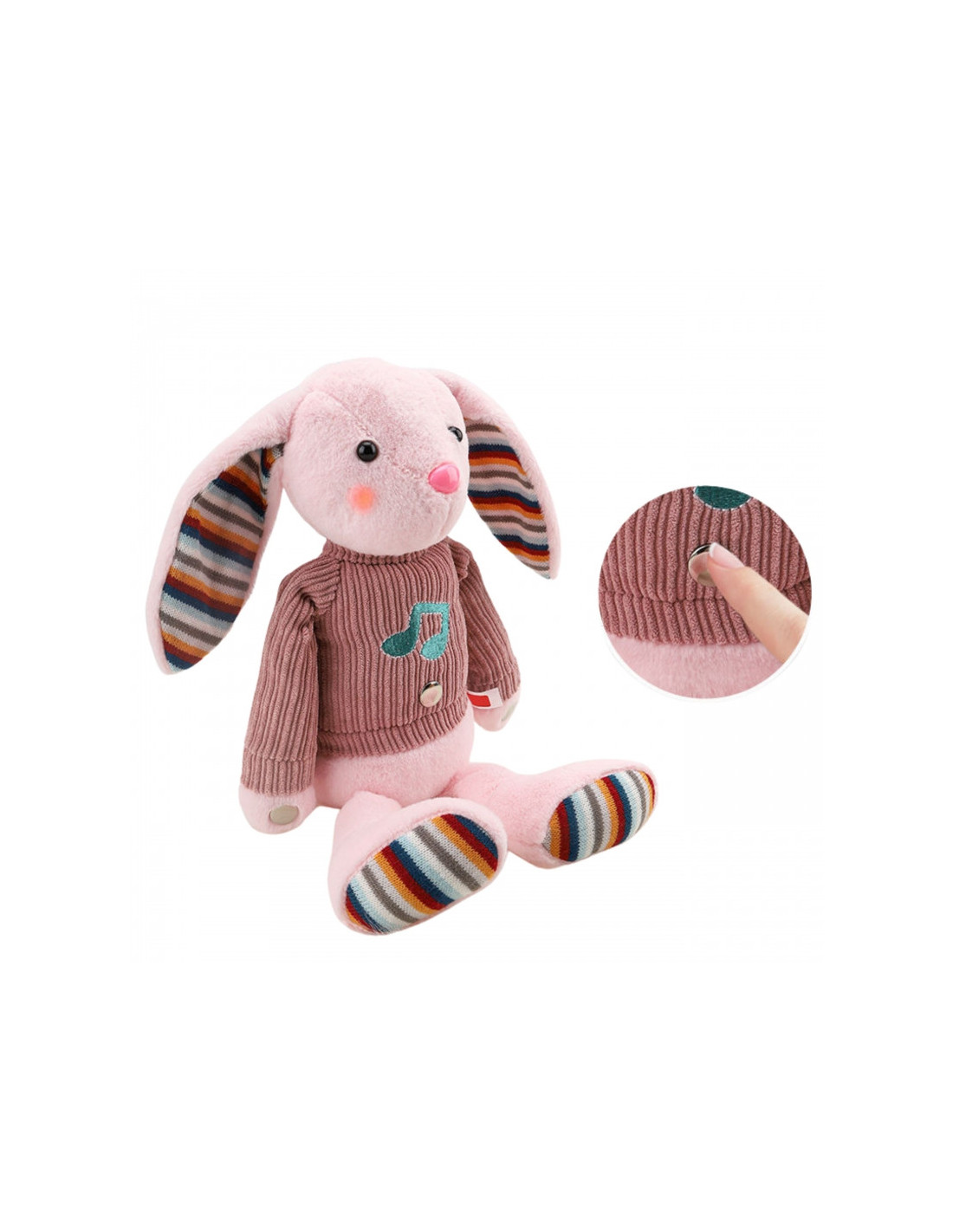 Przytulanka jest wyposażone w trzy strefy sensoryczne - na łapkach i brzuszku, których dotyk zamienia się w muzykę. A jego różowe policzki są oświetlone, tworząc prawdziwą bajeczną atmosferę wokół zabawki. Przytulanka ubrana jest w sweterek pod którym schowane jest miejsce na 3 baterie.Ten miękki w dotyku króliczek stanie się przyjacielem dziecka na wiele lat.