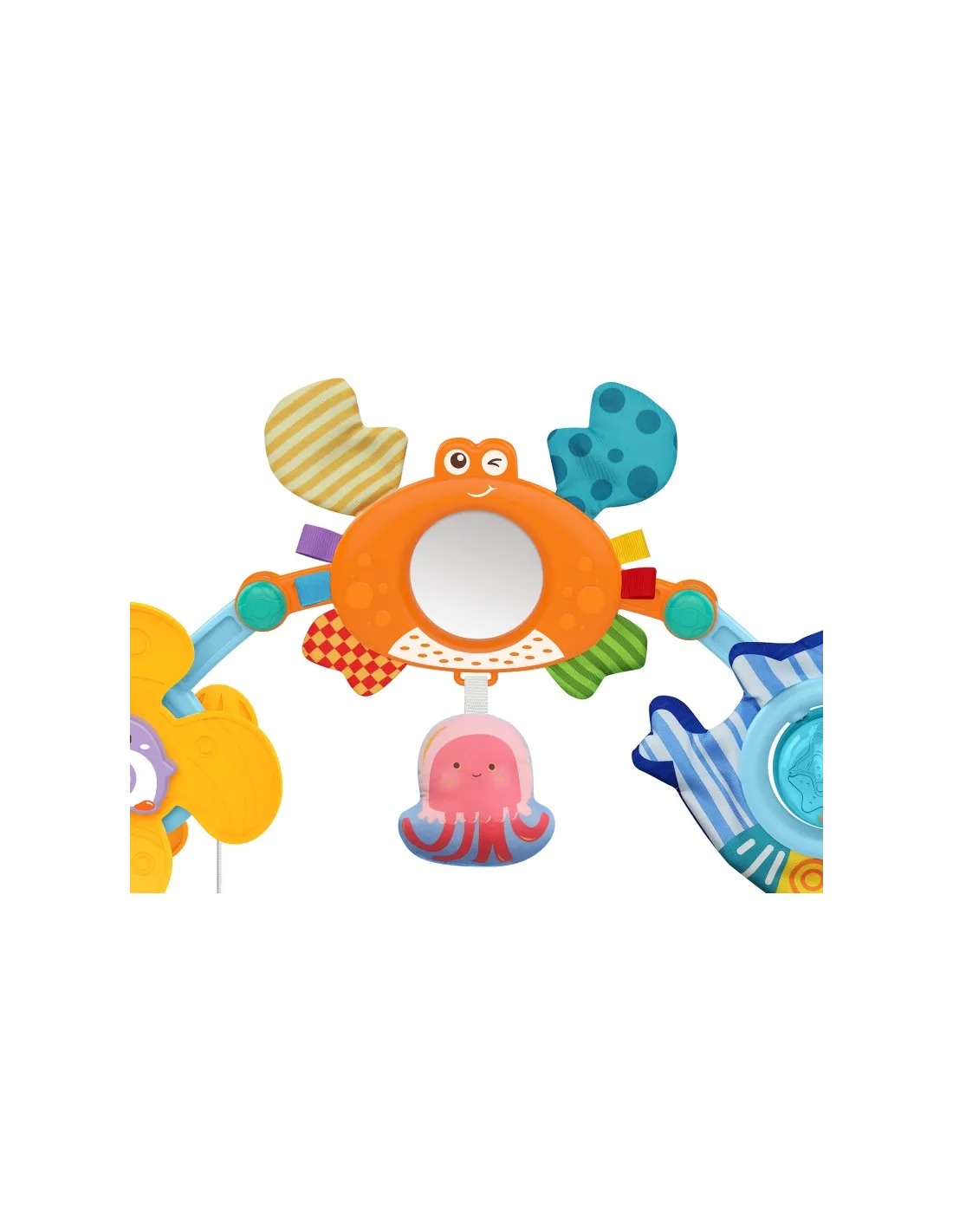 Повязка на голову "Игрушечная арка " от WOOPIE - это универсальная игрушка, которая придаст шарм и развлечет любую коляску, автокресло или кроватку. Она очень гибкая, поэтому Вы можете легко прикрепить ее практически в любом месте. На повязке есть различные морские игрушки: ветряная мельница-пингвин, краб-ласточка, осьминог, акула-погремушка и дельфин-подвеска, которые реагируют на взаимодействие с ребенком, а также подвески в форме звездочек. Каждая из этих игрушек имеет различную текстуру и действие, что стимулирует чувство осязания ребенка и помогает развивать его моторику.