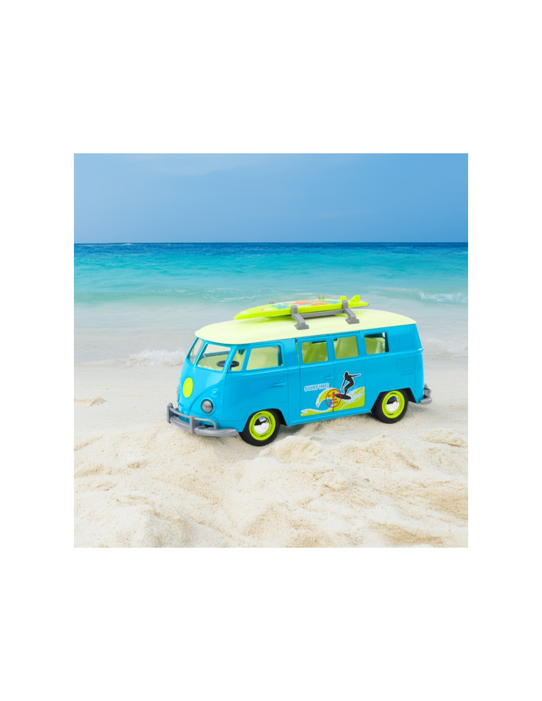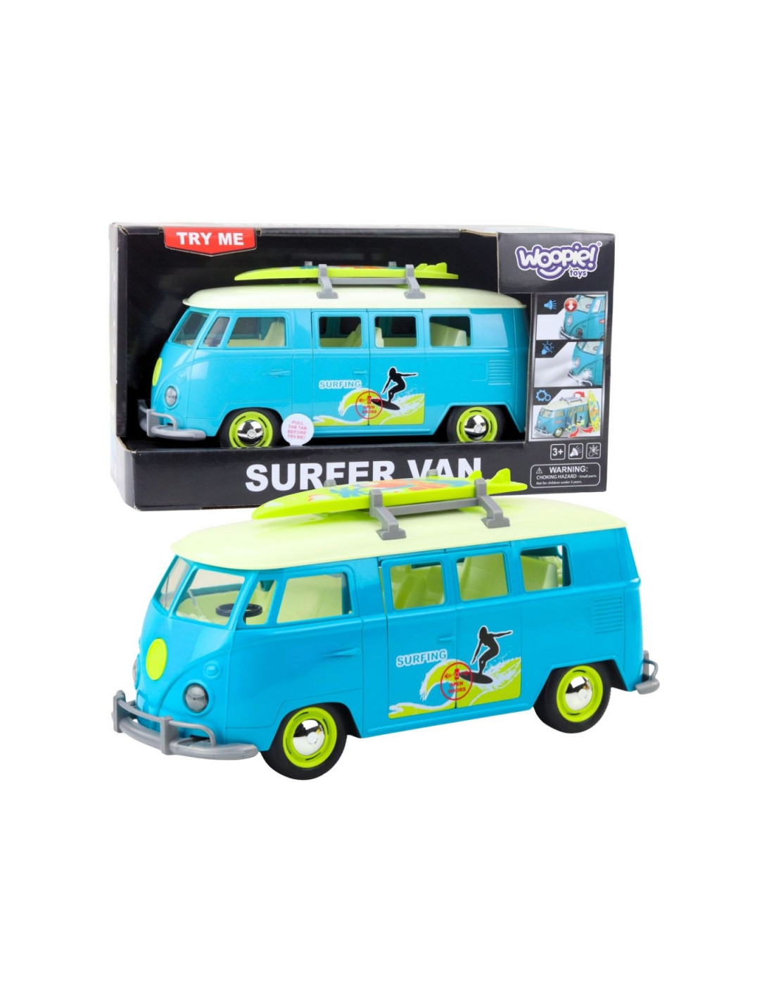 Классический минивэн Bus Surfing Van от Woopie — настоящий подарок для любого автолюбителя и ценителя ретро. Эта модель сине-белого микроавтобуса с доской для сёрфинга на крыше выглядит невероятно реалистично и доставит вас прямо на солнечный пляж. Автомобиль оснащен световыми и звуковыми эффектами , которые активируются при нажатии, обеспечивая ещё более захватывающие ощущения. Открывающиеся боковые двери позволяют заглянуть в салон, что добавляет реализма. Созданный с особым вниманием к деталям , он идеально подходит как для игры, так и для коллекционирования.