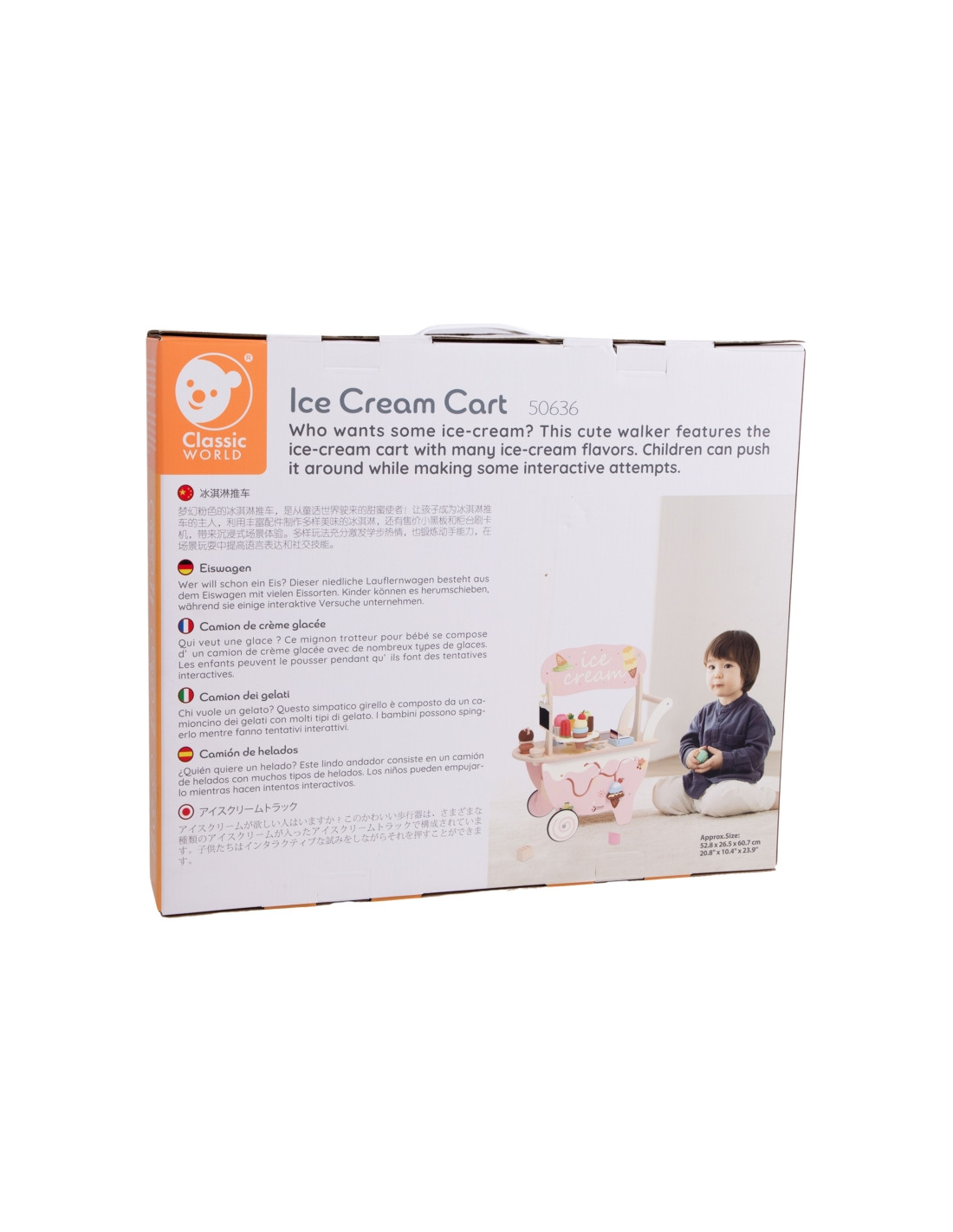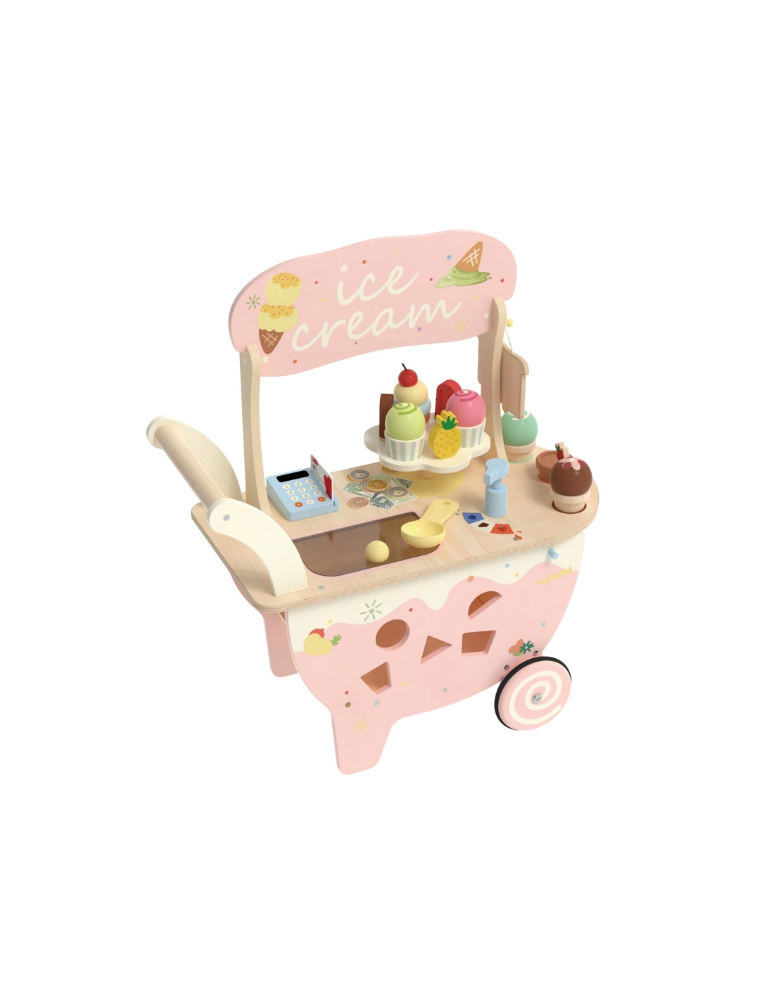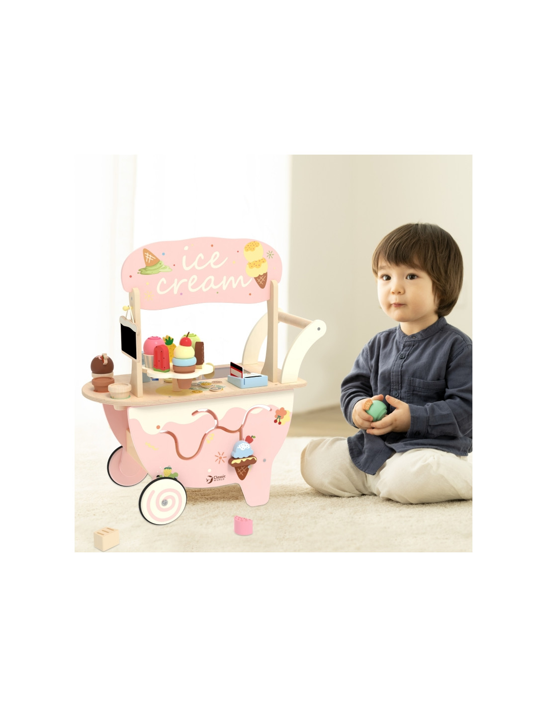 Превратите комнату вашего ребёнка в сладкое кафе-мороженое! Эта деревянная стойка на колёсиках от Classic World — уникальная игрушка «3 в 1»: она одновременно является и развивающей игрушкой, и кафе-мороженым. Благодаря широкому выбору аксессуаров ваш малыш сможет угощать малыша разными вкусами мороженого, развивая творческие способности и социальные навыки. Идеально подходит для детей, которые учатся ходить и любят ролевые игры.