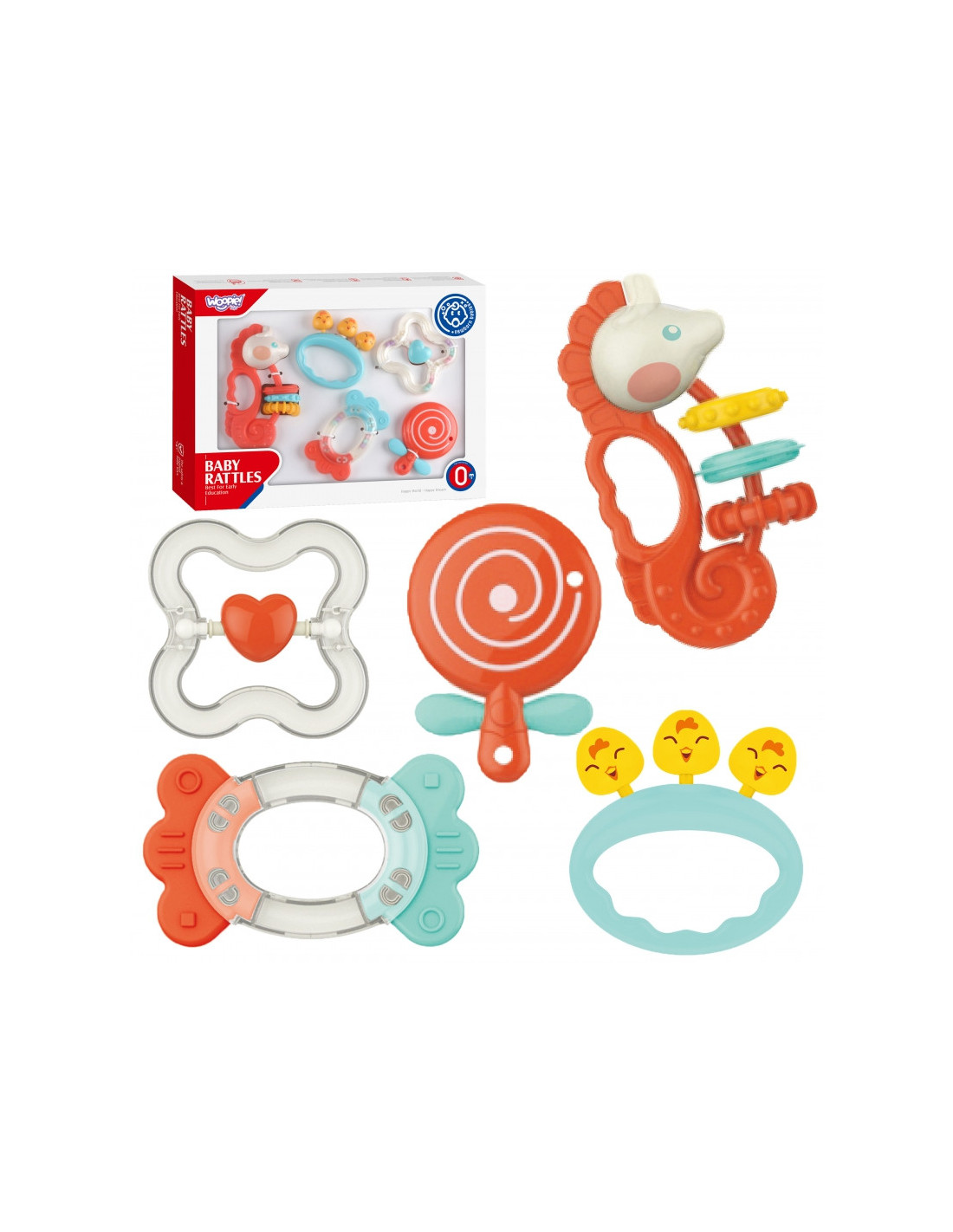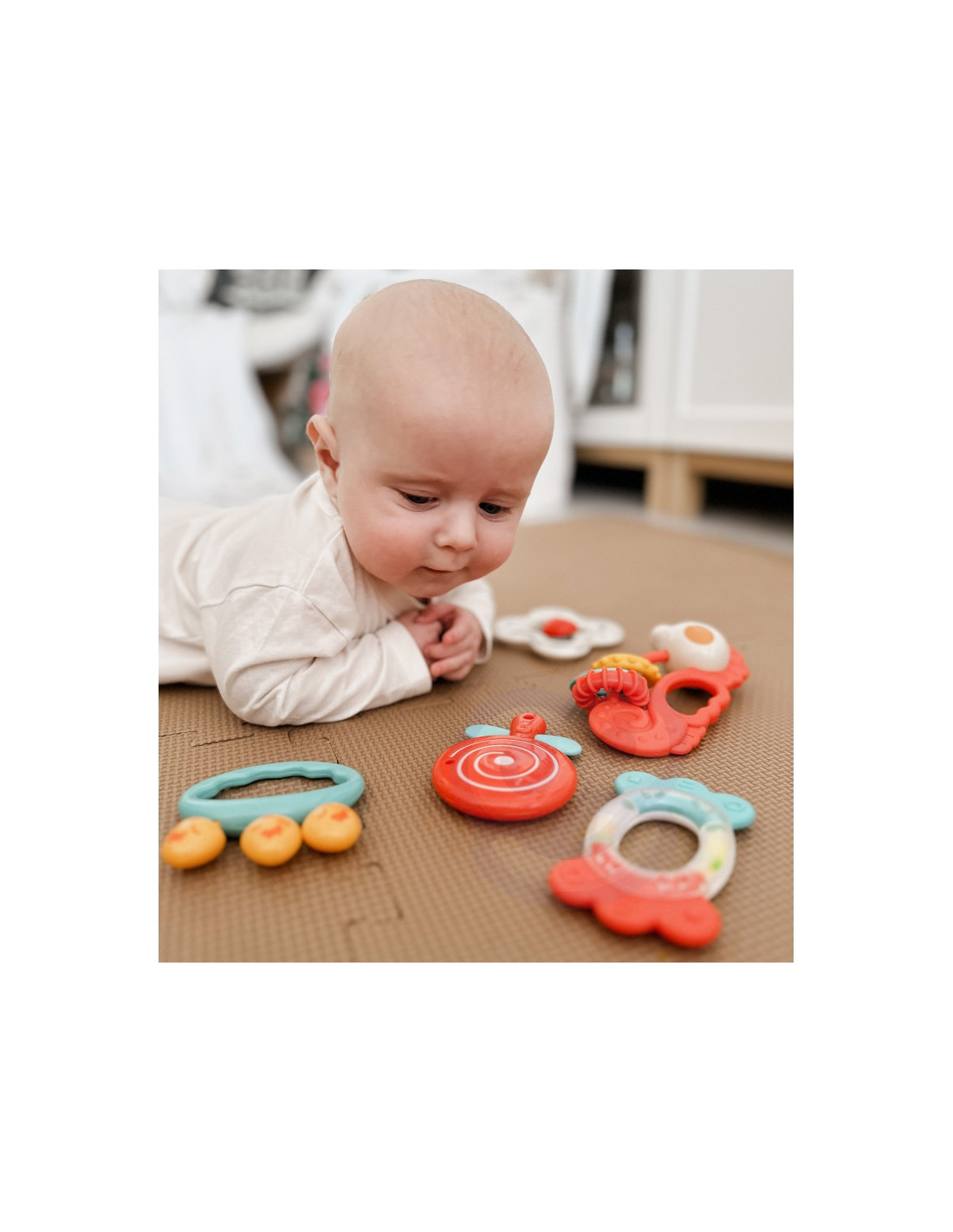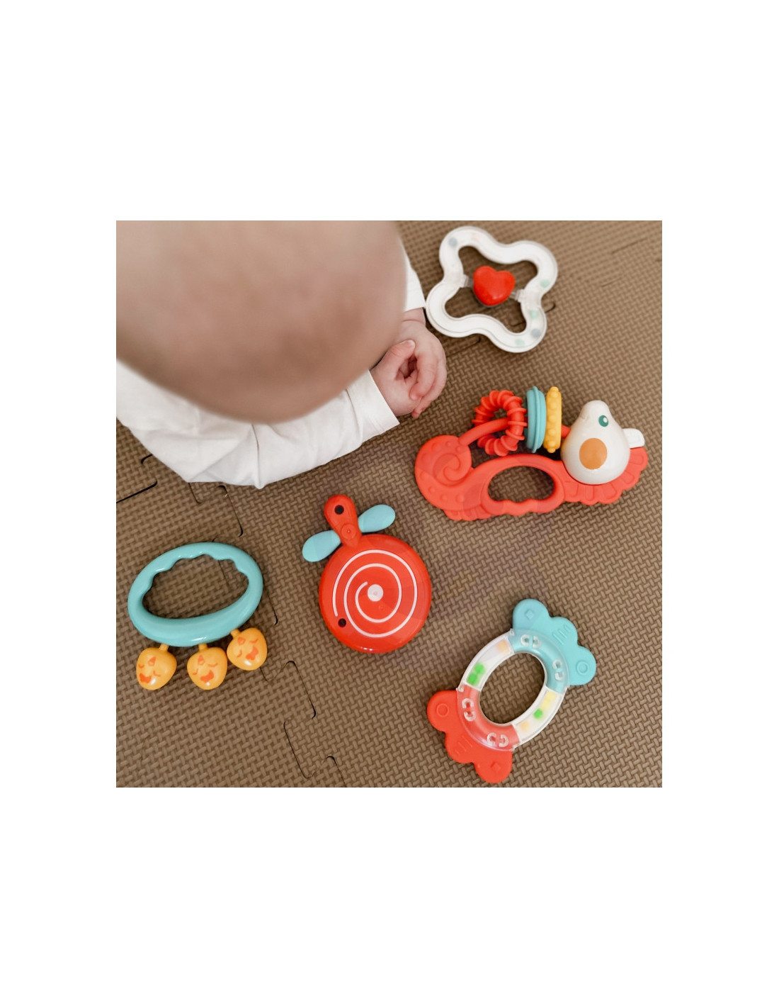 Набор BabyChews-Rattles от бренда WOOPIE содержит 5 разноцветных деталей, призванных помочь Вашему малышу во время прорезывания зубов. Прорезыватели не только приносят облегчение больным деснам, но и стимулируют зрительное и слуховое развитие. Кроме того, разминаемая и выпуклая форма и различные текстуры стимулируют развитие чувства осязания.