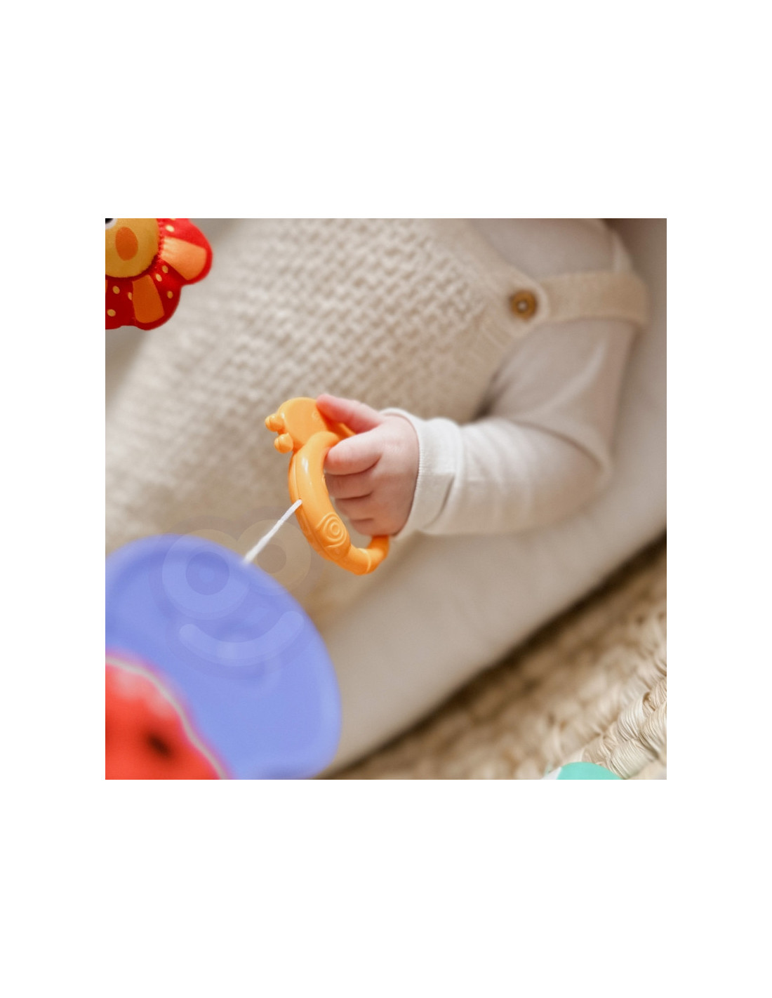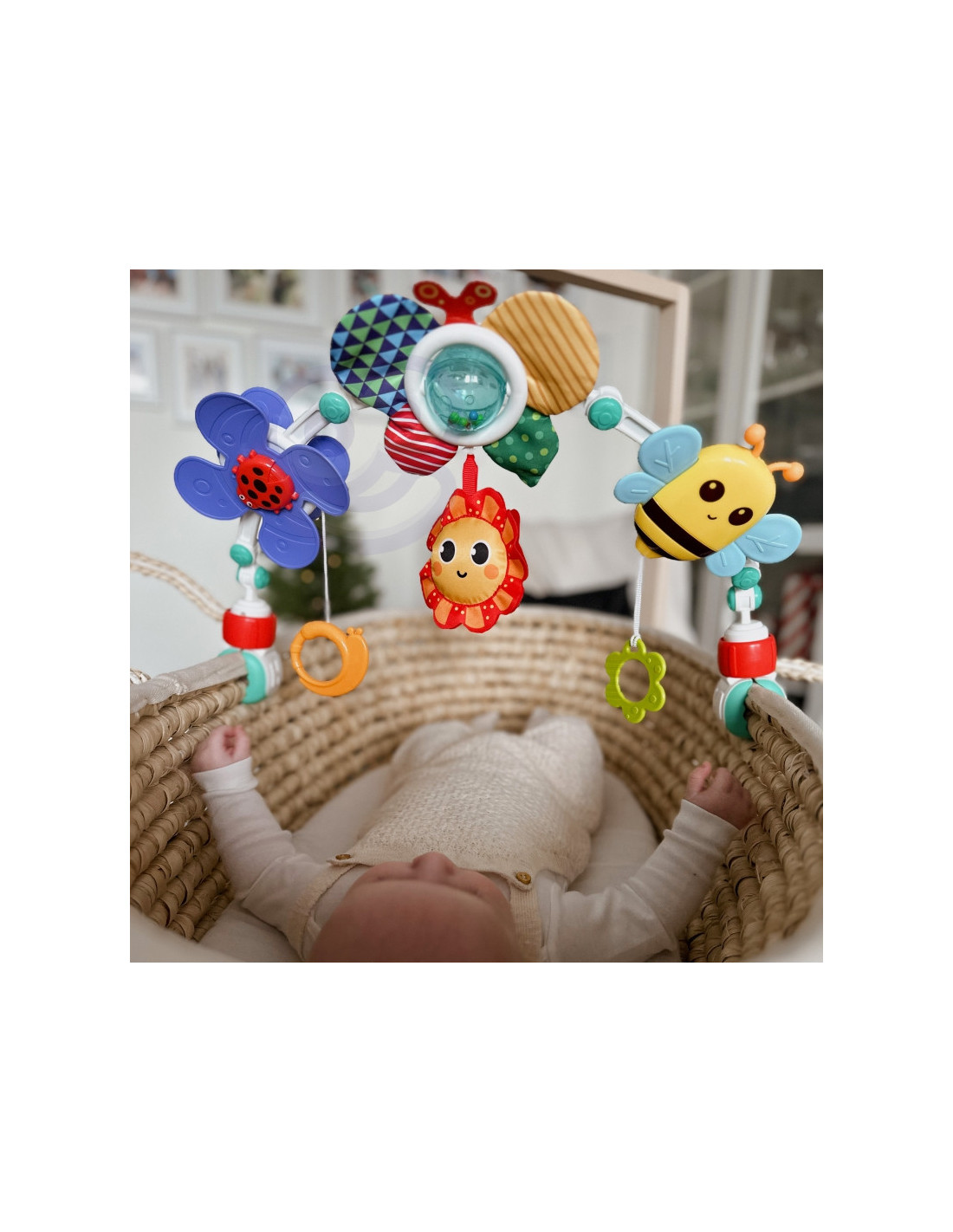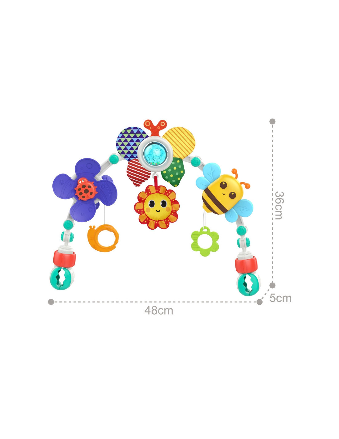Повязка на голову "Игрушечная арка " от WOOPIE - это универсальная игрушка, которая придаст шарм и развлечет любую коляску, автокресло или кроватку. Она очень гибкая, поэтому Вы можете легко прикрепить ее практически в любом месте. На ободке есть различные игрушки: ветряная мельница в виде божьей коровки, которая крутится и вертится, когда ее приводят в движение, солнышко, которое пищит, когда его сжимают, погремушка в виде бабочки с прозрачным шариком, в котором прыгают разноцветные шарики и шуршит ткань, бирка в виде улитки и цветок, который можно использовать в качестве прорезывателя. Каждая из этих игрушек имеет различную текстуру, что стимулирует чувство осязания малыша и помогает развивать его моторику.