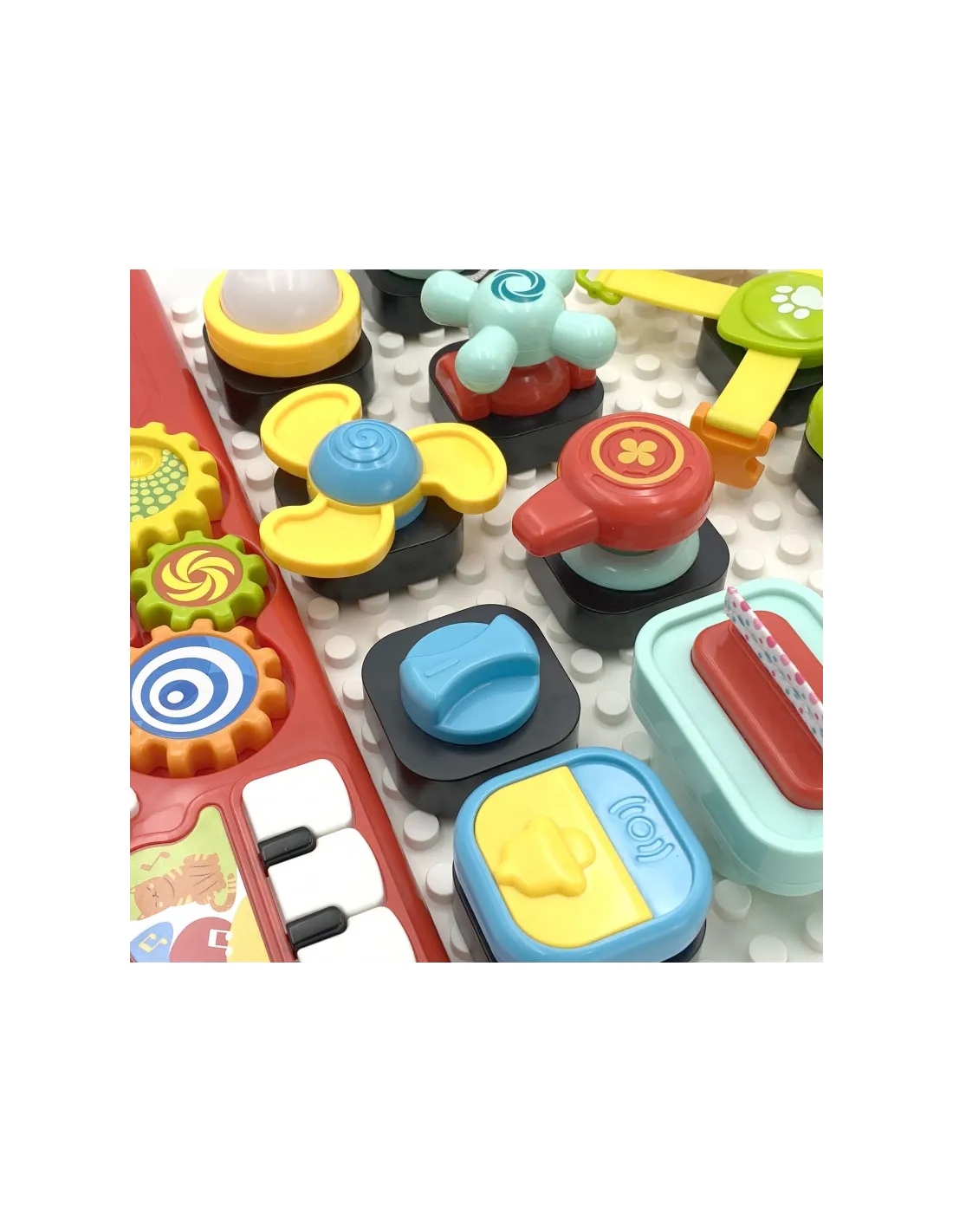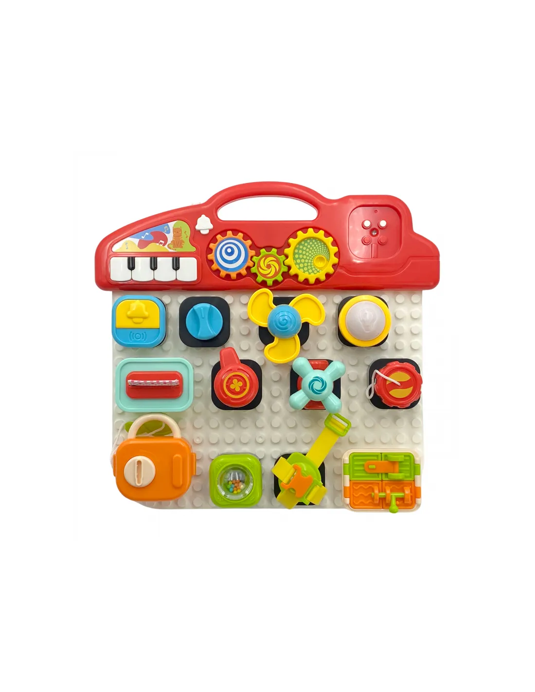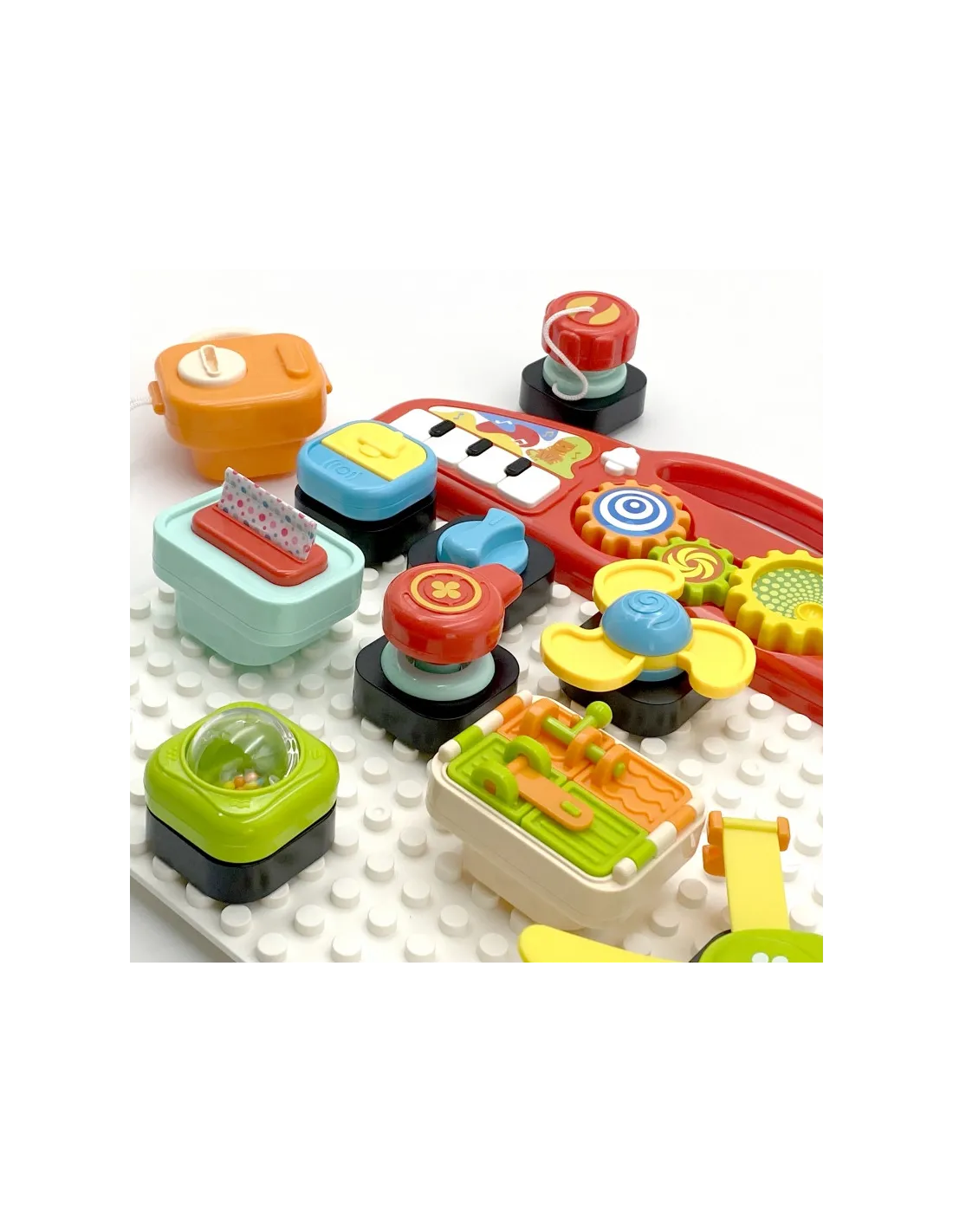 Прикрепляемые кирпичики включают в себя всевозможные переключатели, ручки, кнопки, съемные салфетки, навесной замок с ключом и открывающиеся окна-слайдеры. Они развивают моторные, когнитивные и сенсорные навыки ребенка, а также тренируют зрительно-моторную координацию.