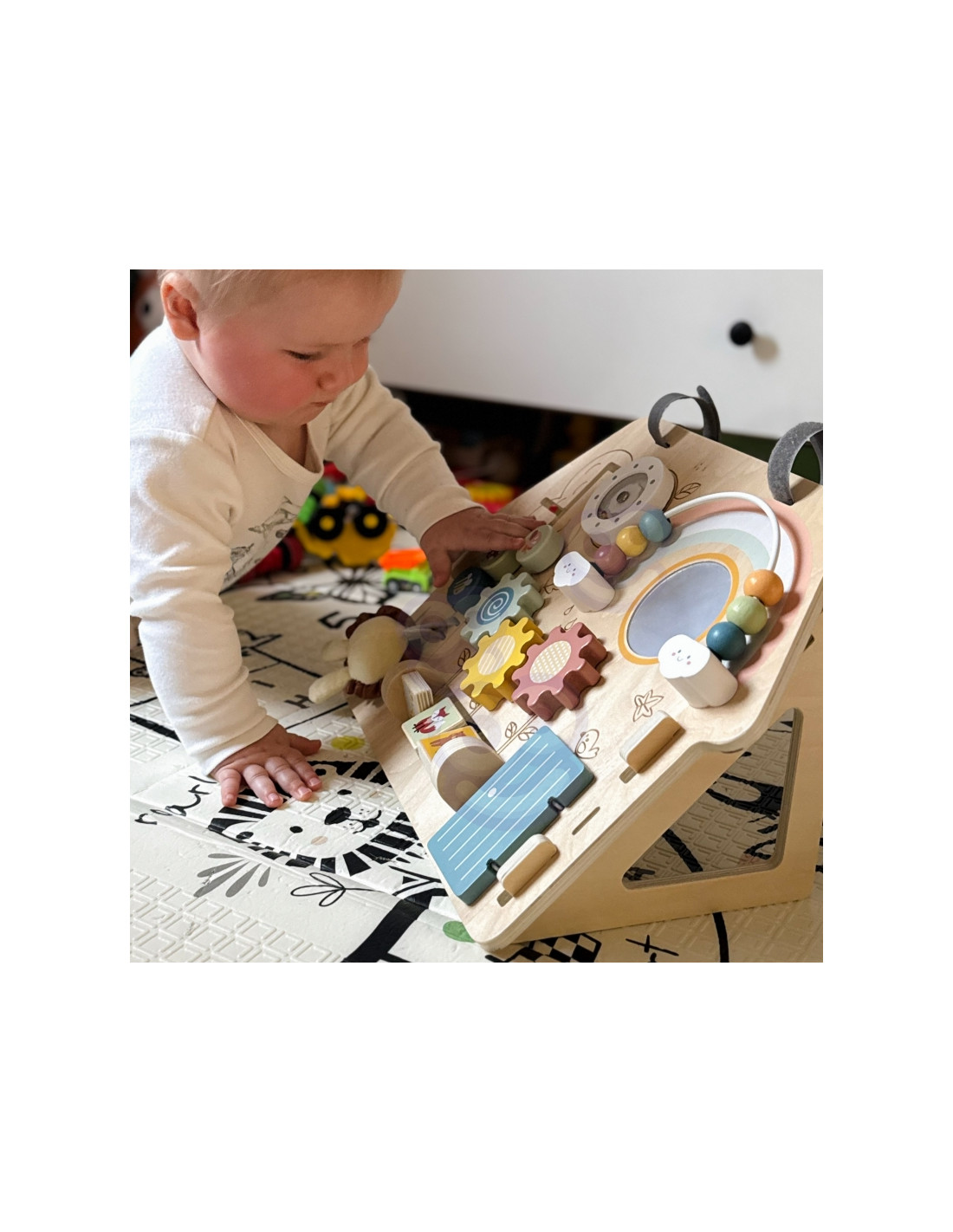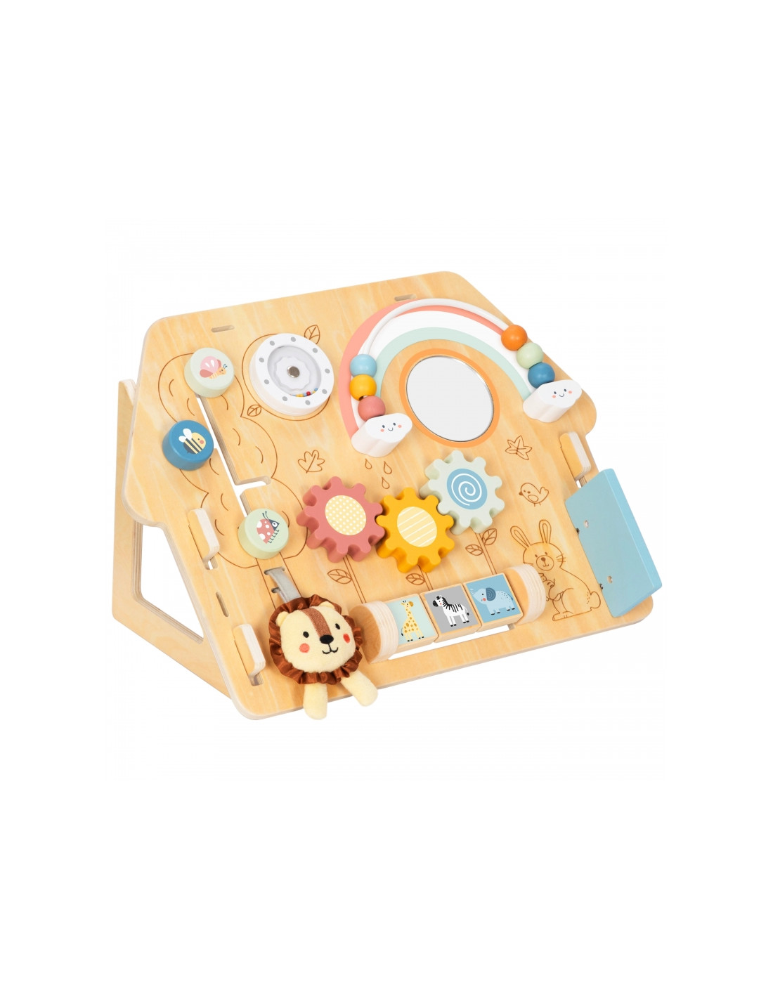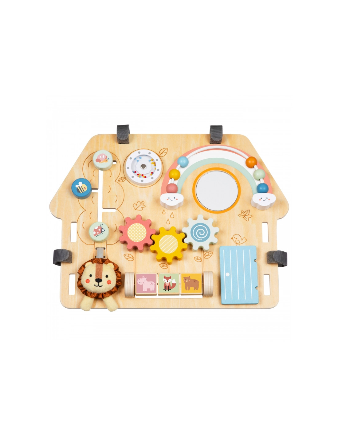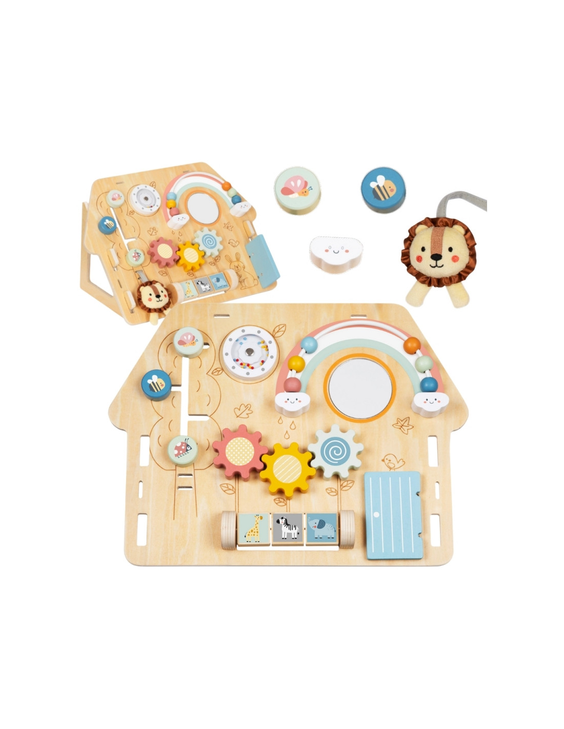 Эта деревянная игровая площадка в форме домика — идеальная игрушка для любознательных малышей. Разнообразные элементы развивают мелкую моторику и способствуют развитию сенсорных ощущений . Изготовлена из высококачественной древесины и безопасна для детей.