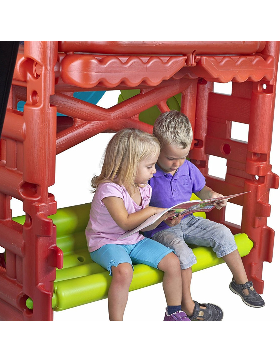 Детская площадка FEBER с горкой и деревянным домиком-столом.