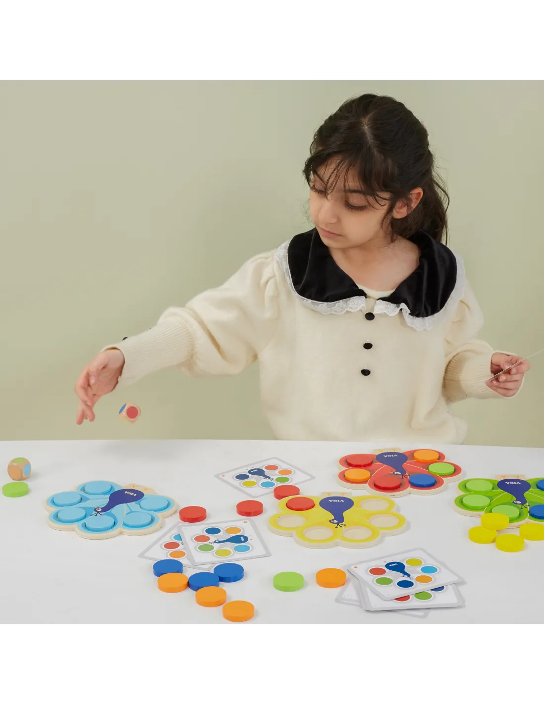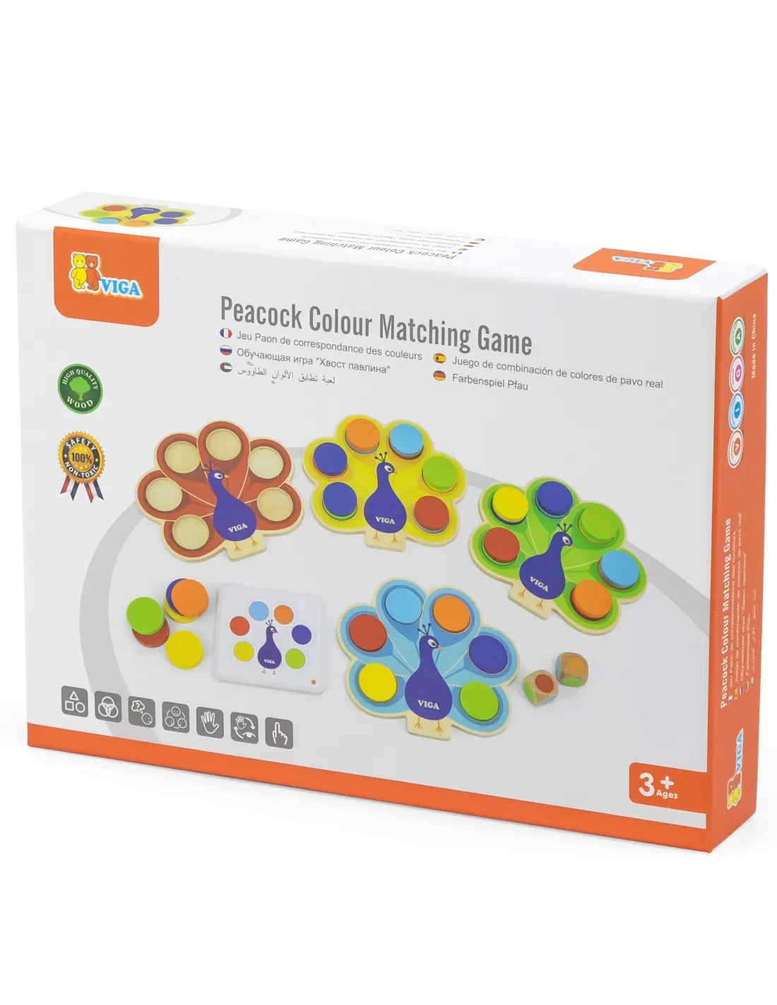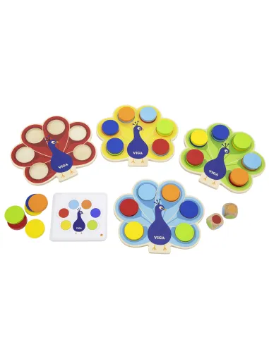 Игрушка «Подбери цвета — Павлиний хвост » от Viga предполагает размещение дисков в павлиньем хвосте в соответствии с инструкциями на прилагаемых карточках или заполнение отверстий цветными блоками в соответствии с результатами броска кубиков. Это занятие помогает детям изучать цвета , развивать мелкую моторику и координацию движений , сочетая игру и обучение в соответствии с методом Монтессори . Совместная игра — лучший способ развить воображение , которое так важно в этом возрасте, а также подготовить ребенка к будущему дошкольному образованию.