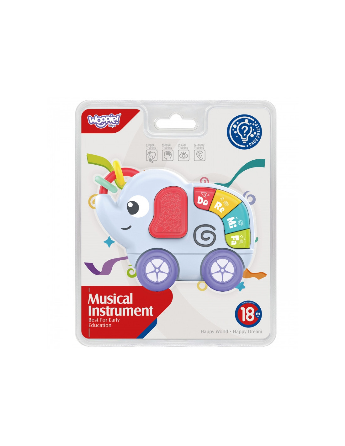 Интерактивный Слоненок от бренда Woopie для ежедневной игры и развития детей младшего возраста. У игрушки есть 2 подвижных колеса, которые ребенок может перемещать, 4 разноцветные клавиши при нажатии издают звуки музыкальных инструментов. У слона есть вращающиеся колеса, которые можно толкать и тянуть. Ухо и хобот слона с колесиками сделаны из мягкого пластика, поэтому игрушку можно использовать в качестве прорезывателя. Толкуя и тяня, малыш тренирует ловкость рук и двигательную координацию. Звуковые эффекты привлекут внимание любого ребенка.