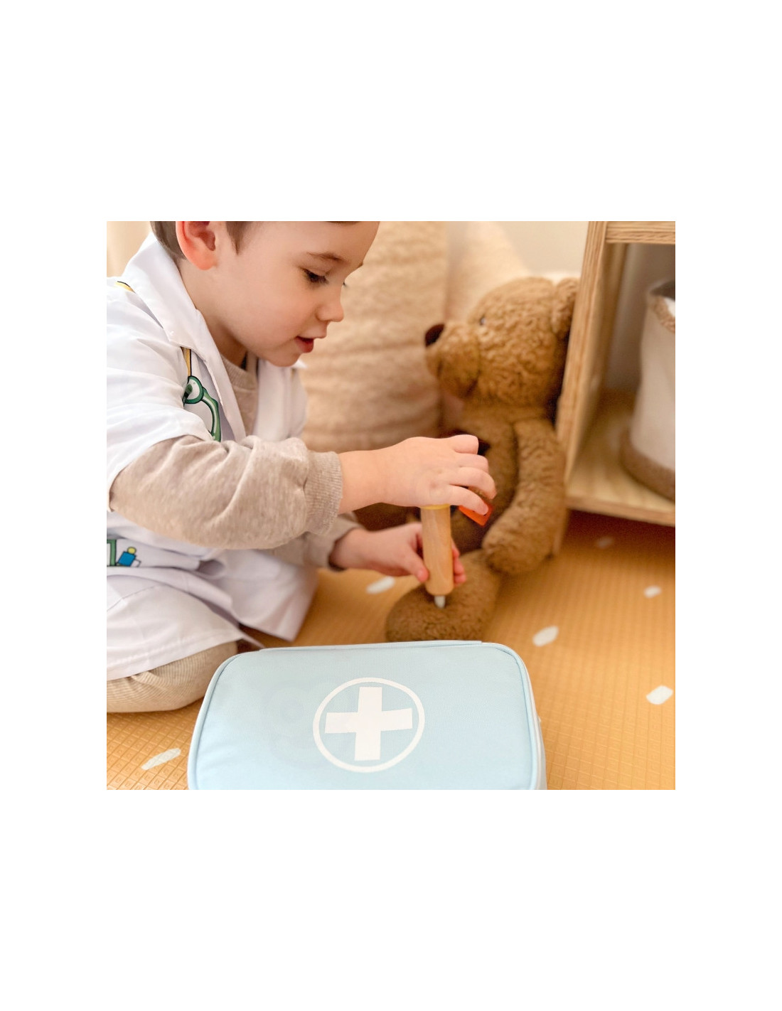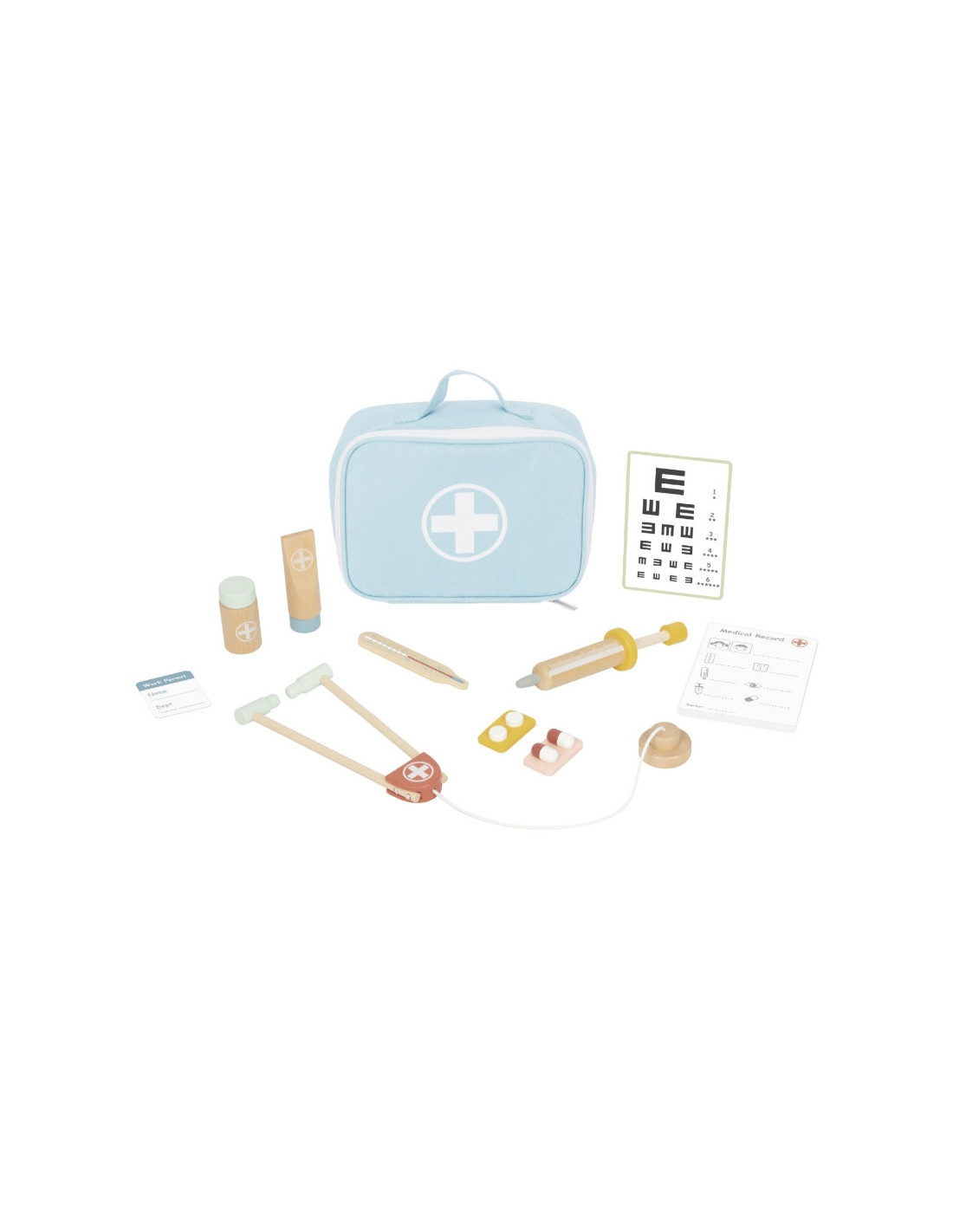 - Включает 11 предметов: тканевый футляр, стетоскоп, шприц, термометр, лекарства, тюбик с мазью, бутылочка с лекарством, медицинская карточка, карточка для проверки зрения и бейджик с именем врача.