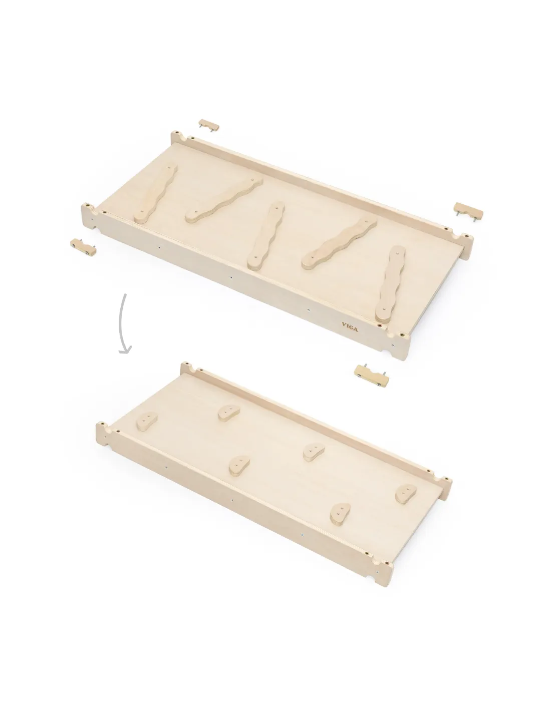 - Сторона с выступом: служит стенкой для скалолазания, облегчая подъем на более высокие элементы. Горка изготовлена из высококачественной буковой древесины и фанеры, что обеспечивает прочность и устойчивость.