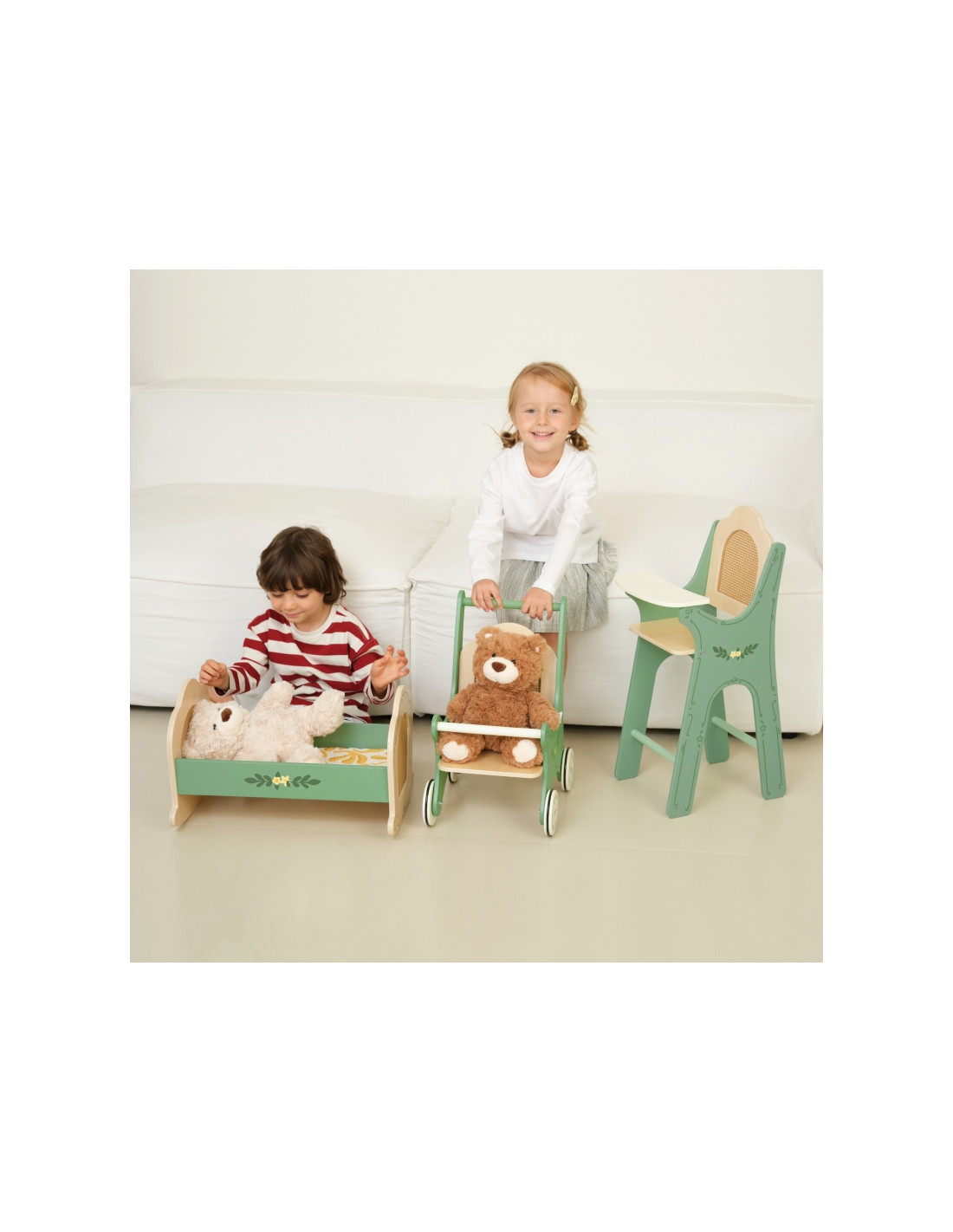 Эта очаровательная колыбель в зелёных тонах сочетает в себе непреходящее очарование винтажного стиля и естественную красоту ротангового плетения. Классические детали и приглушённые цвета делают её идеальным дополнением к любым детским играм, будь то игра в домик или уход за куклами или плюшевыми мишками. Изящные украшения добавят изюминку, а мягкое постельное бельё обеспечит вашей кукле комфортный сон.