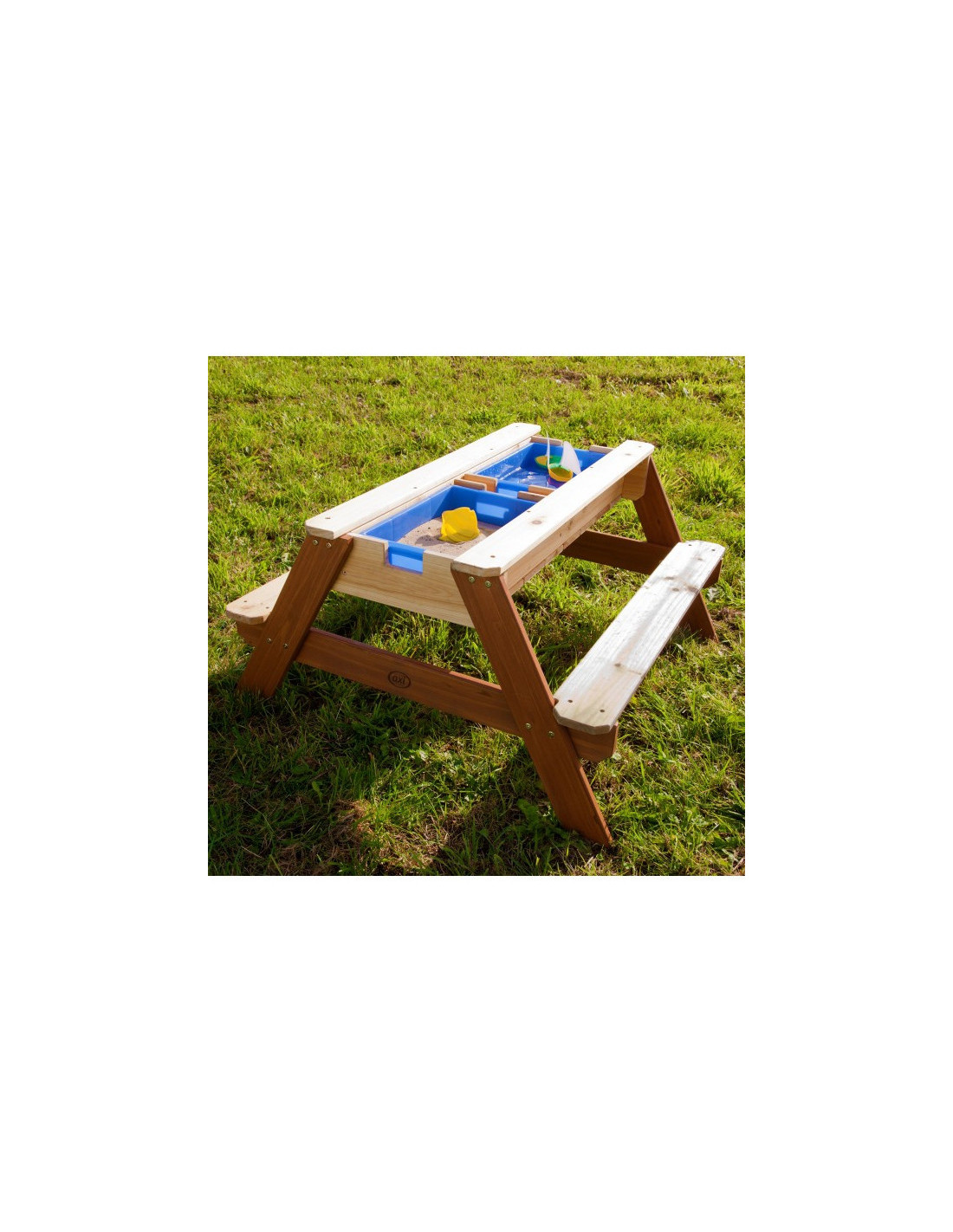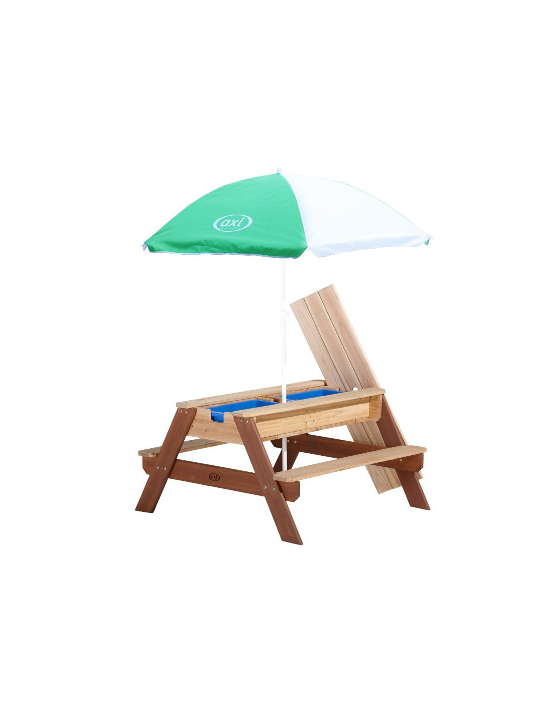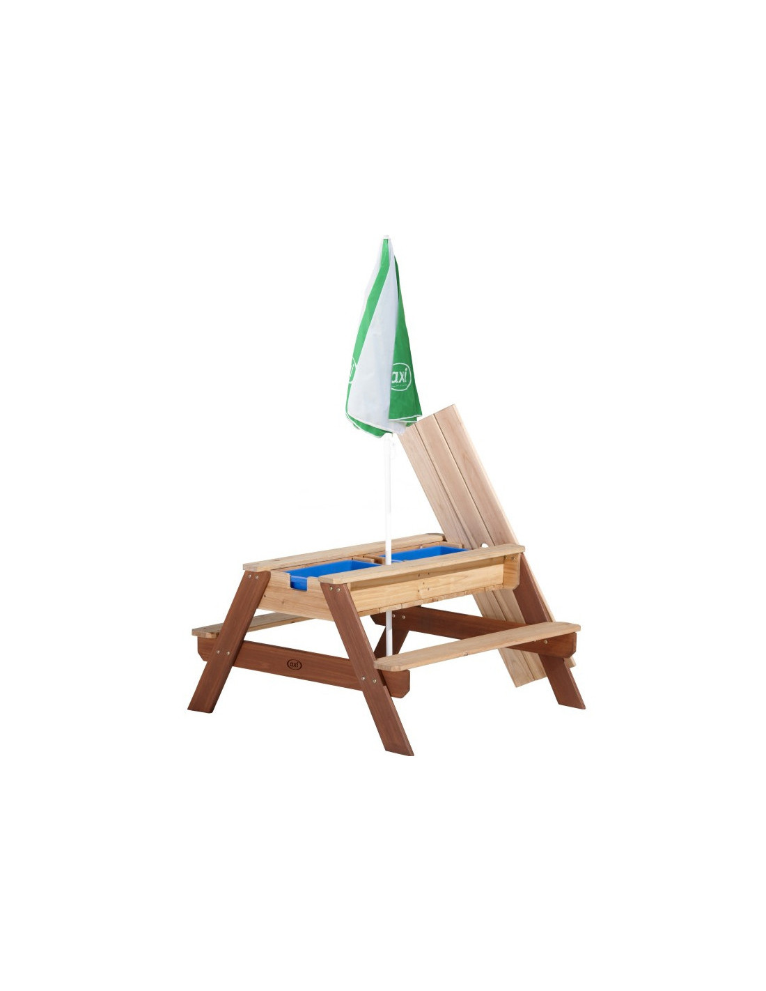 Стол для пикника Nick Picnic Table от известного бренда AXI — это многофункциональный стол с секретным отсеком, в котором под съёмной столешницей находятся два синих контейнера. Эти синие контейнеры можно наполнять песком и/или водой, а также использовать для хранения игрушек. Кроме того, контейнеры съёмные , что облегчает их чистку. Классическое сочетание песка и воды всегда нравится детям! В мгновение ока стол для игры с песком и водой превращается в стол для пикника, где дети могут творить, рисовать или наслаждаться угощениями.